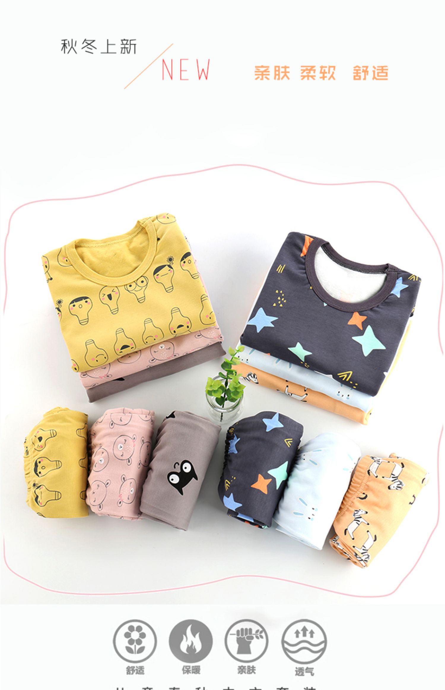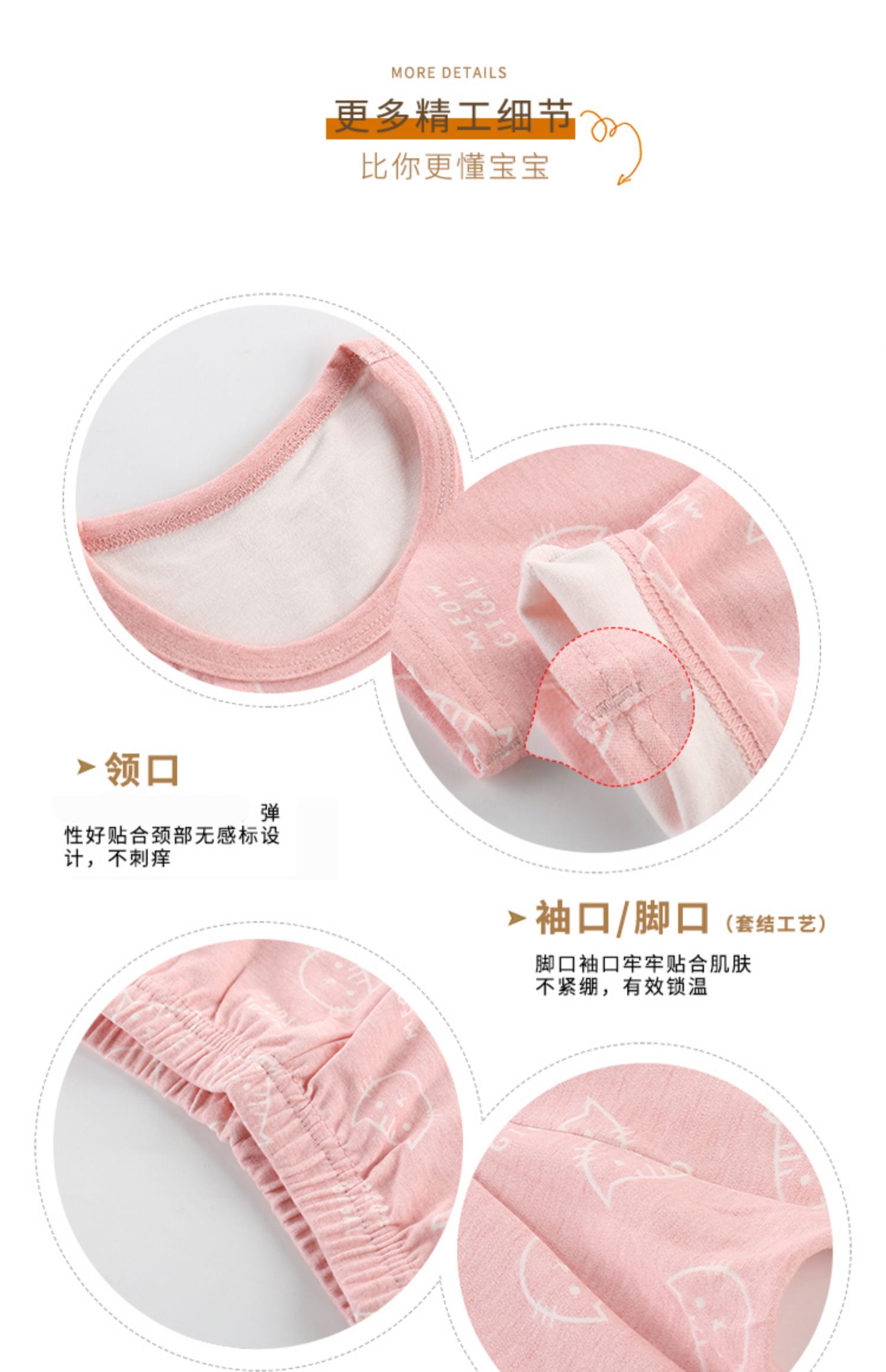 精选40支全棉面料,手感特别柔软舒适,宝宝穿上特别舒服;领口、袖口、裤腿都采用套结工艺,结实牢固,耐穿耐洗;一款穿了都不想再脱的内衣,还等什么呢,速速抢购。
