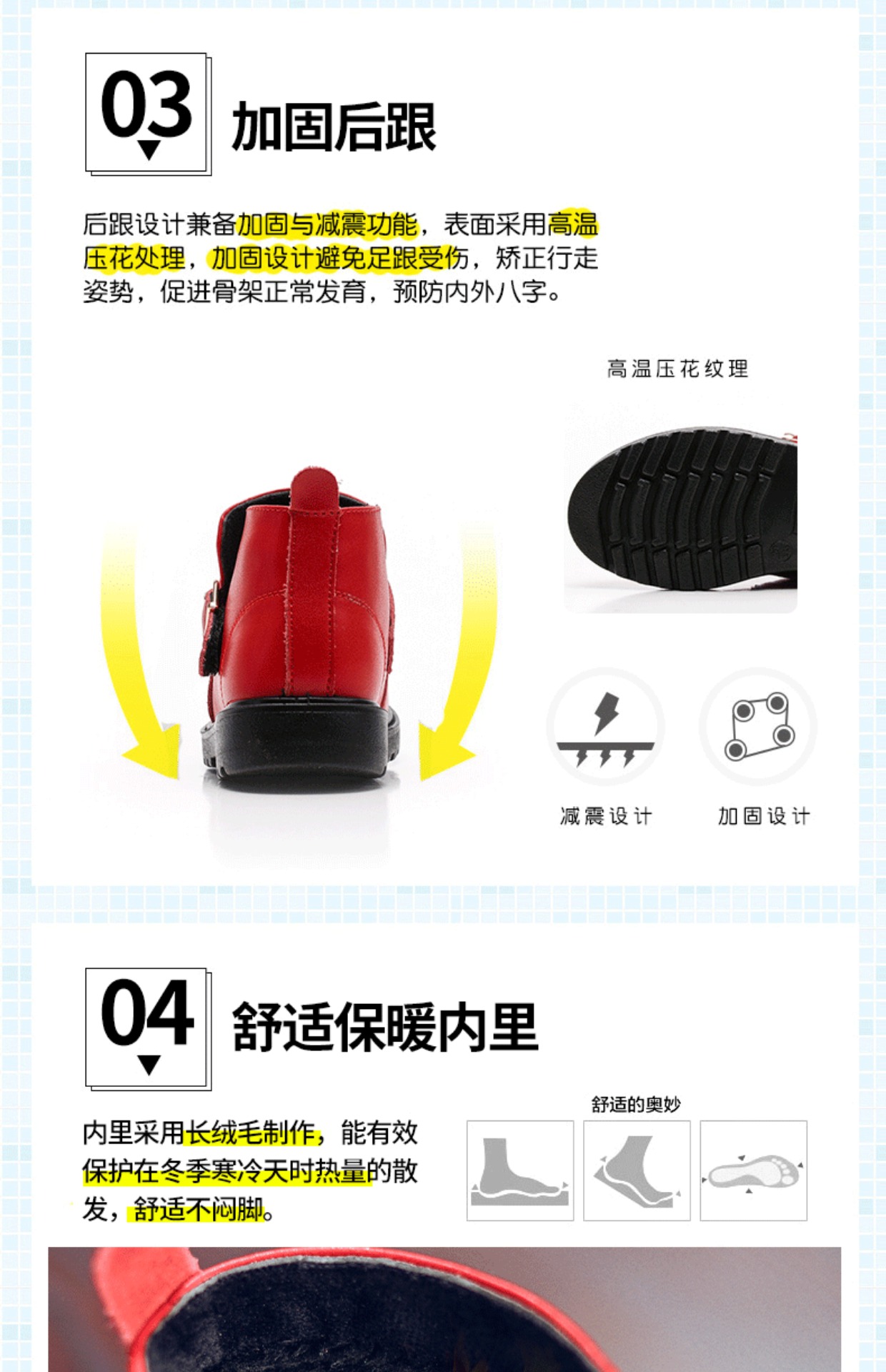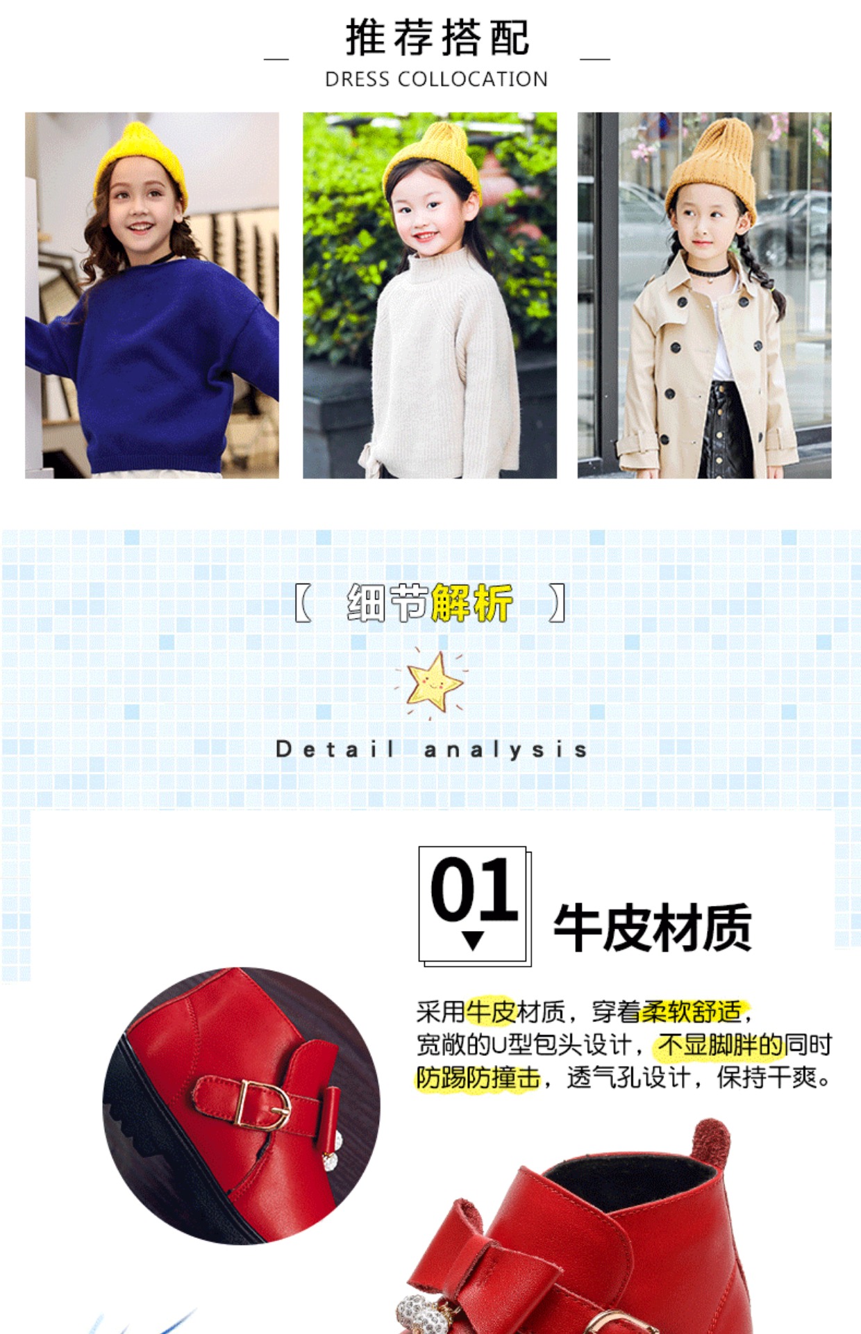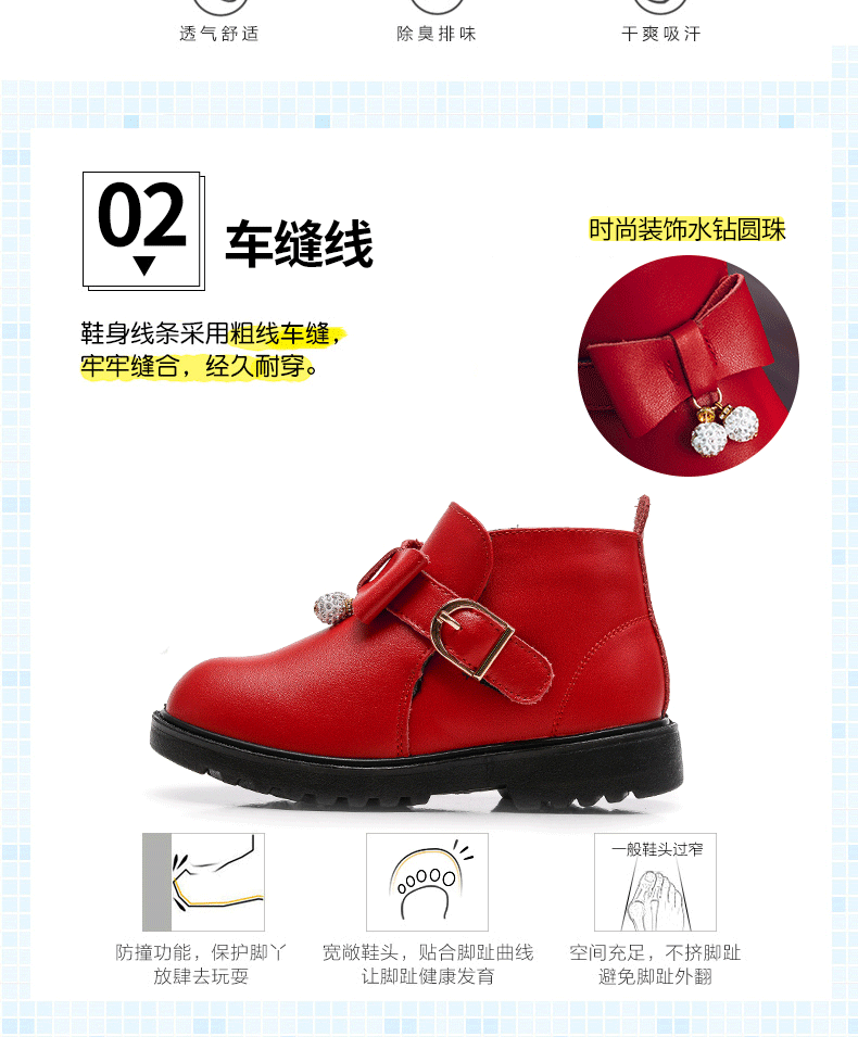 精选优质牛皮,穿着柔软舒适,包头设计,不显脚胖,防踢防撞击,透气孔设计,锁温的同时,也让宝宝保持干爽,这个冬天给宝宝zui好的爱。