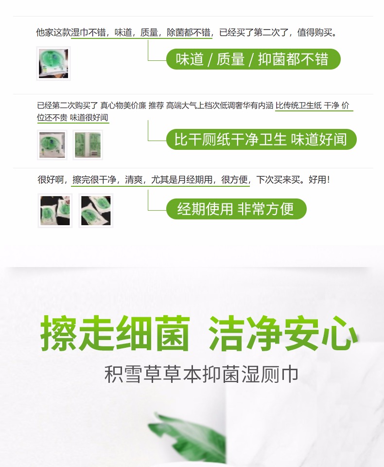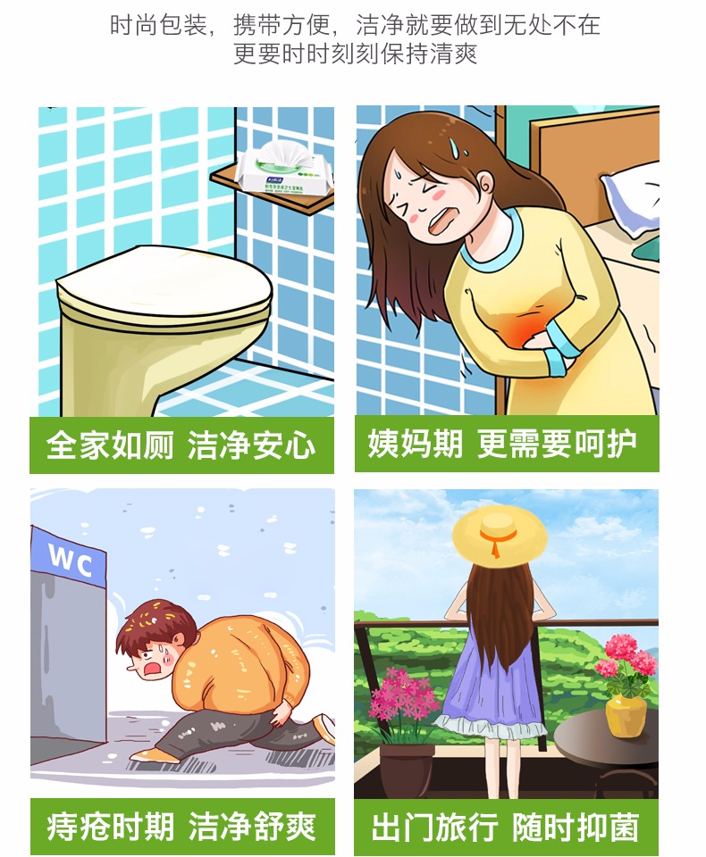 萃取草本精华,清洁抑菌,防粪口传播!私处抑菌去异味,呵护私处自然健康。温和不刺激,原生木浆,柔韧不易破,可水解,不易堵塞马桶。专业擦屁屁湿巾,杀菌消毒厕纸专用!