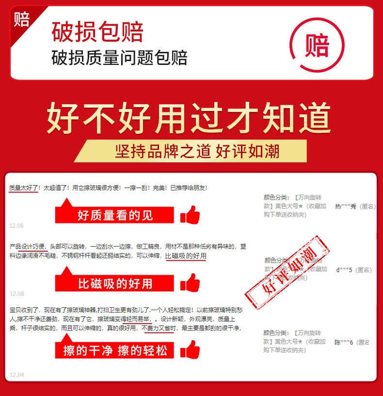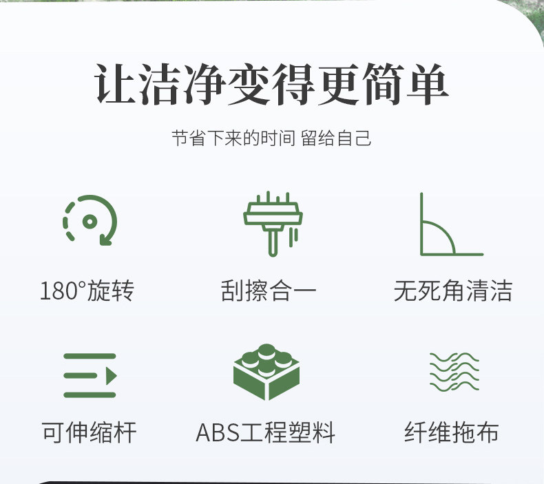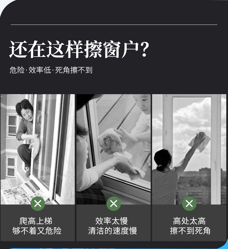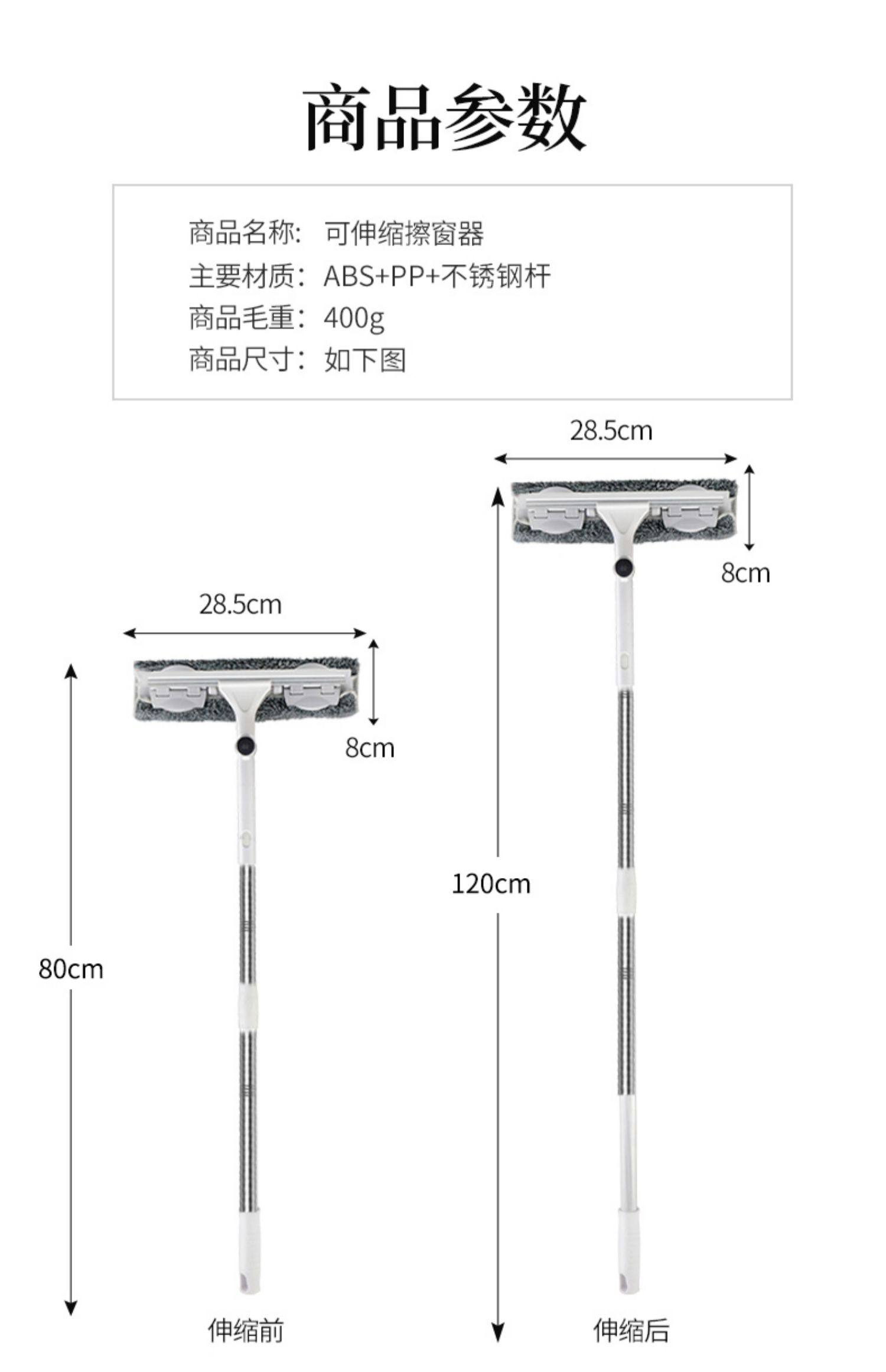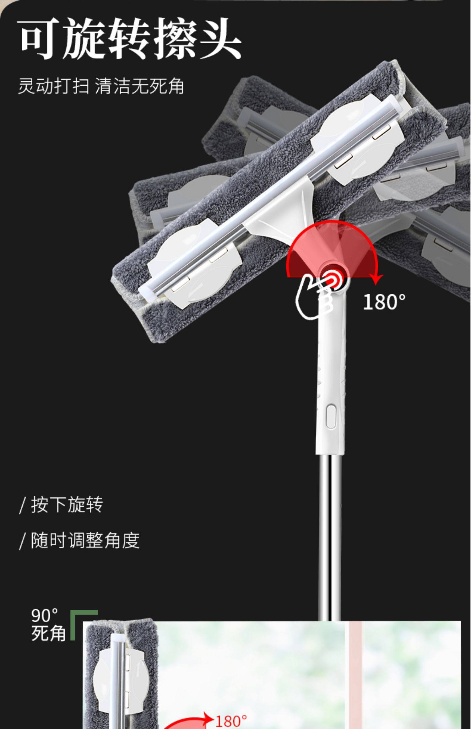 加长伸缩杆,万向旋转,擦窗更省力,刮擦合一,无死角清洁,ABS工程塑料,纤维拖布,一擦一刮,焕然一新。【破损包赔】