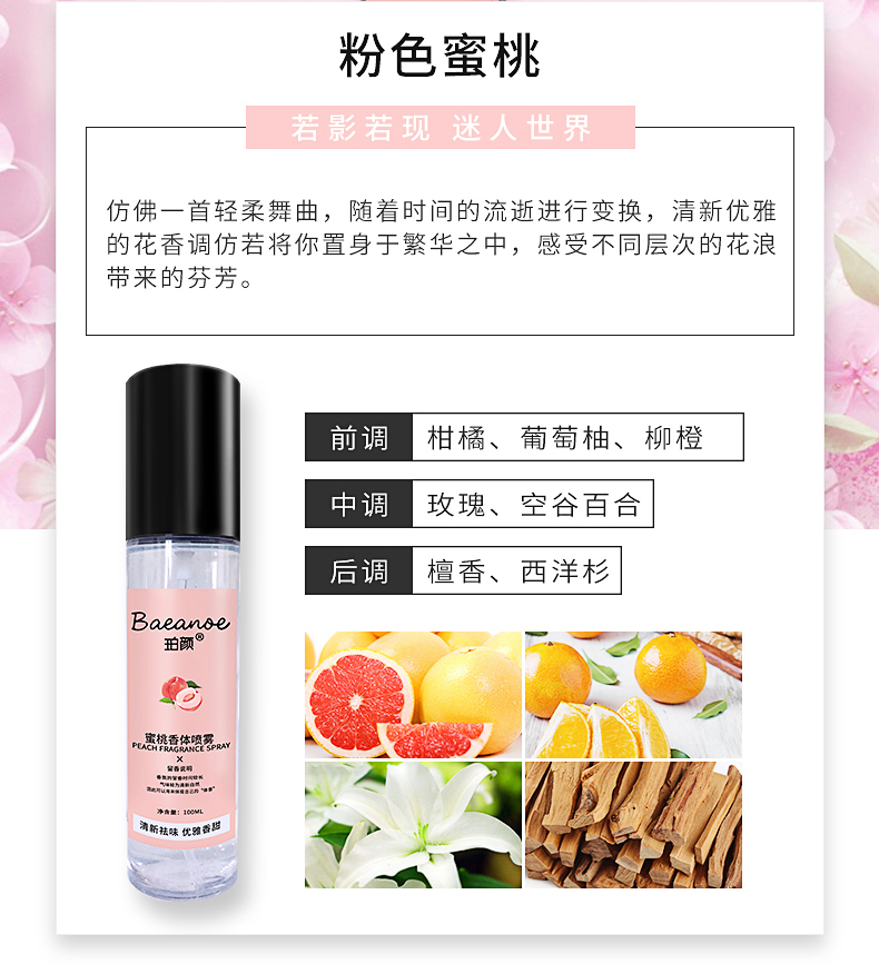香氛喷雾,祛除异味,100ml多种香型,持久留香,适合各种场合,手腕内侧,双耳后侧,腰部两侧颈部后侧,多种喷法,香气显著!