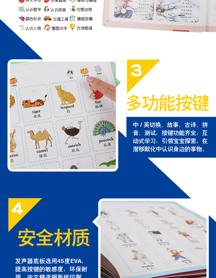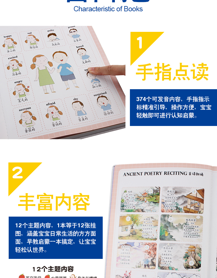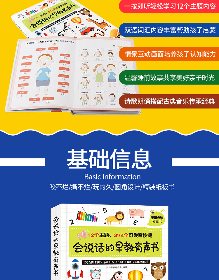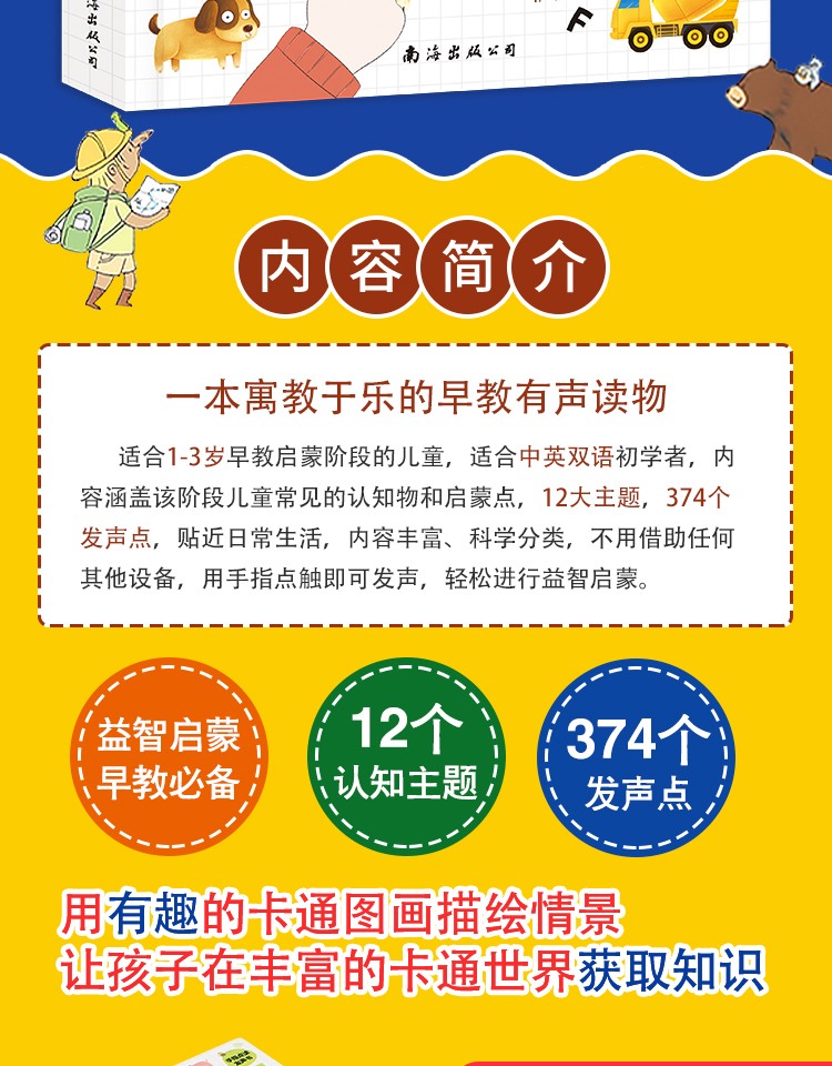 会说话的早教有声书,12个主题,374个可发音按键,一本寓教于乐的早教有声读物,用有趣的卡通图画描绘情景,让孩子在丰富卡通世界获取知识