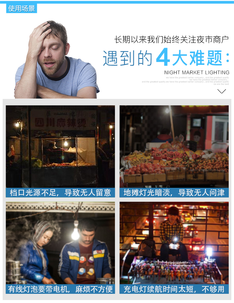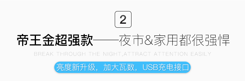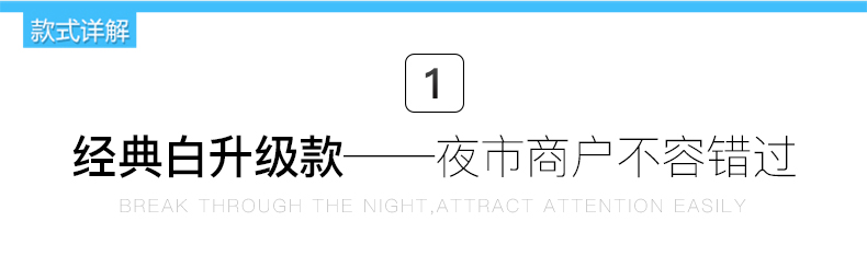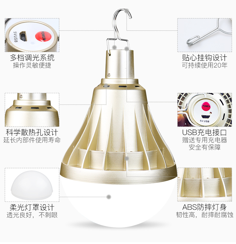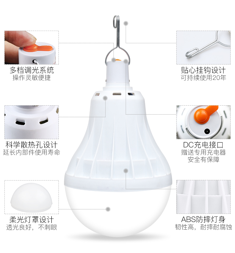ABS外壳,LED灯芯,透光性强,光照面广,三档调光,特有挂钩设计,小巧便携,安全耐用,夜市摆摊、露营应急,轻松解决没电的烦恼!送USB线