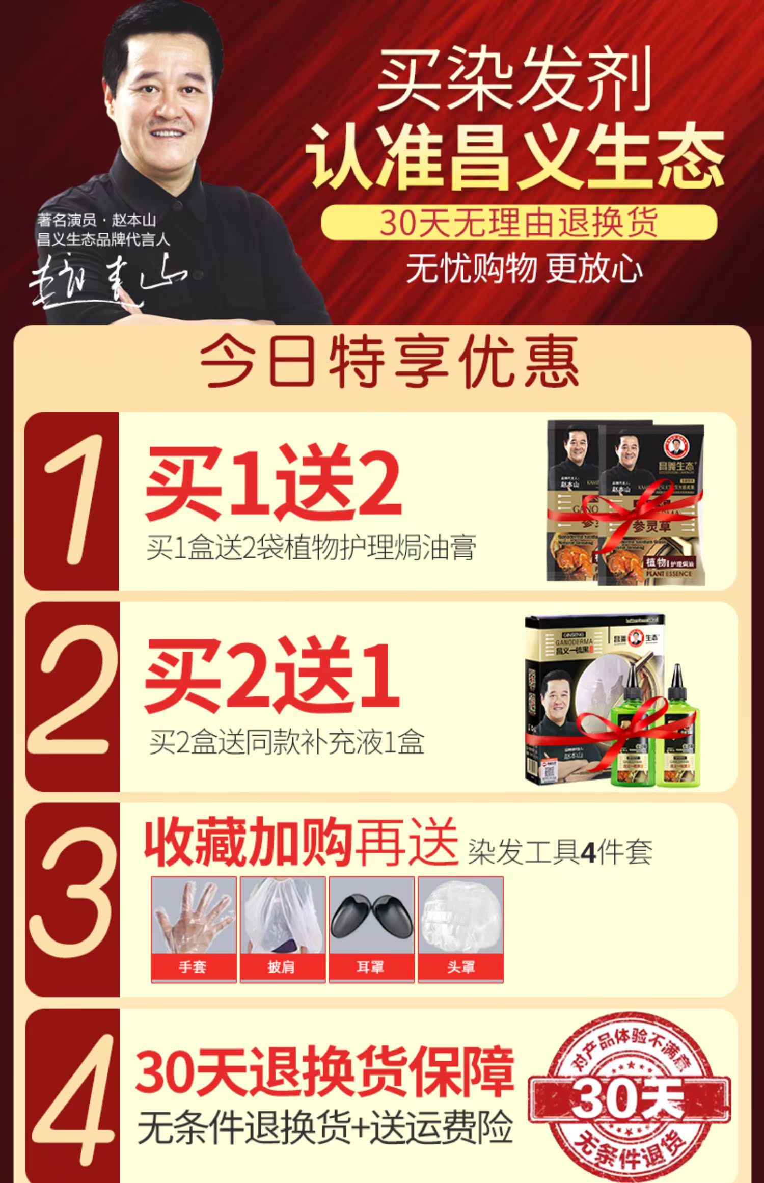 还为白发,黄发烦恼吗?快用热销130万盒,赵本山代言的,昌义一梳黑染发剂!萃取正宗6年根人参精华,一梳就黑,活动10元囤2瓶+染发梳,轻松告别白头,让头发柔顺乌黑!【赠运费险】
