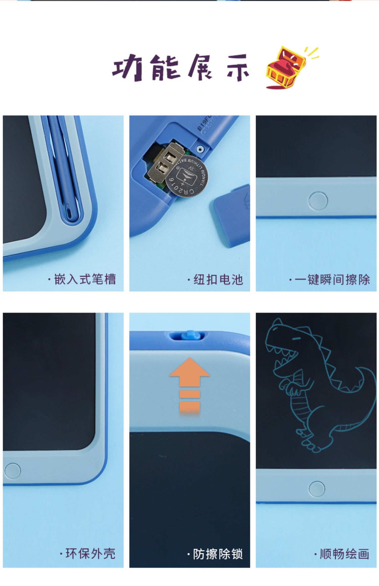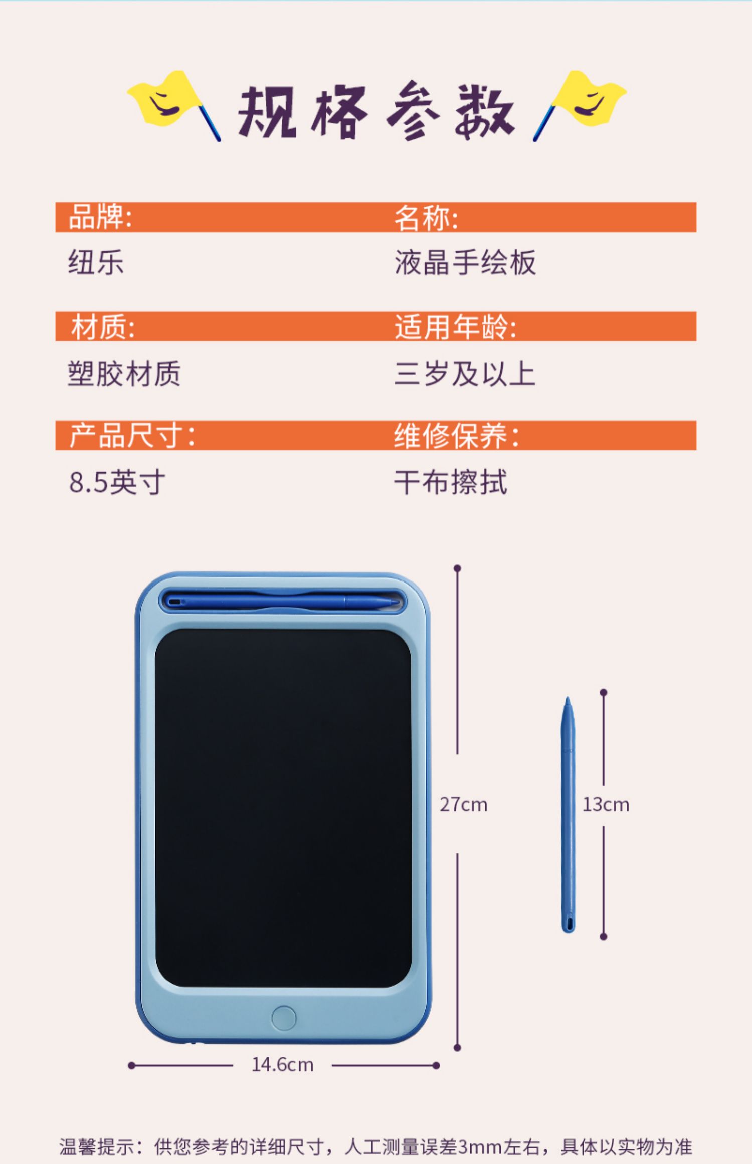【纽乐】儿童液晶手写板,高科技柔性屏,可根据绘画笔尖压力画出粗细不同的流畅线条,一键擦除更方便,一颗纽扣电池壳反复擦写,减少纸张使用率,手写笔防丢。