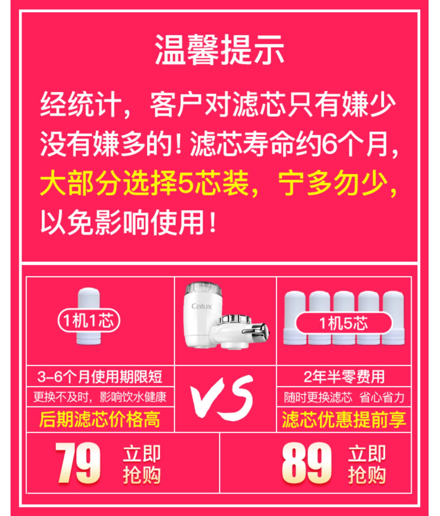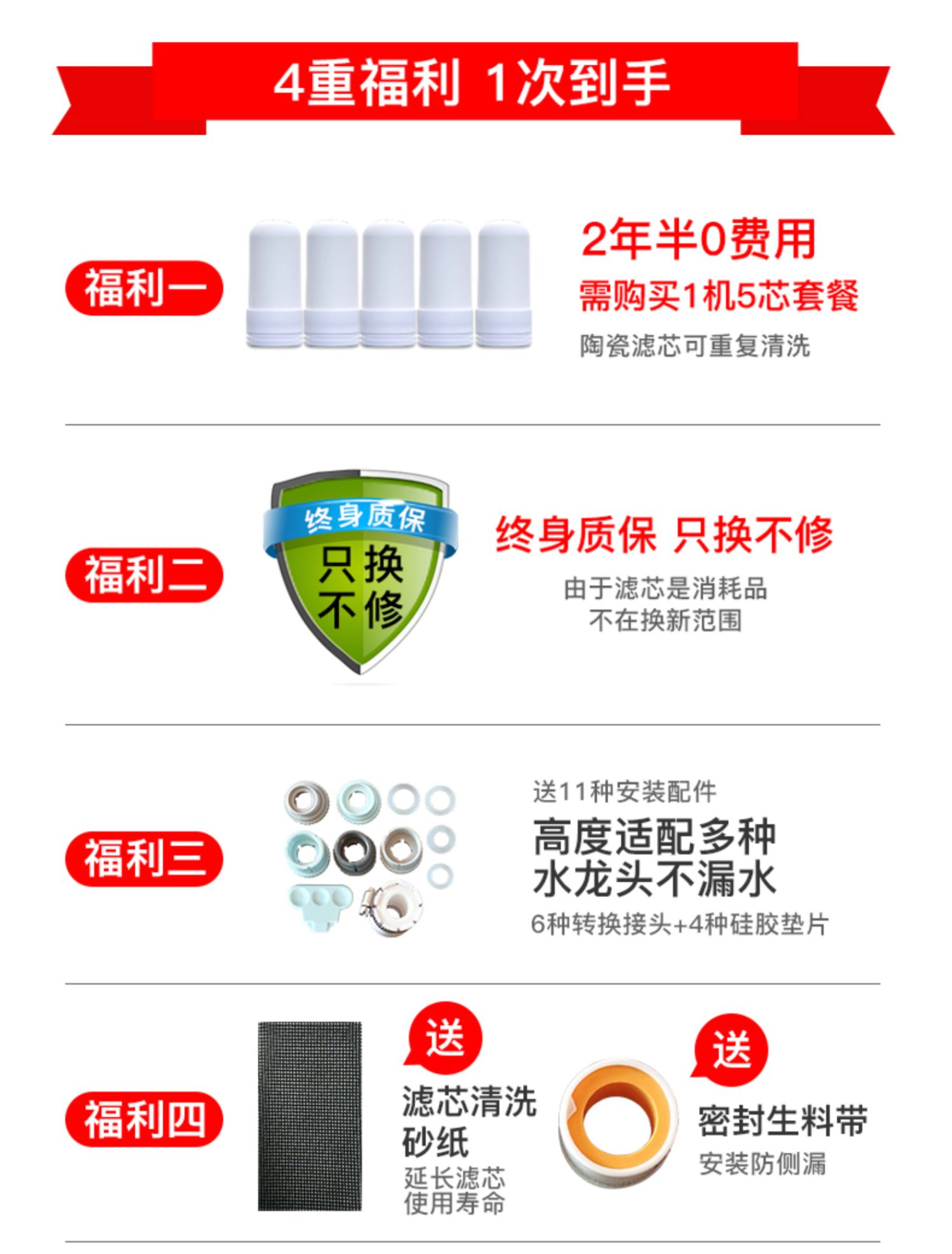 高效椰壳活性炭滤膜,强效除菌除氯,优惠套装,滤芯可清洗,五级复合过滤,不用电无废水,安装便捷,赶紧下手,捍卫您和家人的饮水健康吧!【赠运费险】