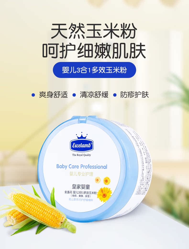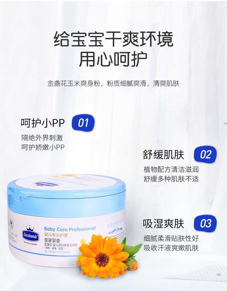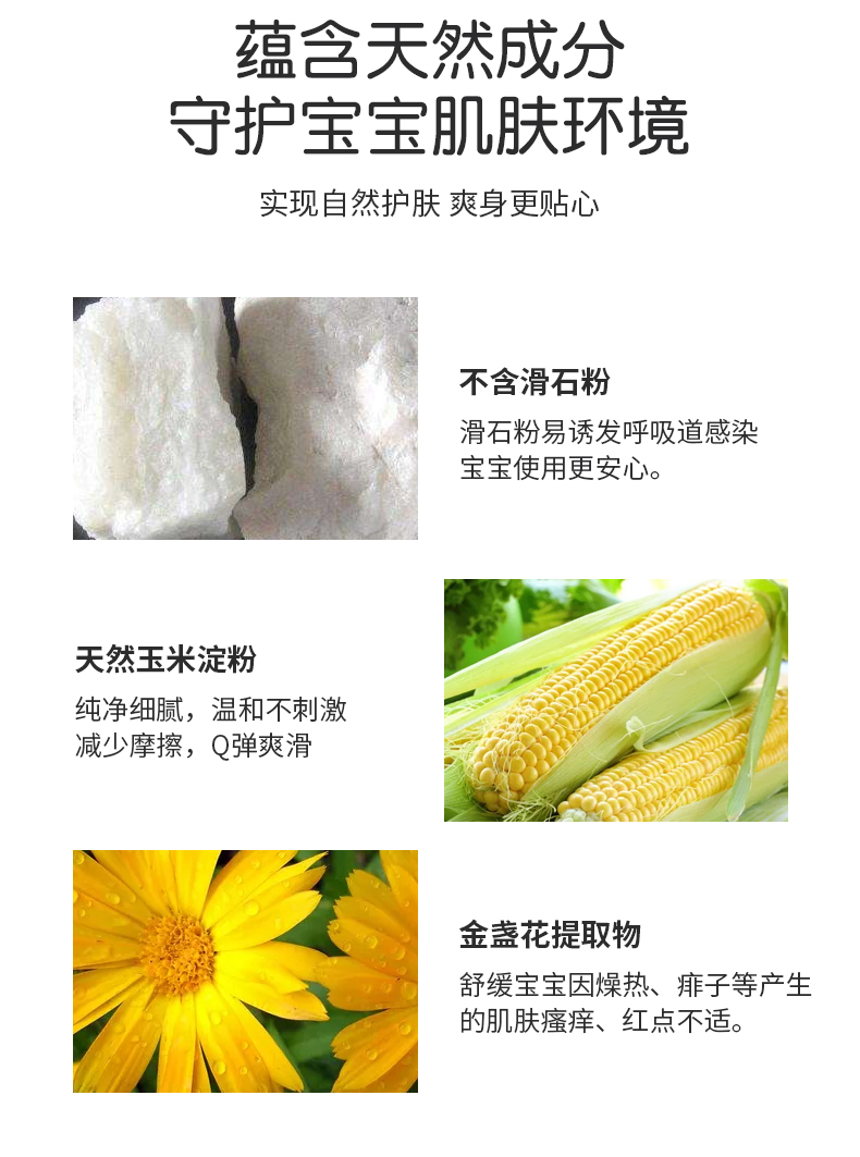 金盏花玉米爽身粉,拒绝滑石粉!植物配方清洁滋润,粉质细腻爽滑,时刻干爽舒适,远离红PP,呵护宝宝娇嫩肌肤~宝妈奶爸放心抢!