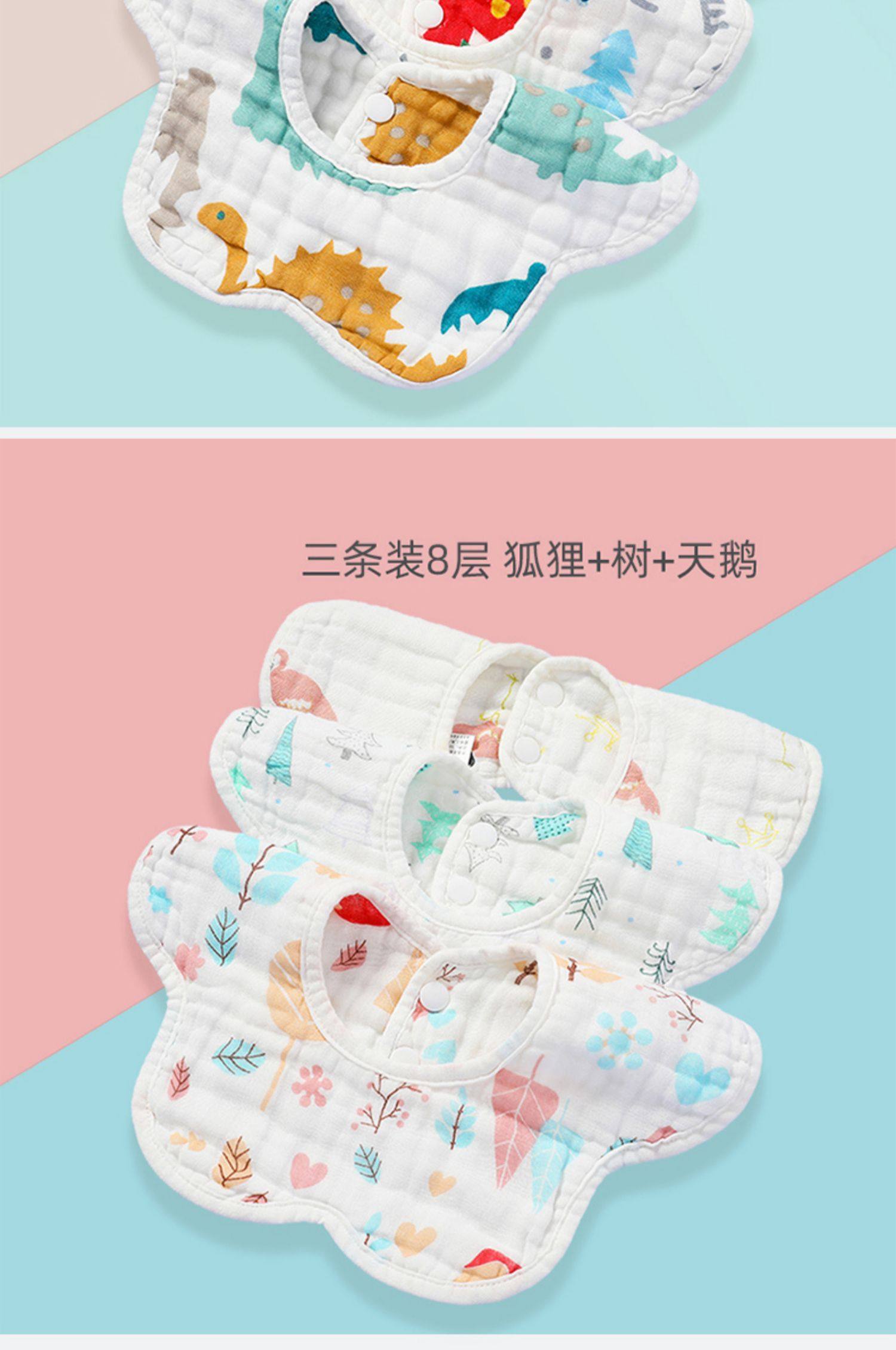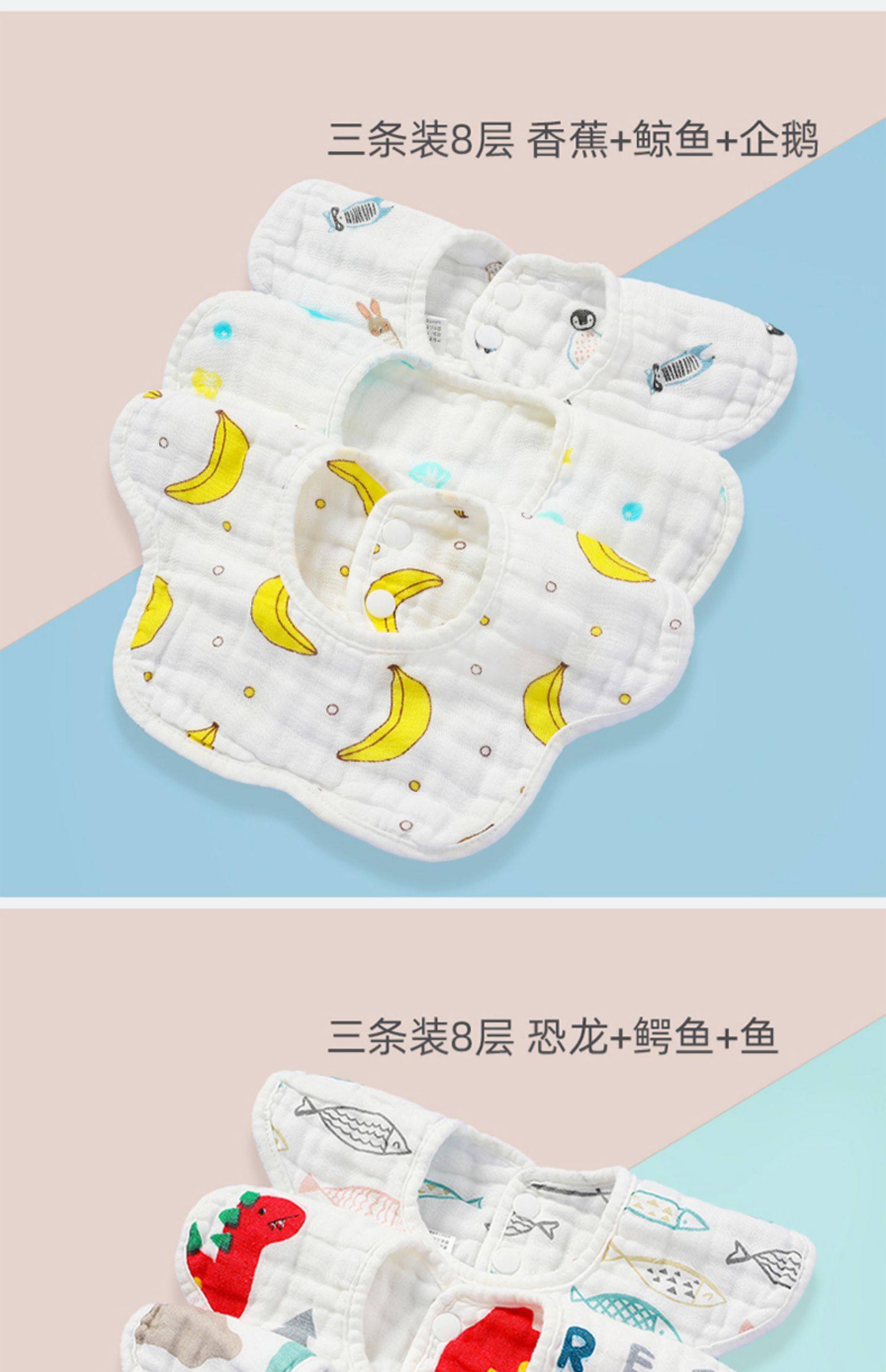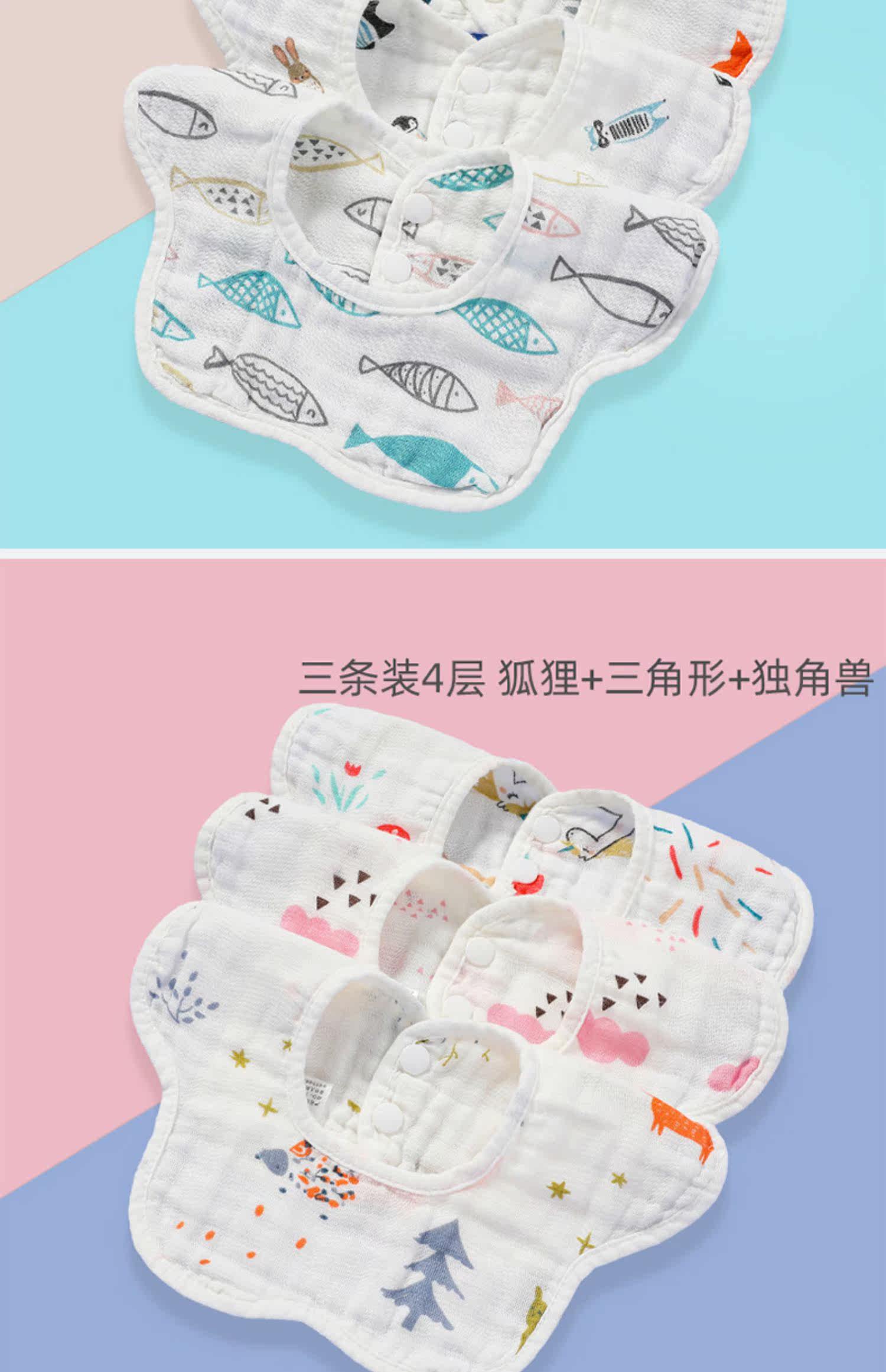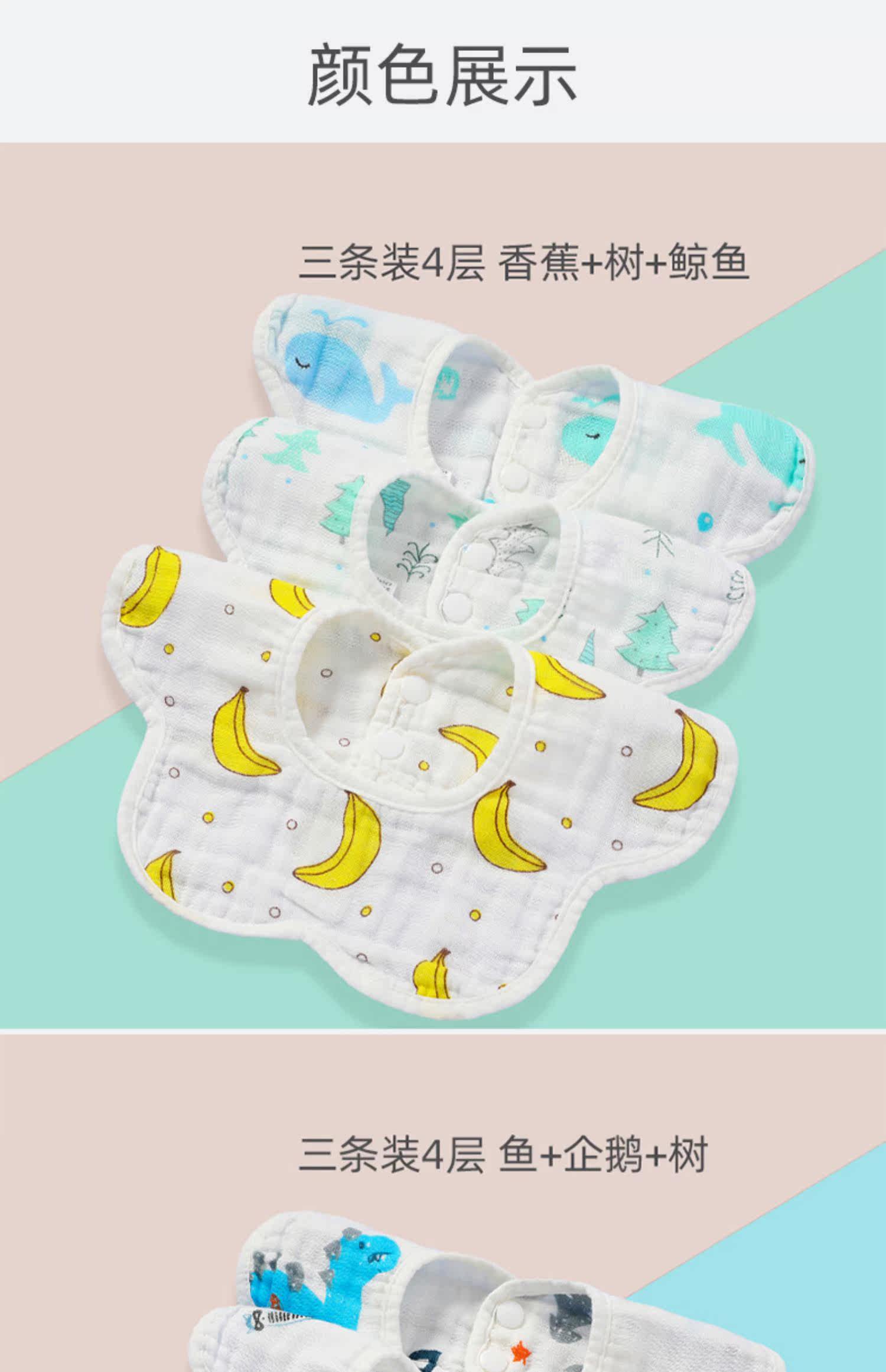 超低价,三条装,柔软,瞬吸,360°围嘴,0荧光剂,4层棉纱更吸水,耐洗,吸水力强,瞬间吸收,零荧光剂,给宝宝好的。不要错过。