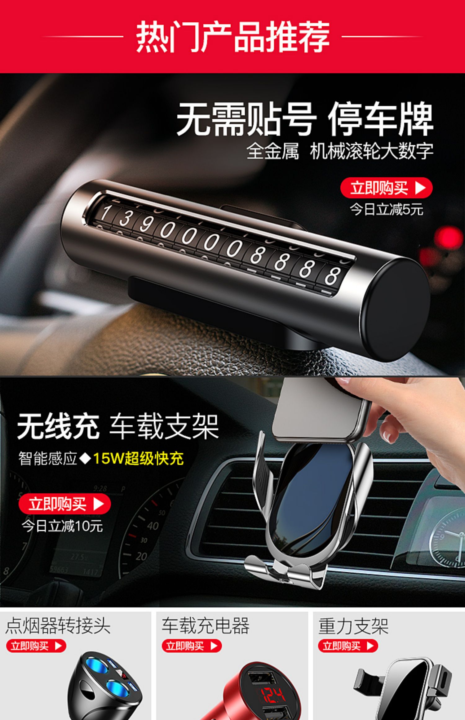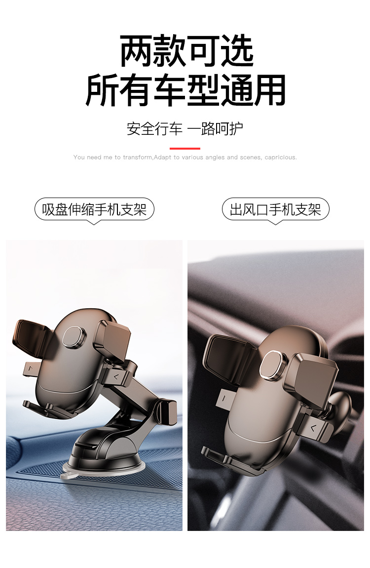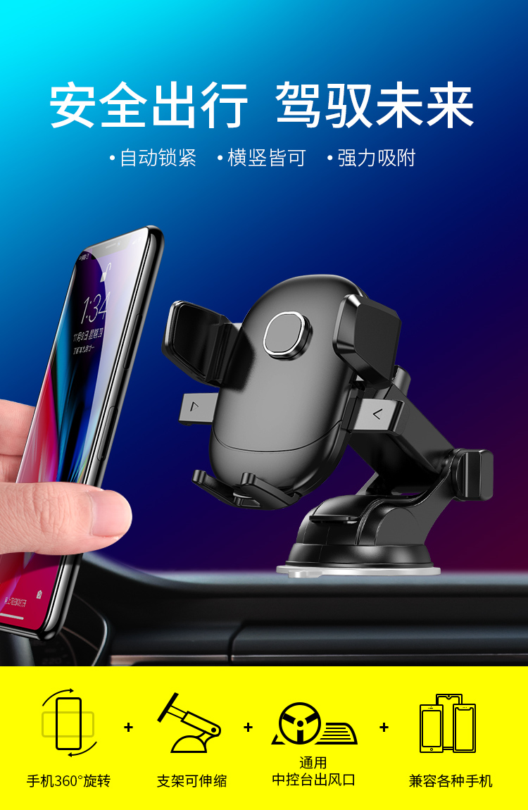 360°可旋转,防滑硅胶,适配任何车型和机型,解放双手安全出行~通用多功能车载手机支架,吸盘式稳固加倍,重力联动,一放夹紧。