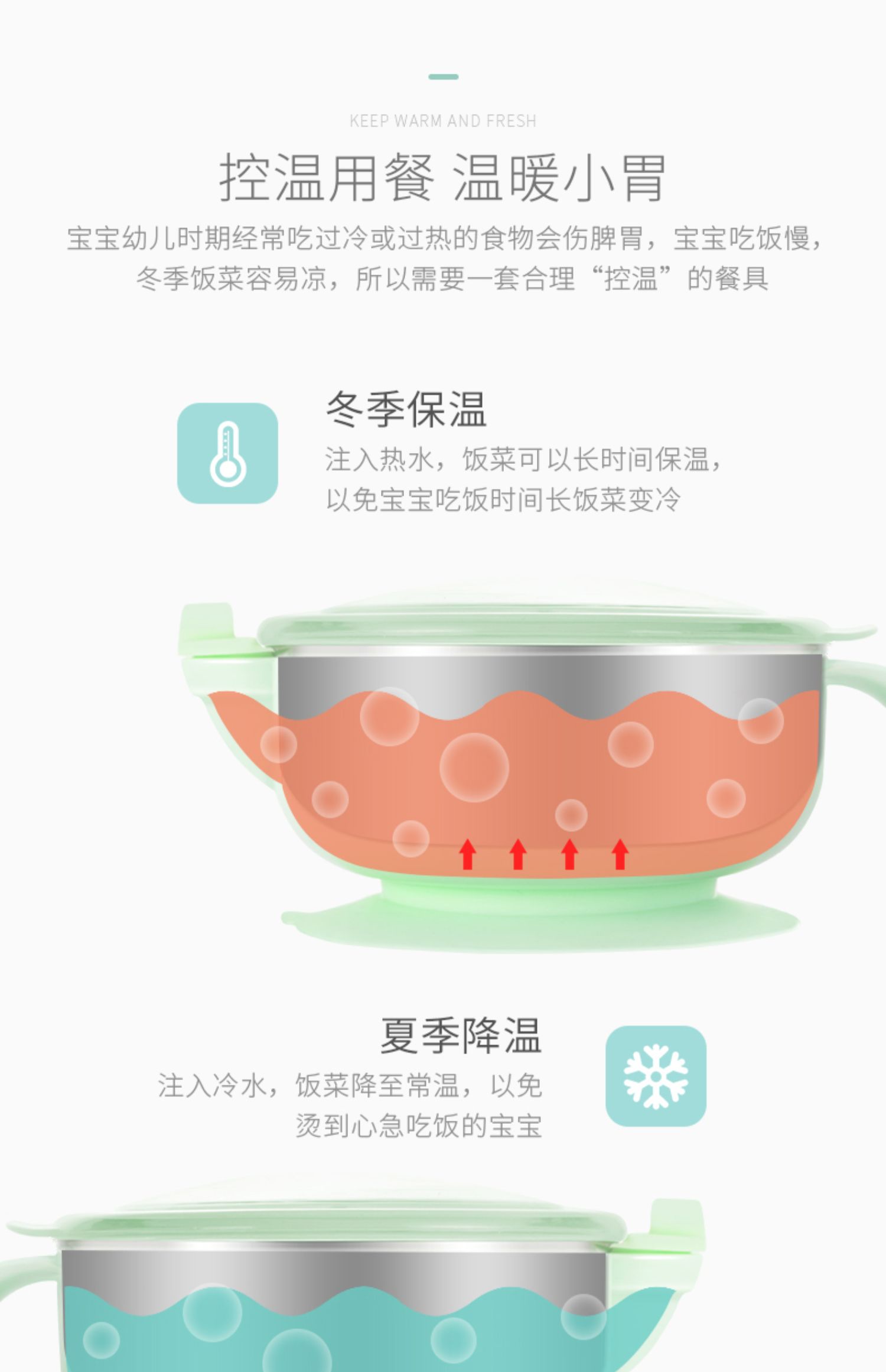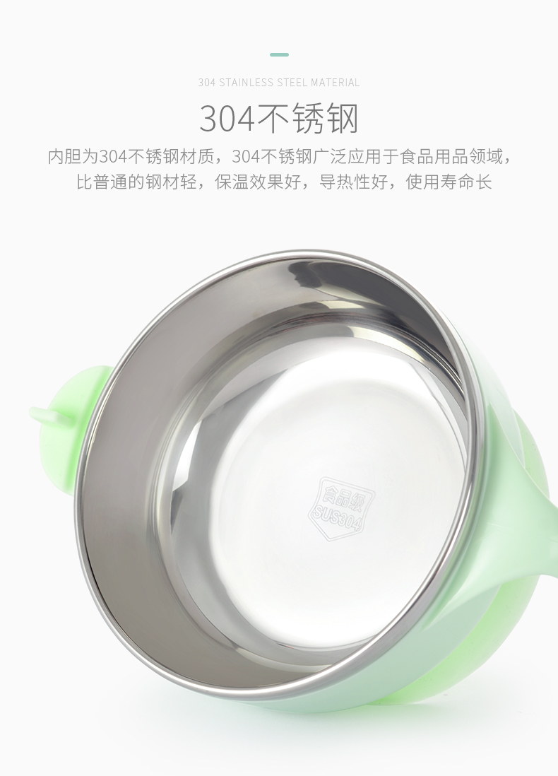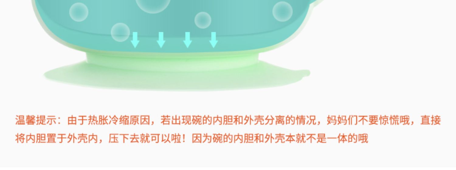 食品级加厚PP碗套、304不锈钢材质,安全健康,不锈钢包边,防漏水,硅胶吸盘,不易打翻,注水控温,冬季长效保温,夏季快速降温,贴心呵护宝宝肠胃健康~