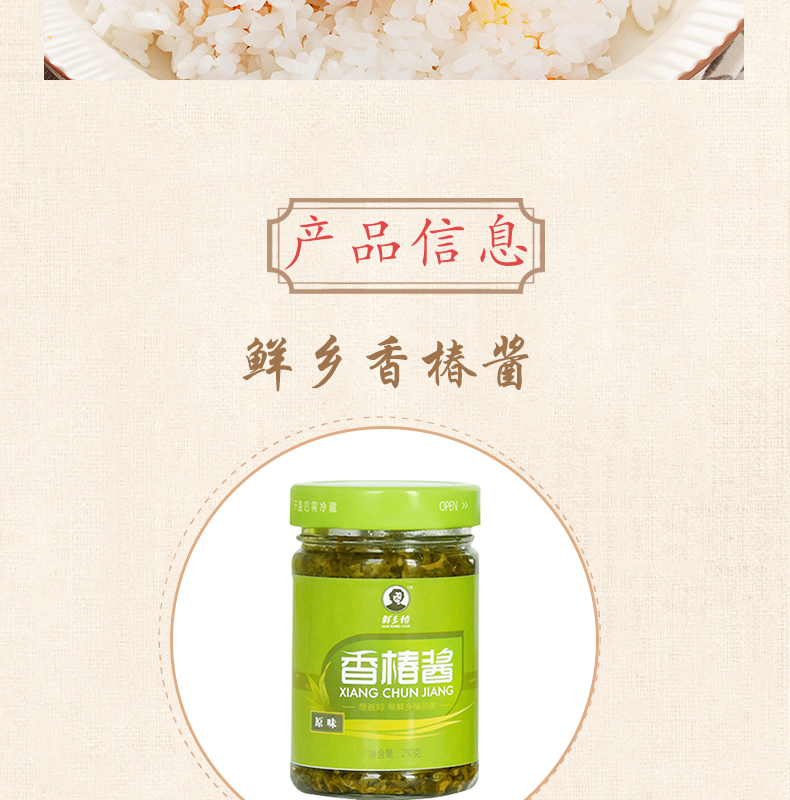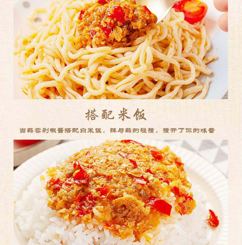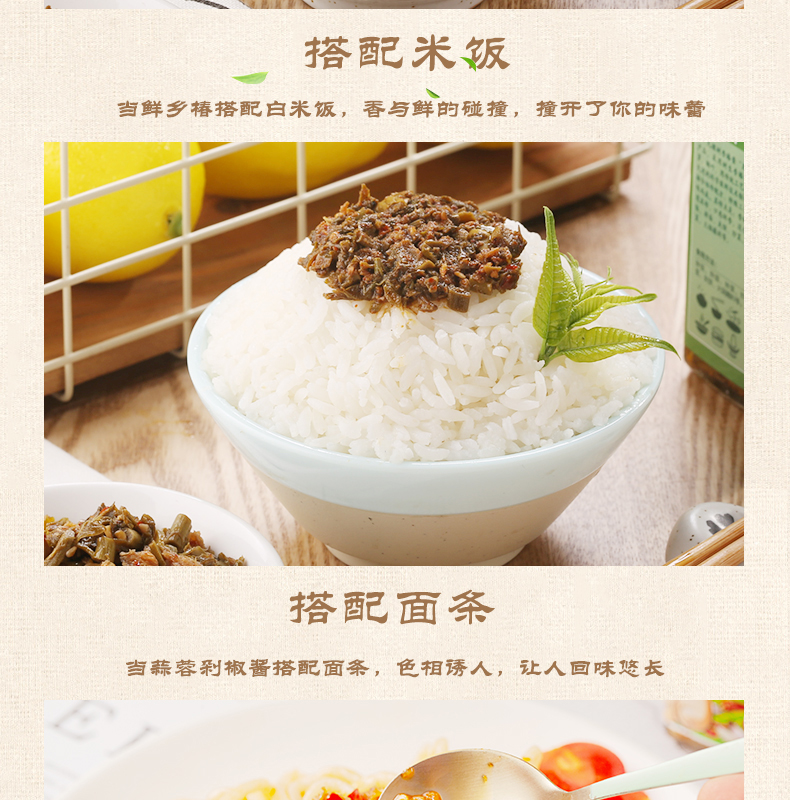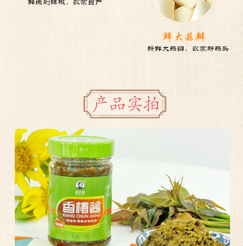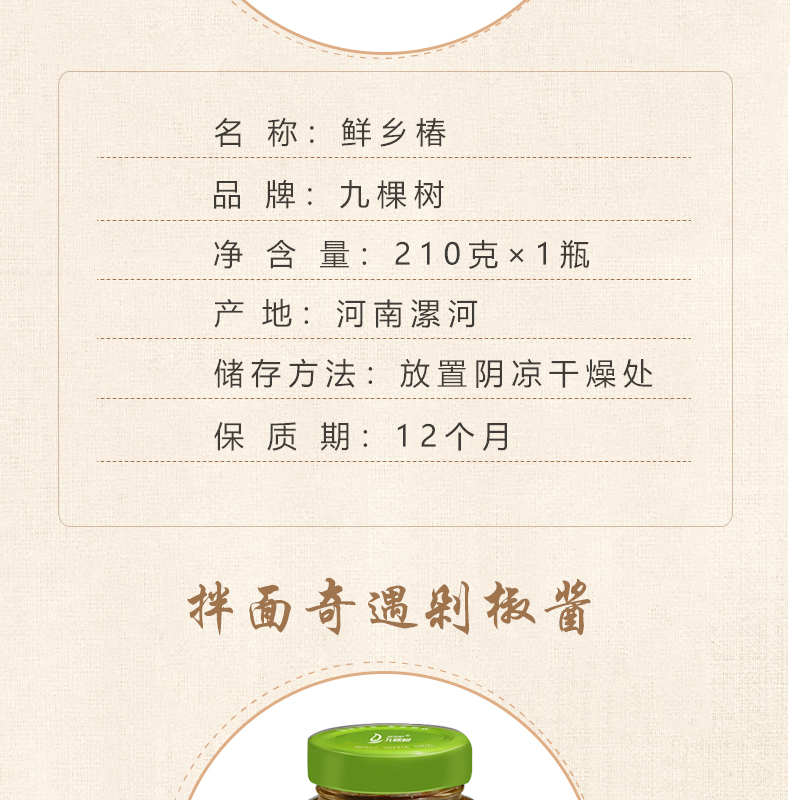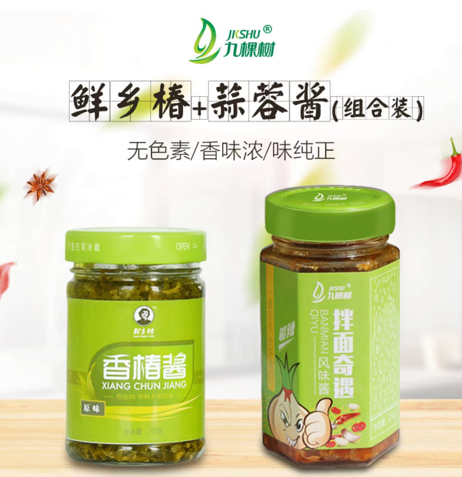 九棵树河南特产下饭酱香椿酱蒜蓉小米椒剁椒拌面拌饭酱210gx2组合,香椿酱210gx1瓶+蒜蓉酱210gx1瓶,正品保证。