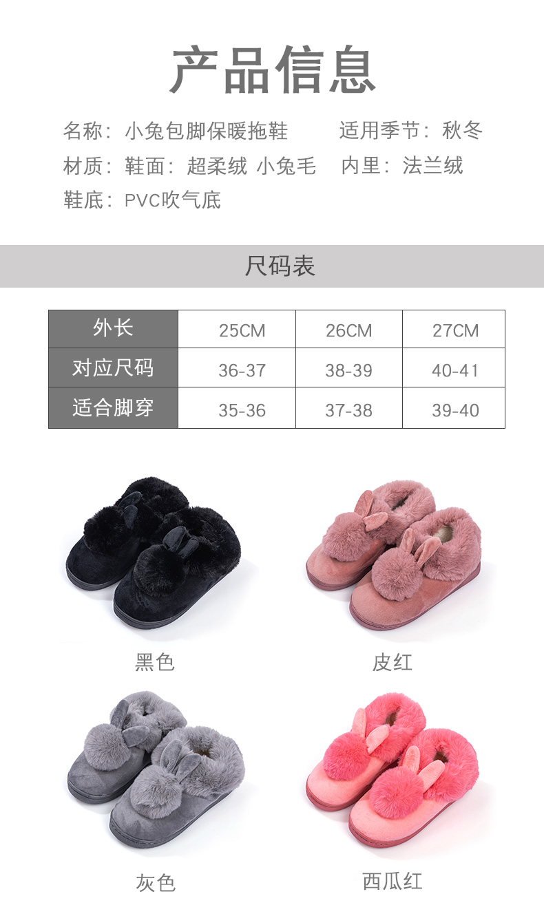 超级保暖棉拖鞋,法兰绒内里,加厚保暖,包跟防滑,全方位带来温暖,手工车线,牢固耐用,细腻小兔毛,柔软舒适,鞋身柔软有弹性不变形,造型可爱,多种款式可选。