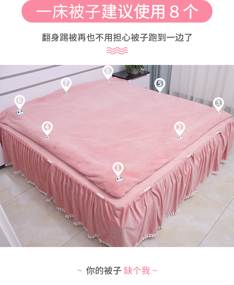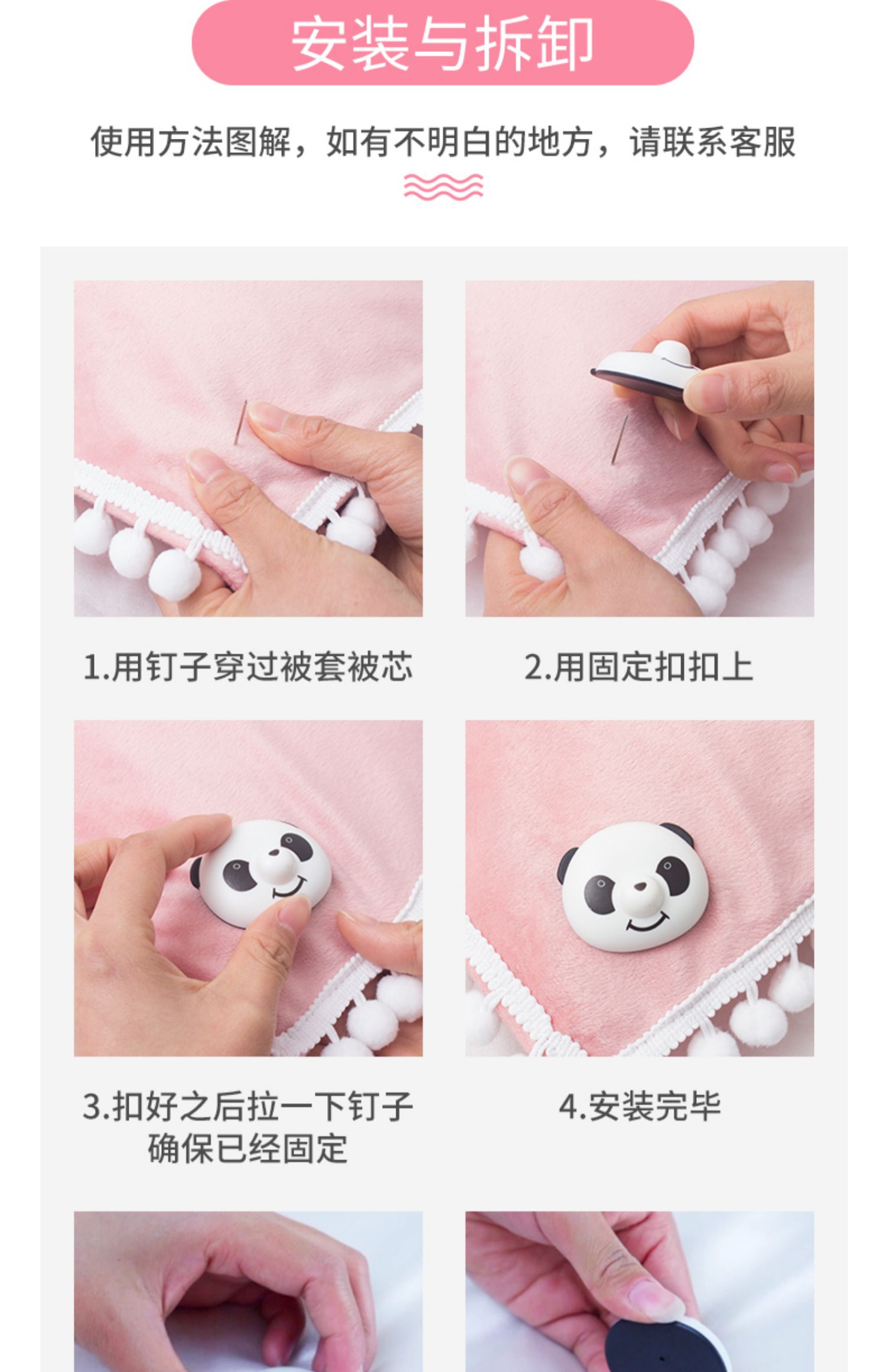 免解扣器版【8个熊猫扣+8个长钉+8个短钉】被单和棉被经常跑偏揉成一团了?容易着凉感冒?熊猫被子固定器来帮你!扭一扭钉一钉,这被子一辈子都跑不掉啦,让你每天睡个好觉~