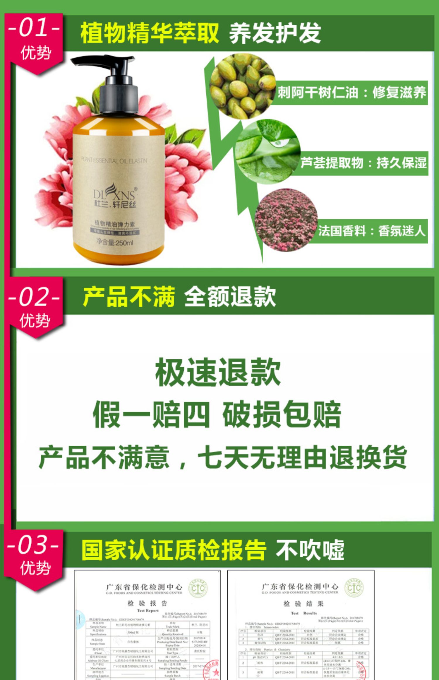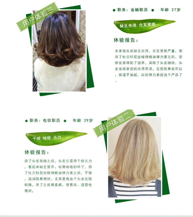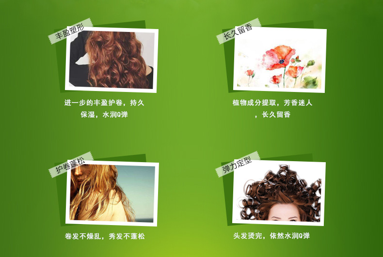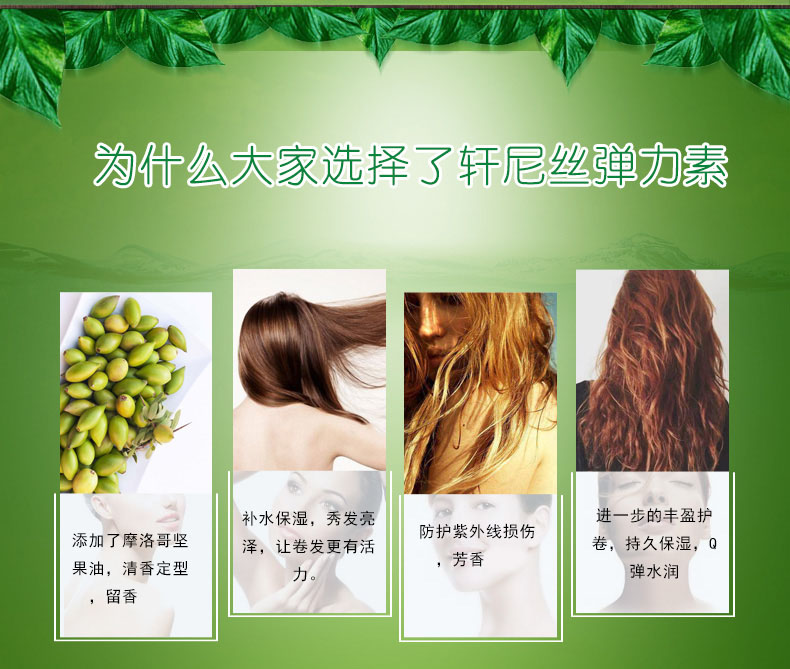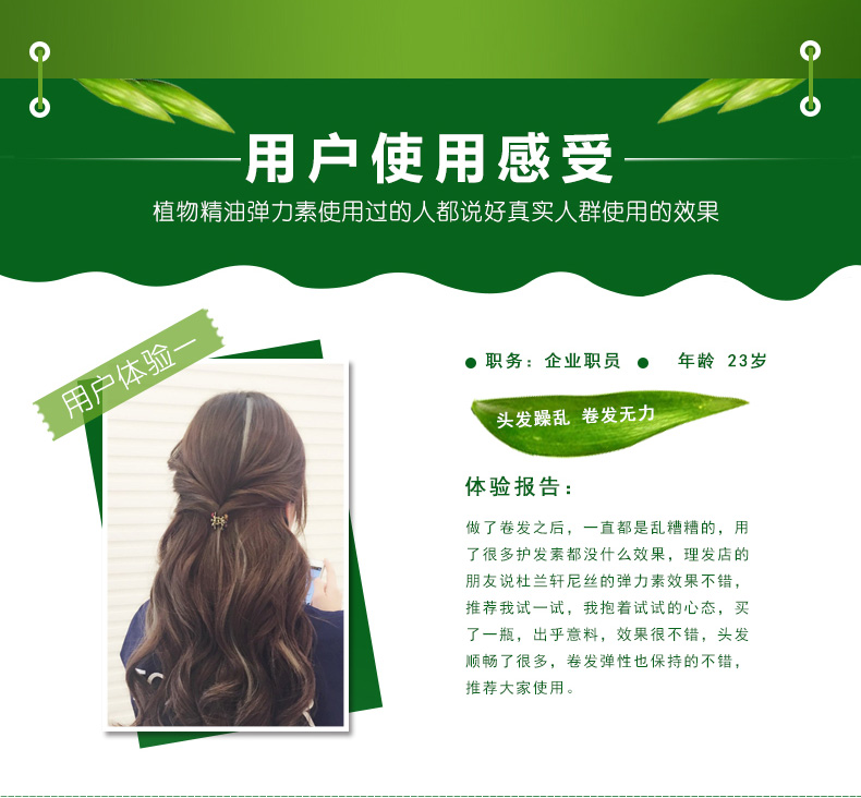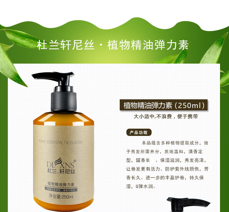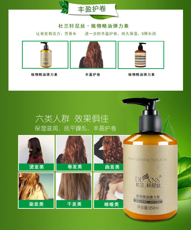 植物精油保湿定造型弹力素,湿和不刺激,卷发轻盈,水润Q弹,香味长久留存,弹力定型,改善受损发丝,让头发更亮丽光彩~