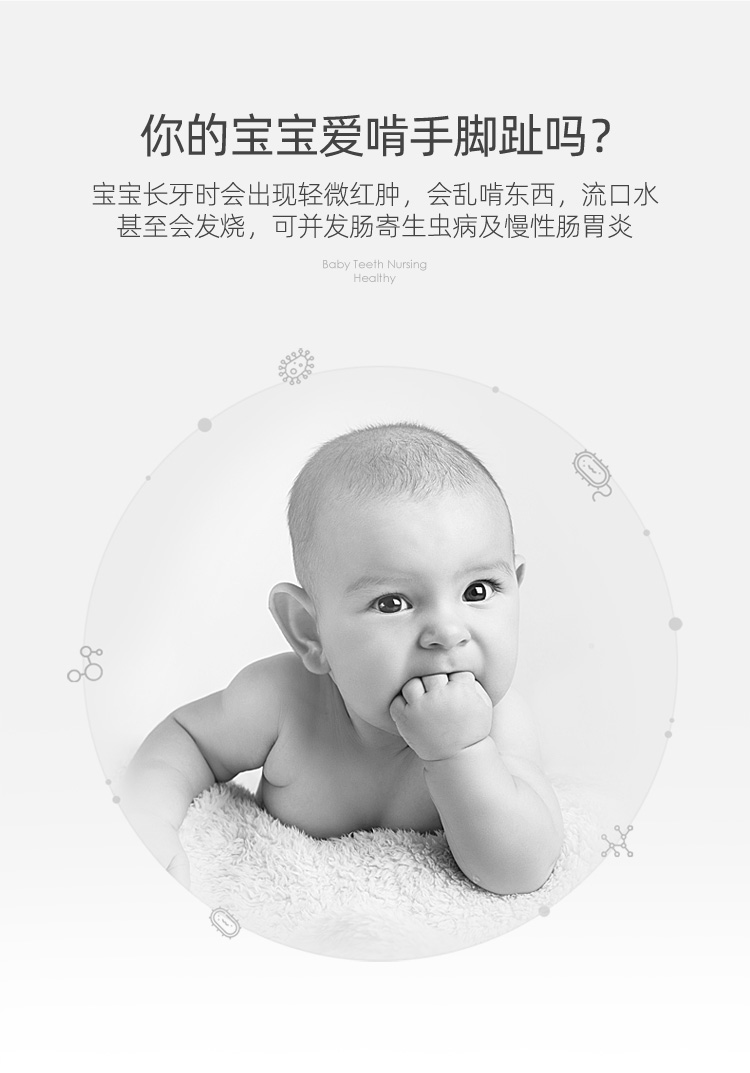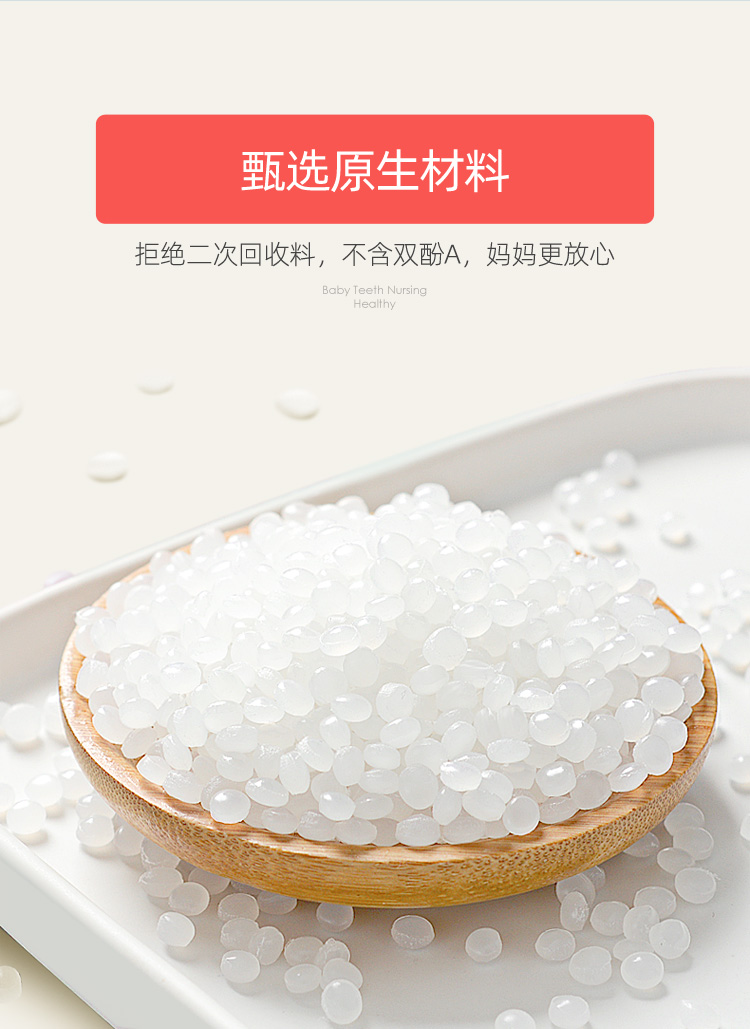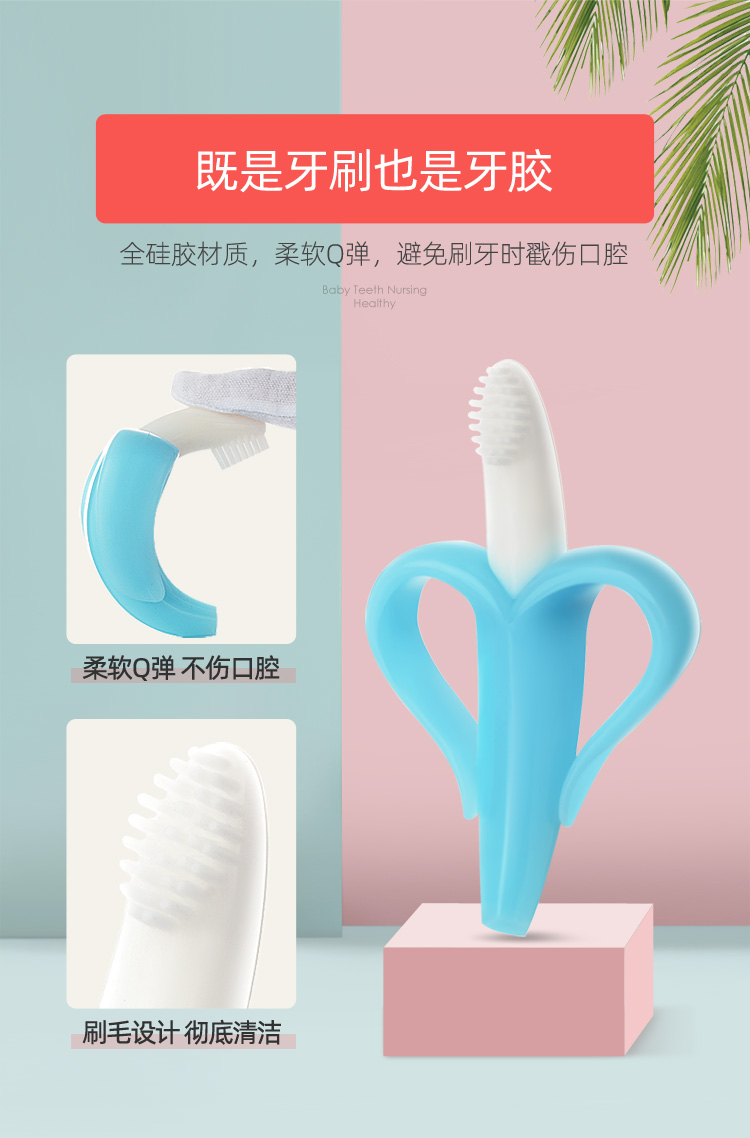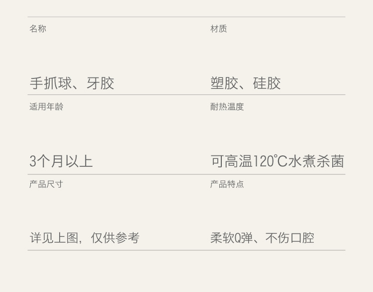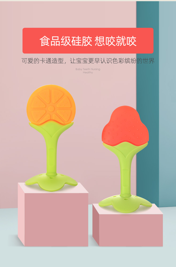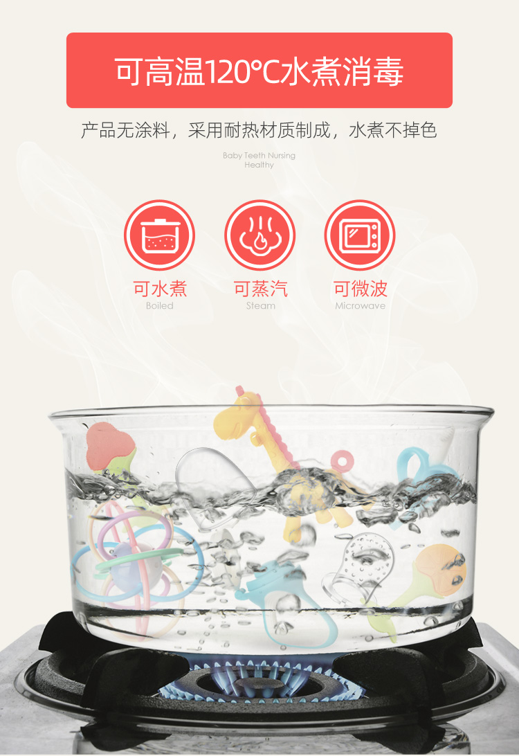 固齿磨牙,锻炼抓握,感官训练,一物两用。出牙好伴侣,食品级软硅胶材质,可高温水洗消毒,柔软舒适不伤牙,让宝宝爱不释手,妈妈放心选择!!