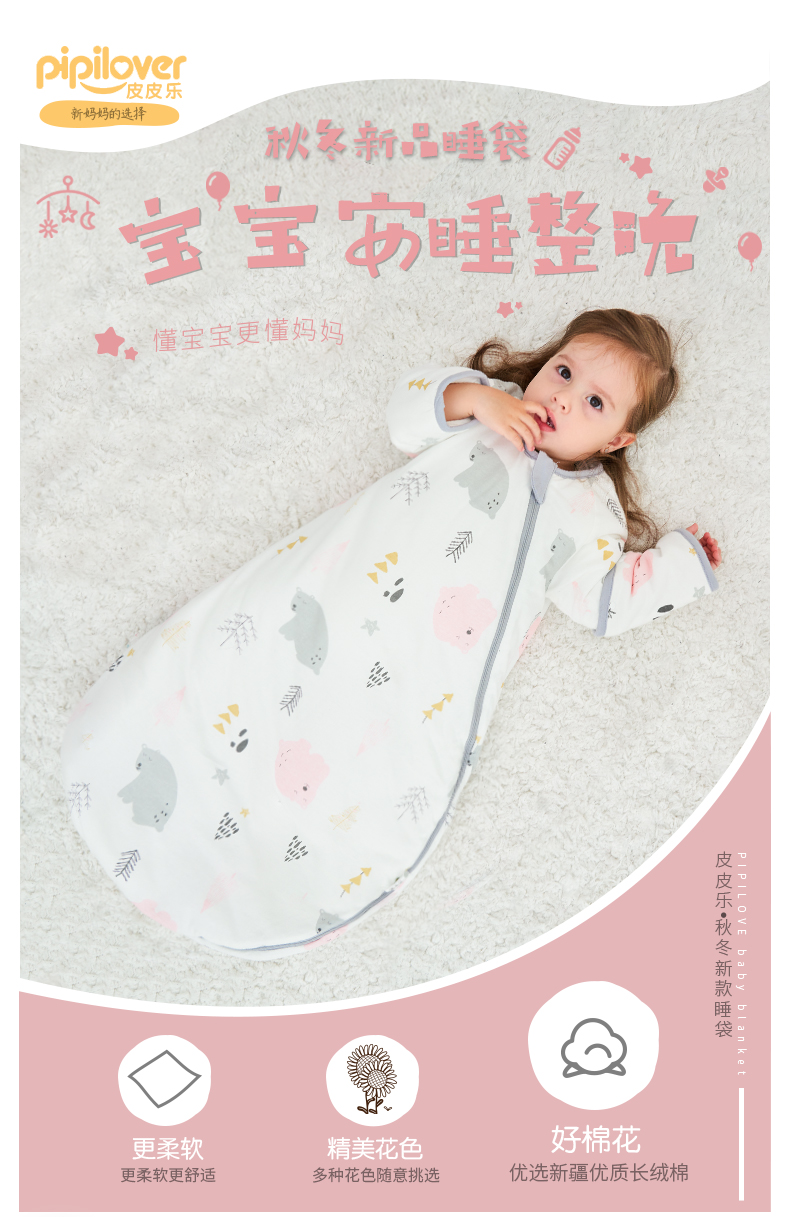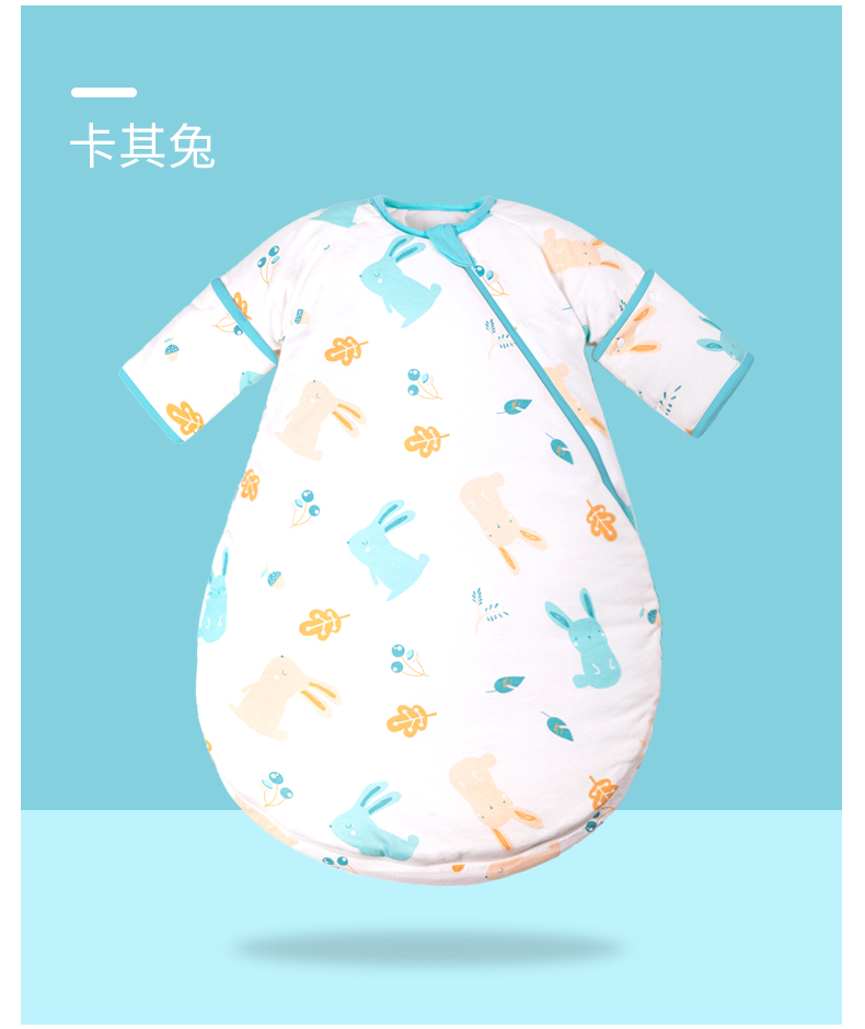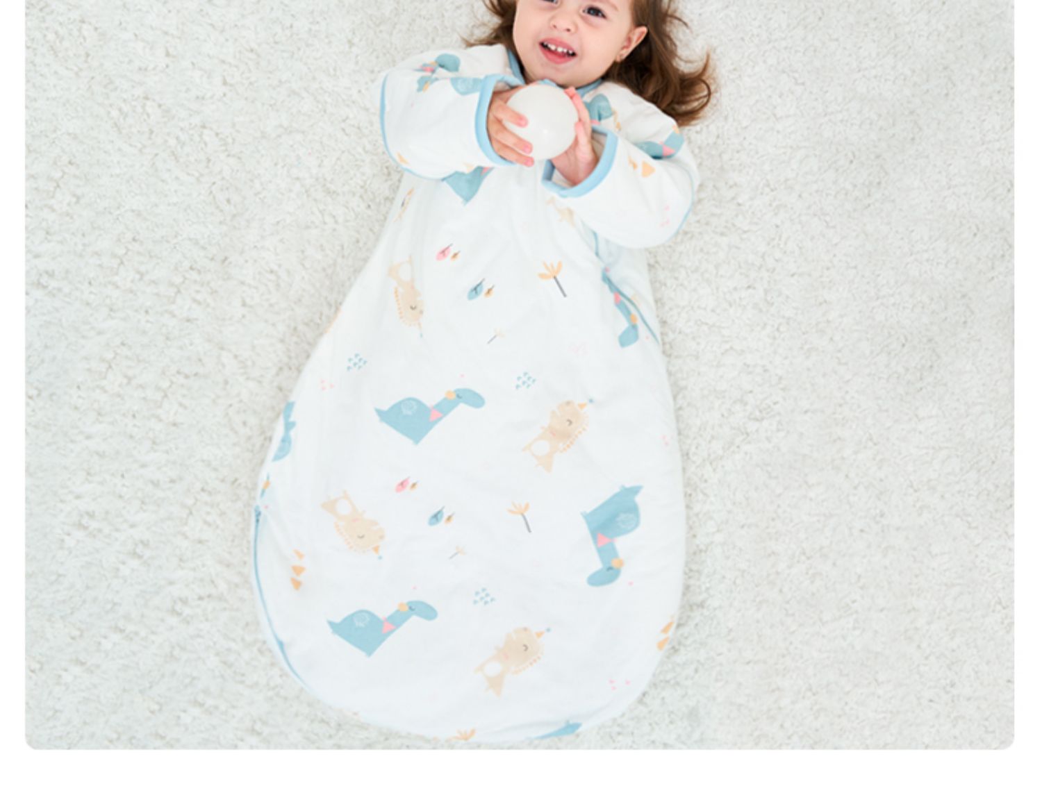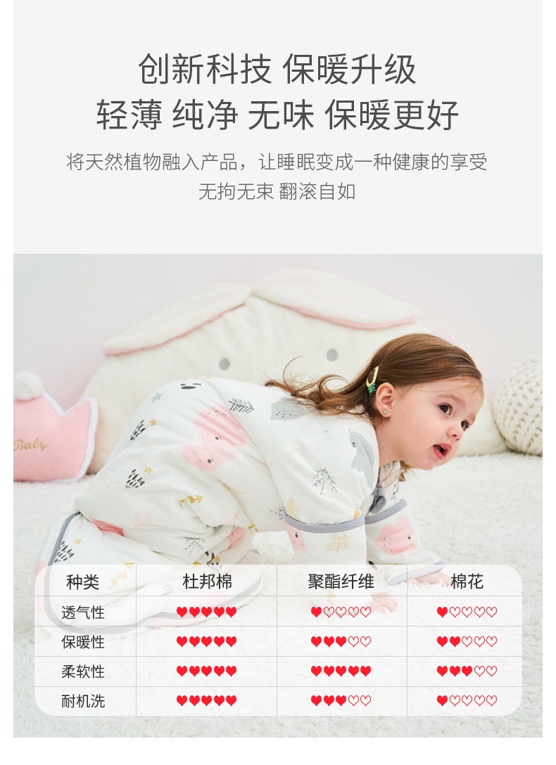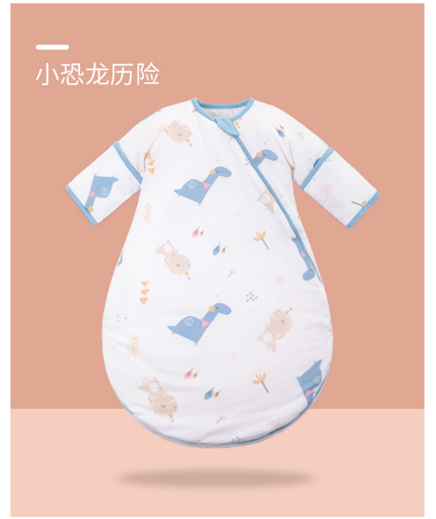 3D立体设计,活动自如增大宝宝活动空间,可拆袖一体睡袋一衣两穿,温度可控。甄选优质长绒棉面料。
