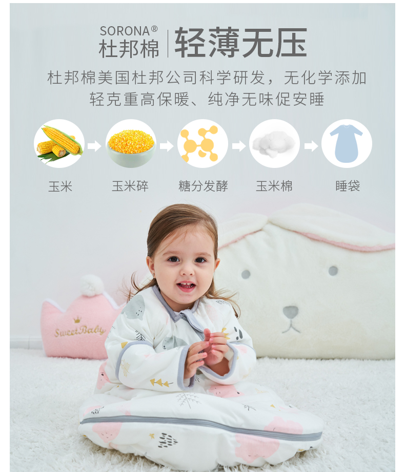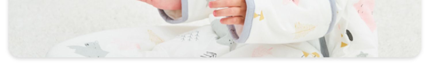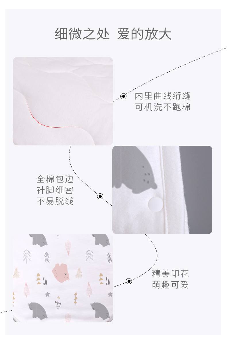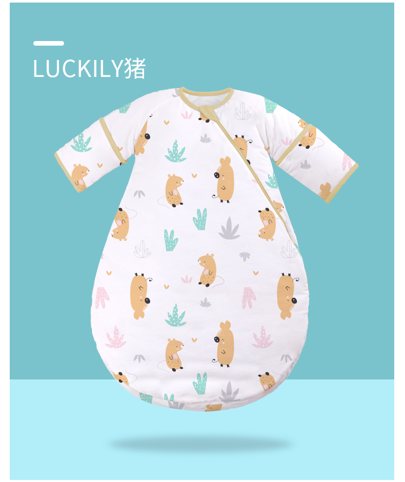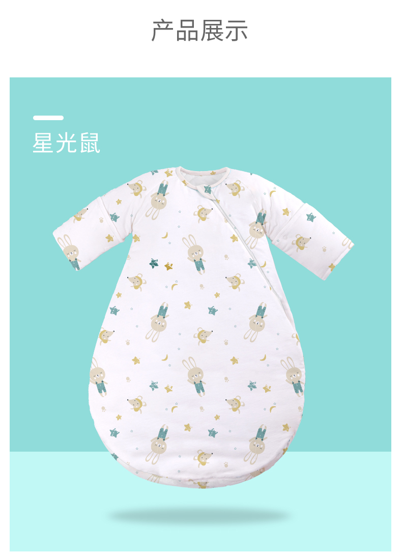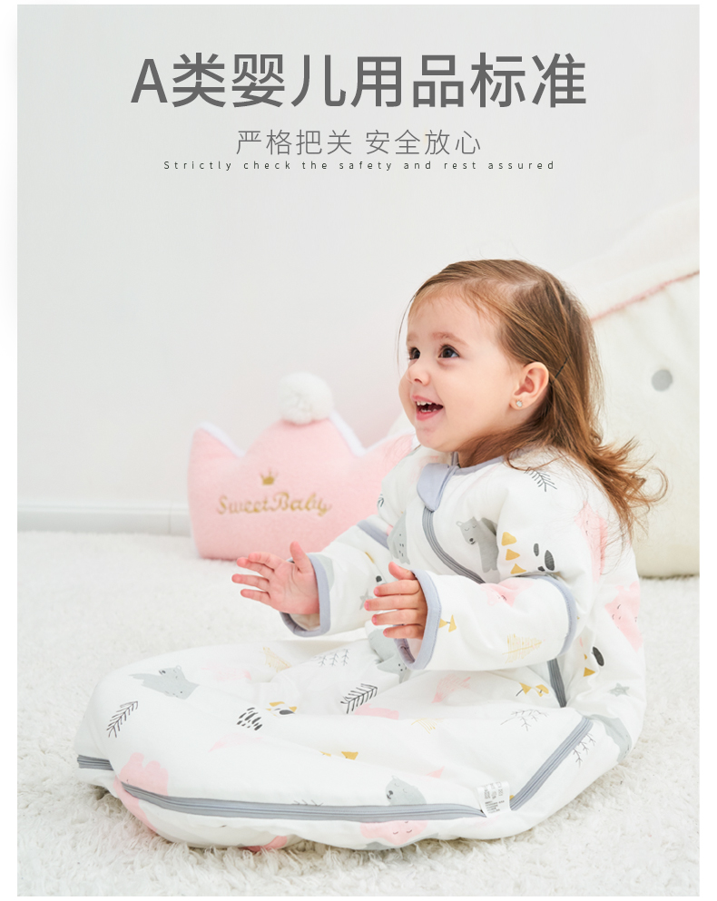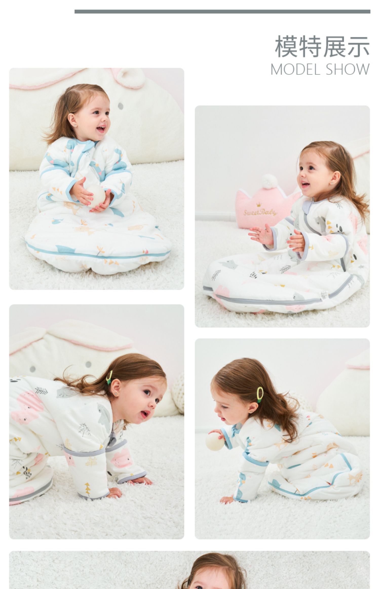 3D立体设计,活动自如增大宝宝活动空间,可拆袖一体睡袋一衣两穿,温度可控。甄选优质长绒棉面料。