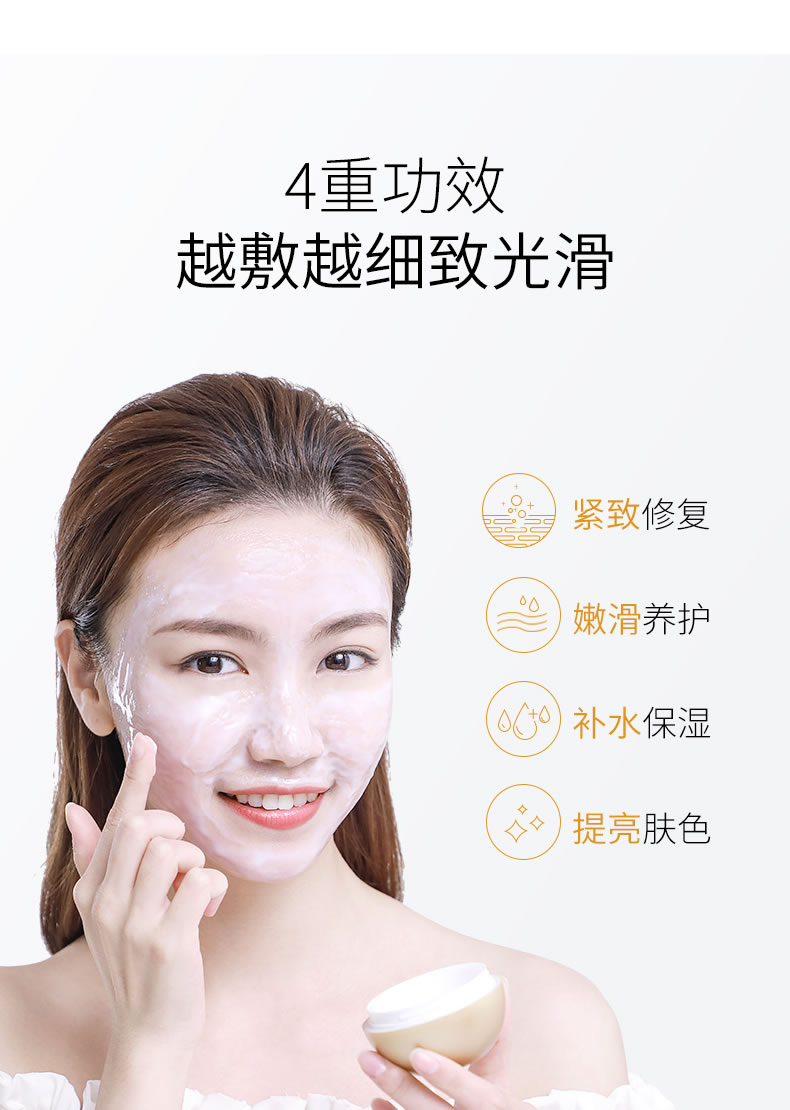 49元两件,新品酵母焕颜面纱霜Q弹乳质地,充满保湿成分,如蛋壳般的保护您的肌肤,添加水解蛋壳膜,厚敷15-30分钟,即可轻松揭下整张面纱霜膜,肌肤宛如新鲜剥壳的鸡蛋,水润有活力。
