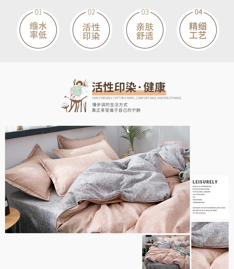 透气舒适,不起球,不掉色,清新北欧高颜值套件,双面纯棉面料。吸汗透气,亲肤柔软,给你的肌肤带来每晚细腻呵护,放大慵懒随性幸福感,让你爱上裸睡。