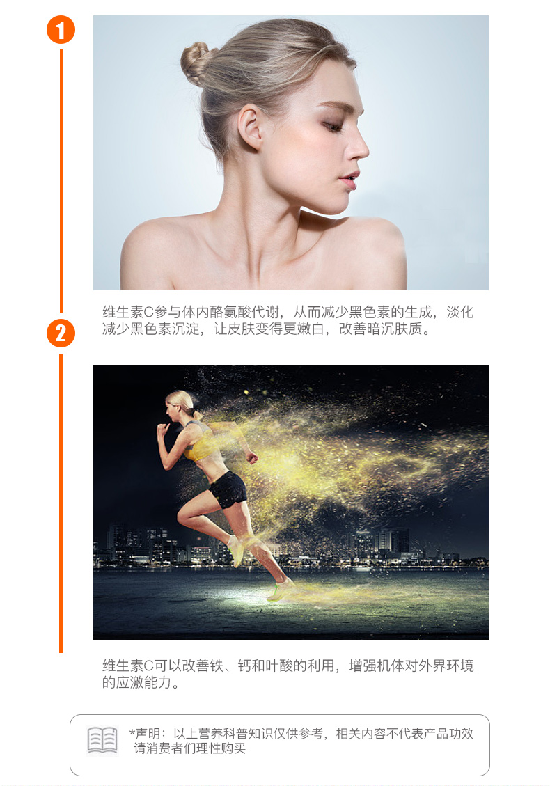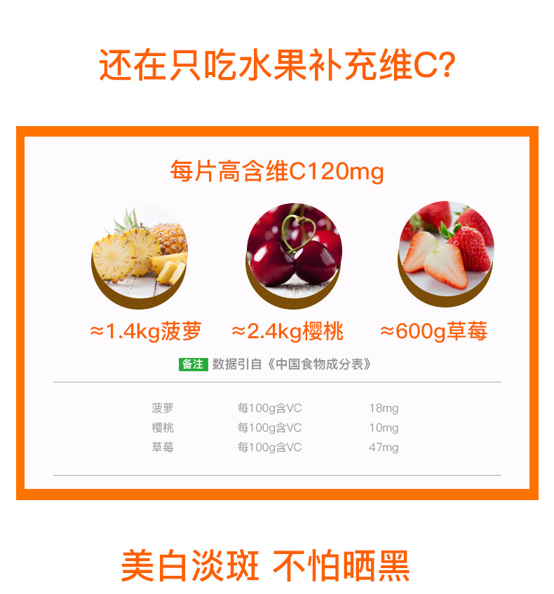 1片维C泡腾片的维C含量=32个橙子,不仅仅是维C,美味美容,水溶易吸收,帮你补充每日营养,提升抵抗力,抑制黑色素,唤醒身体、持久美丽!