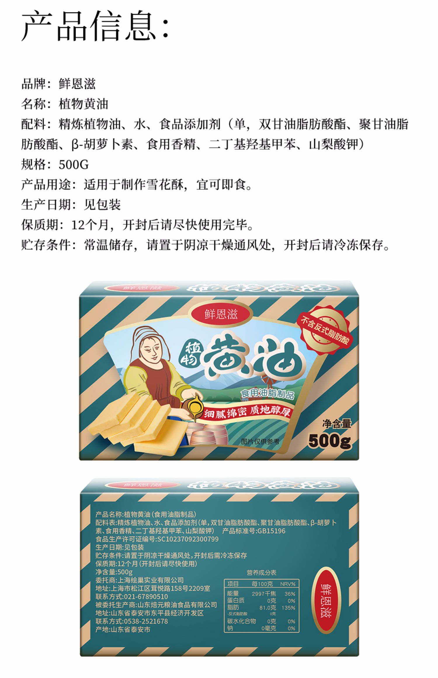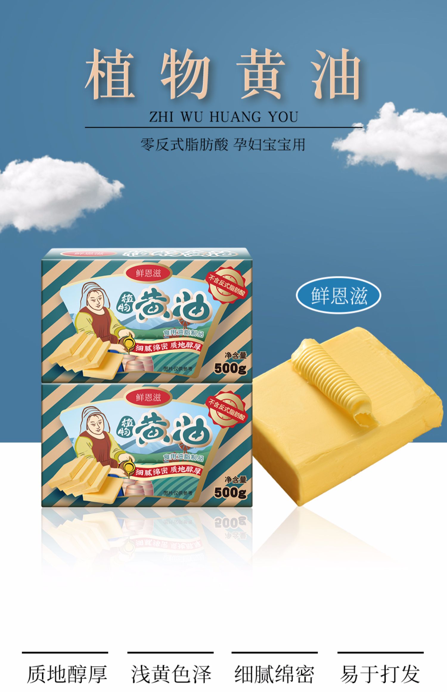 【鲜恩滋旗舰店】植物黄油500g~细腻绵密,轻松打发!奶味香浓,气味纷香诱人,用途广泛,味道纯正,多种用途,玩转烘焙,不含反式脂肪酸,孕妇宝宝可食用!第2件只要9.8,超级划算~