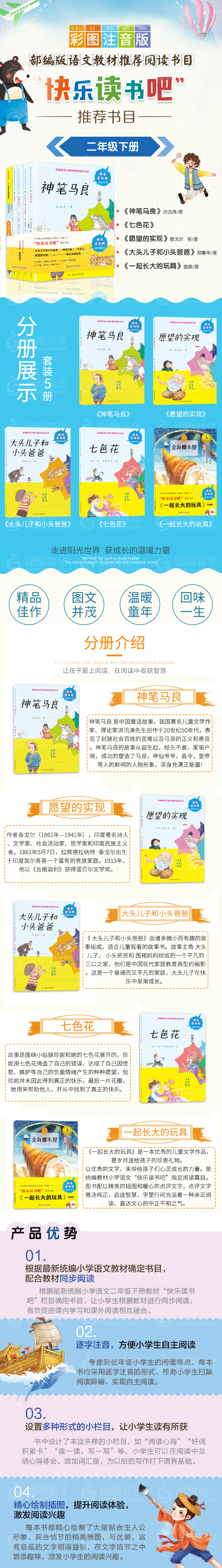 人教版二年级下册指定阅读图书,儿童文学名著,宝宝睡前童话故事,神笔马良、七色花、愿望的实现、大头儿子和小头爸爸,一起长大的玩具,彩图注音版,快乐读书吧推荐丛书,小学生新课标必读课外读物。