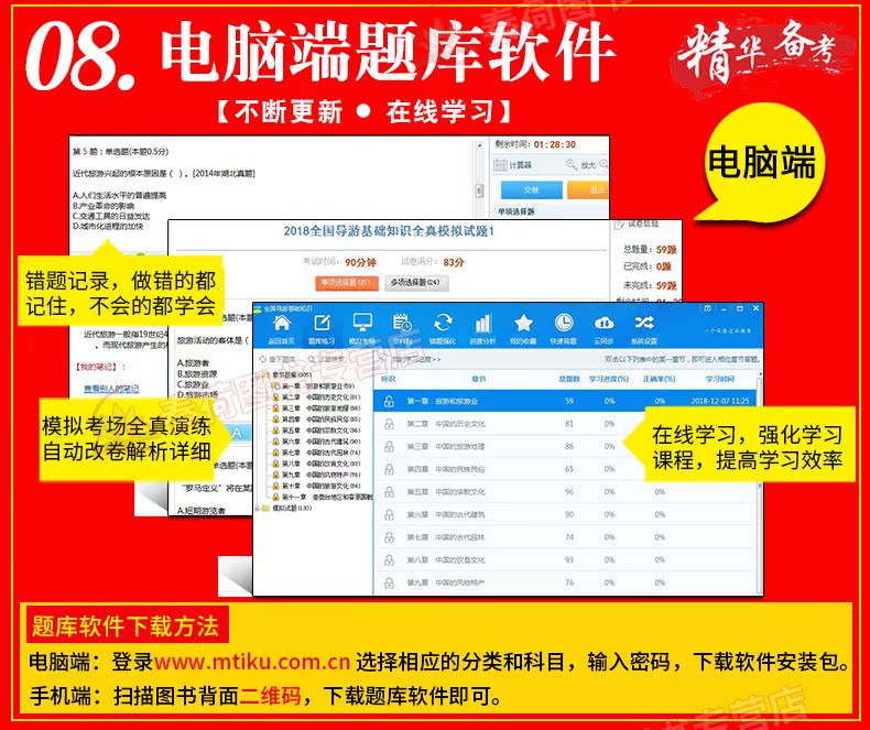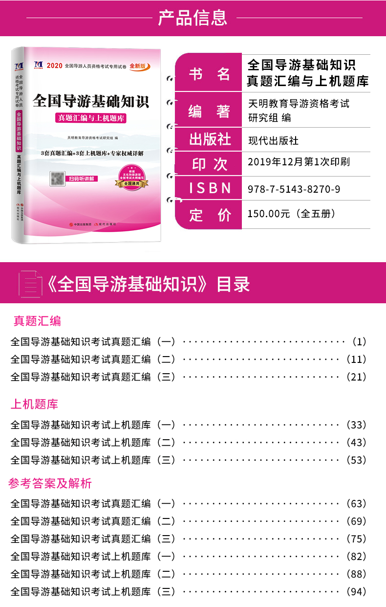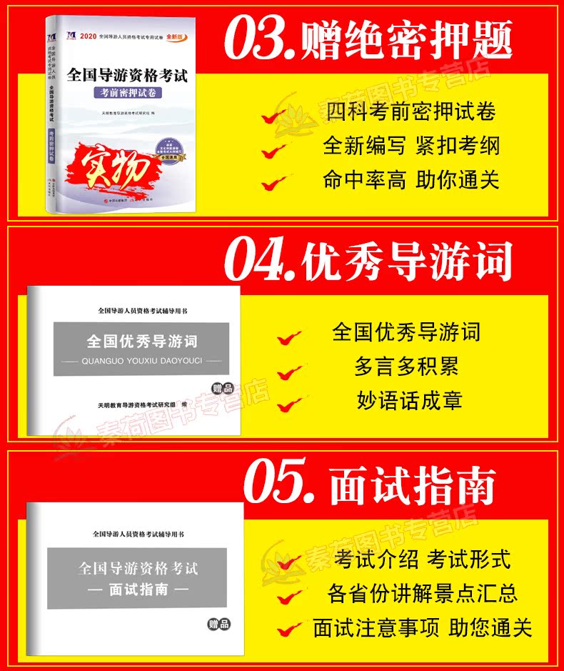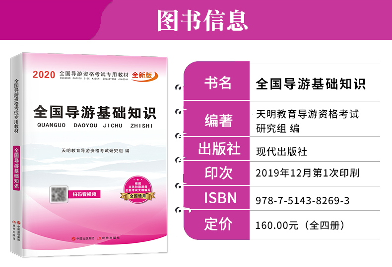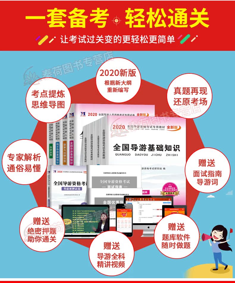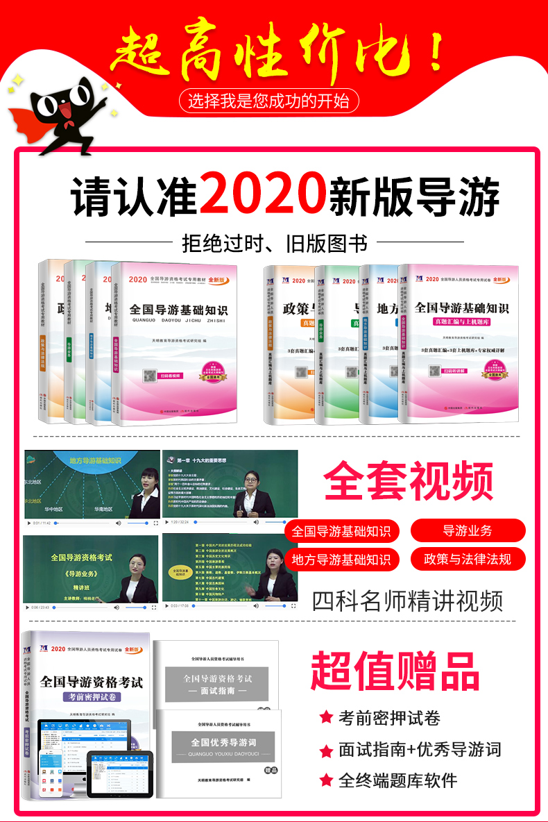 2020年全国导游资格证考试全新版教材,全套视频:全国导游基础知识,导游业务,地方导游基础知识,政策与法律法规,超值赠品:全国优秀导游词,考前30天必做绝密押题,全终端题库软件!让您轻松备考!