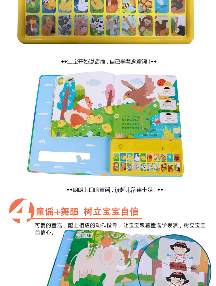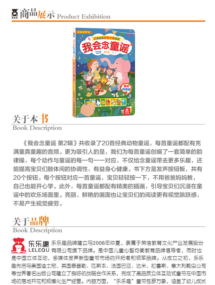 【乐乐趣旗舰店】国学经典发声系列,20首经典动物童谣激发宝宝阅读兴趣!每首童谣都配有充满童真童趣的音频,童谣都有一套简单的韵律操,不仅给孩子带来乐趣,还能提高宝贝的肢体协调性。宝妈必入手哦!