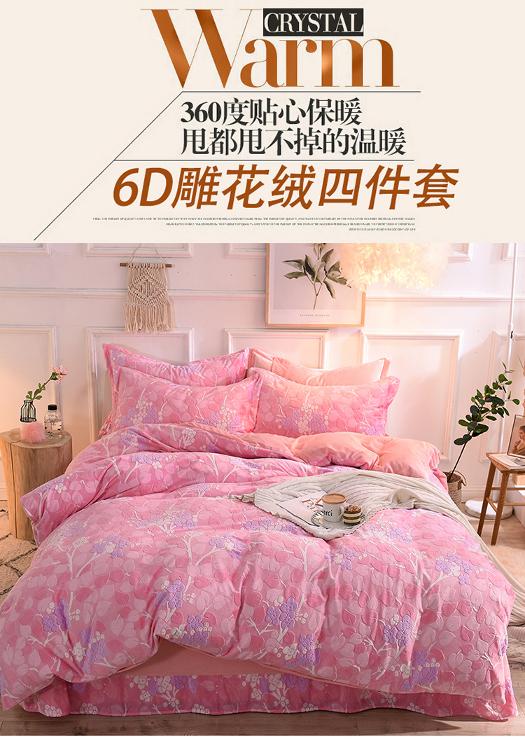 6D雕花绒四件套,细腻绒毛,质地蓬松,舒适透气,零甲醛不刺激皮肤,加厚保暖双层,给你加倍的温暖,多款多色可选,温暖呵护!超多颜色可选【赠运费险】