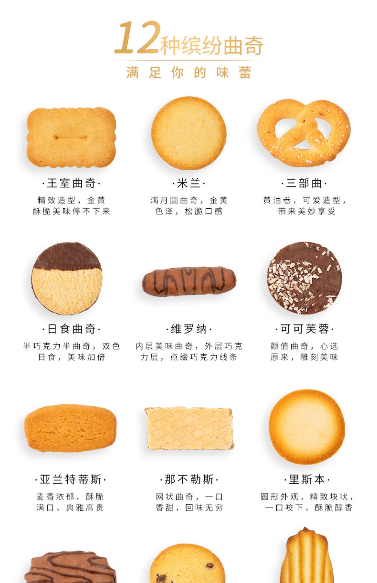 纸盒外加高端原装礼品袋尊贵包装!德国进口,甄选优质材料,可可芙蓉、巧克力等12种曲奇,美味不止一种,严格控制烘焙温度,悉心制作,奶香浓郁,口口香脆,唇齿留香【赠运费险】