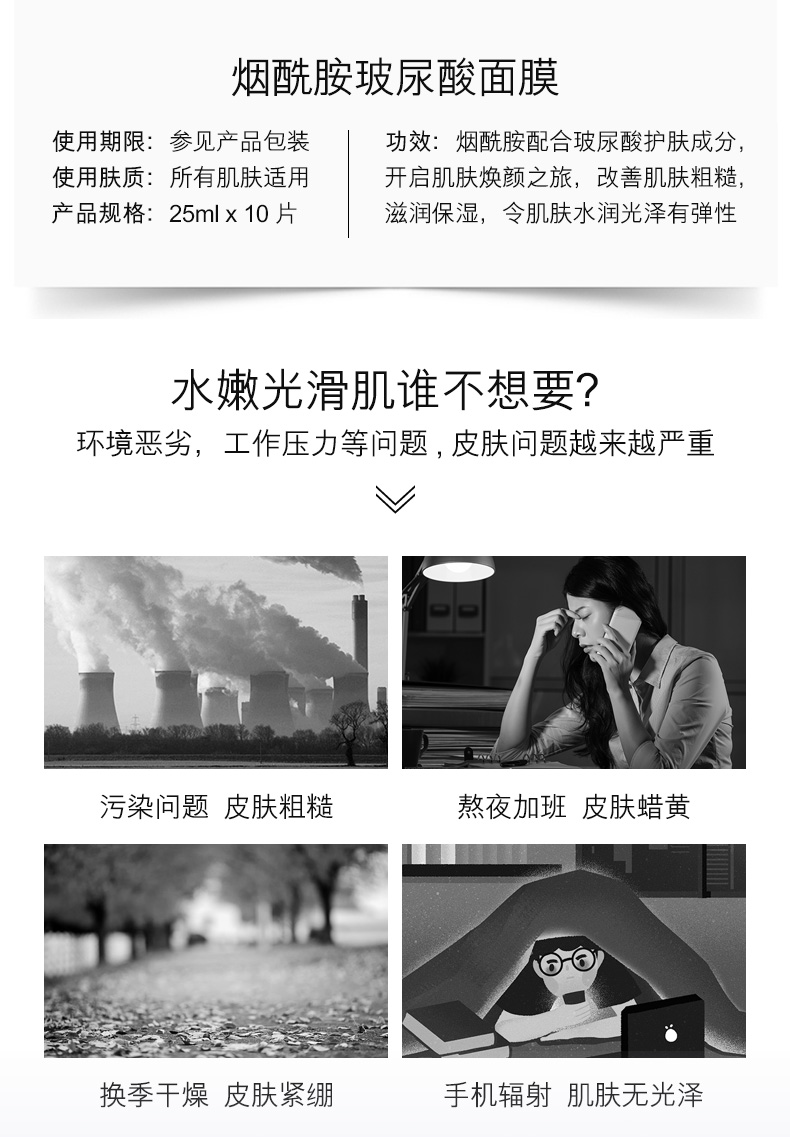 【拍2件20片,第二件0元,】烟酰胺配合玻尿酸护肤成分,开启肌肤焕颜之旅!保湿补水,提亮肤色,改善肌肤粗糙,让肌肤水润光泽有弹性!肌肤重回学生时代【赠运费险】