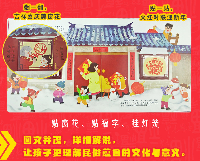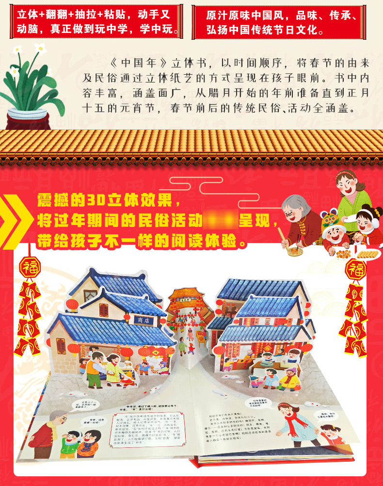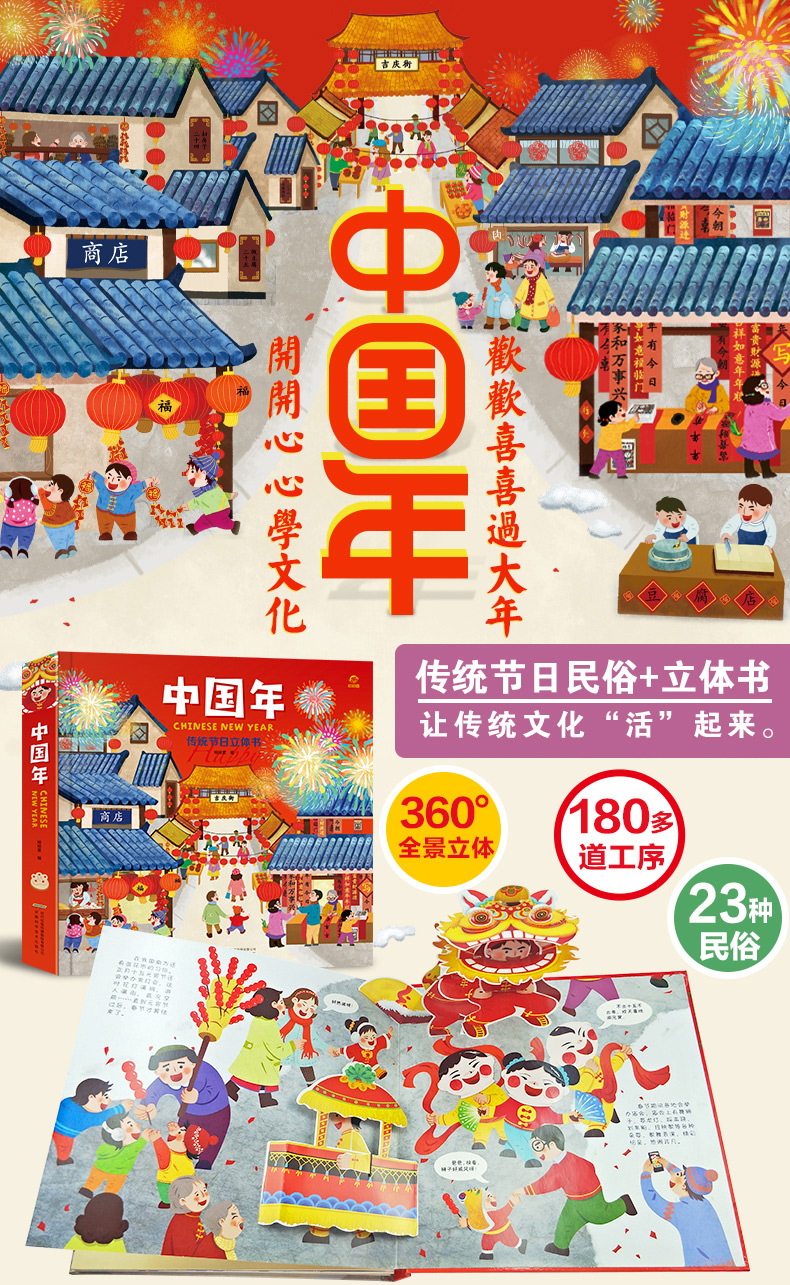 真正3D立体图书,360°全景立体,180多道工序,23种民俗,原汁原味中国风,跃然于纸上,品味,传承,弘扬中国文化,寓教于乐,提高孩子的学习兴趣,动手能力,让孩子记住我们的中国传统!【赠运费险】