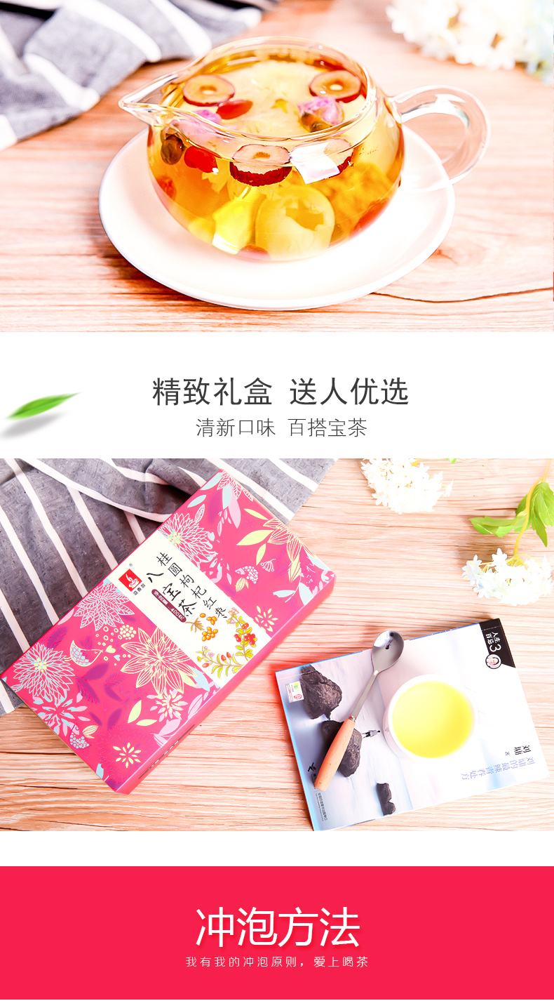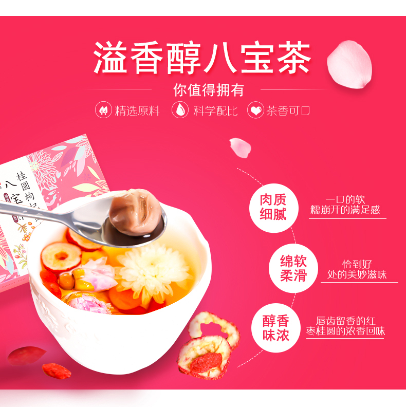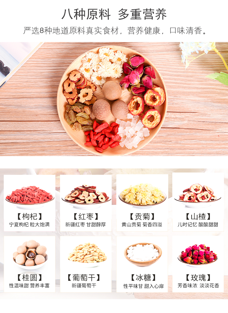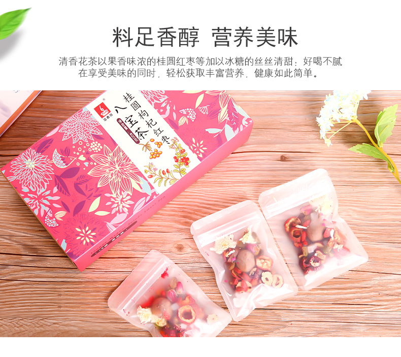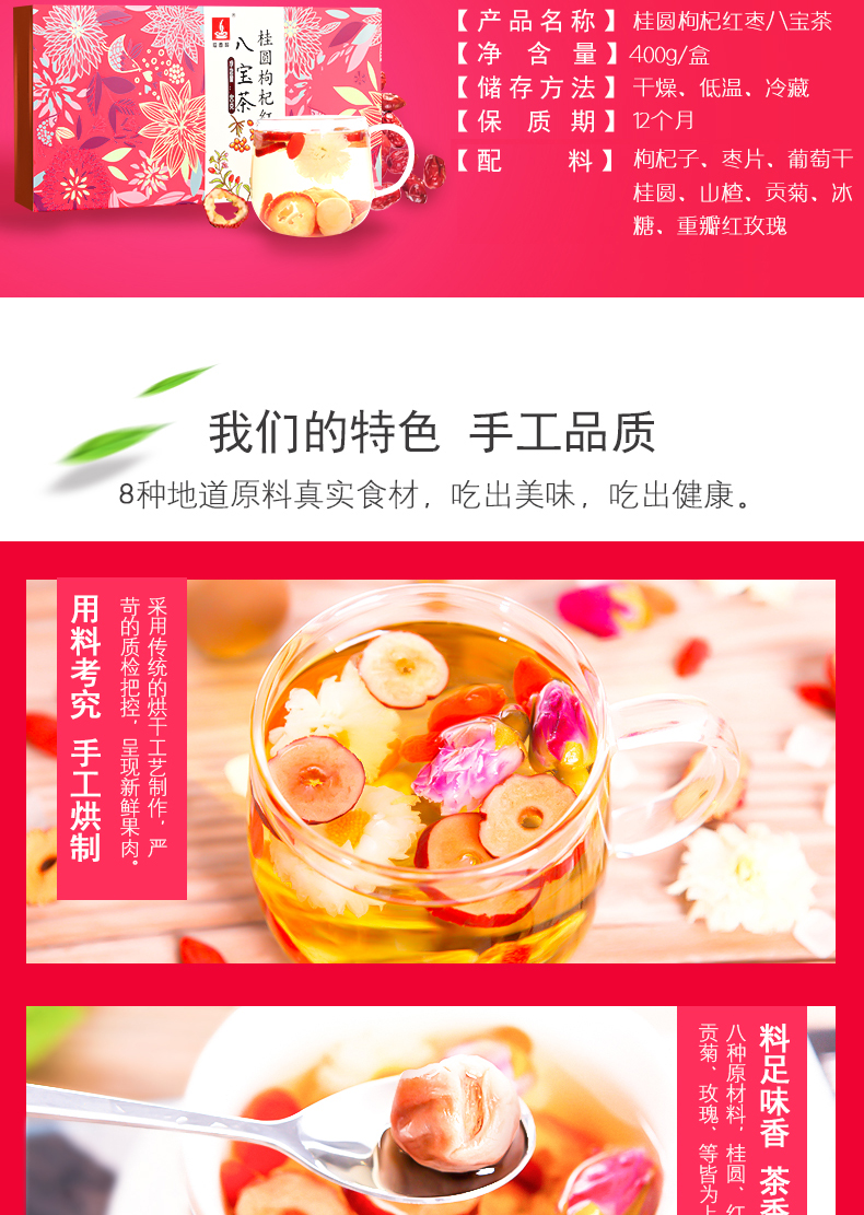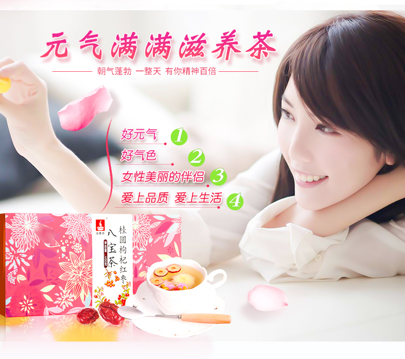 严选8种地道原料真实食材,营养健康,口味清香。没有一个好气色,神级五官都救不了你!女生补气血必备茶哦,养颜补气血,好吃又好喝,每天一杯,素颜也被老公夸上天!