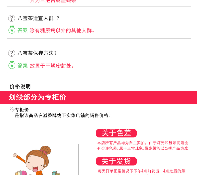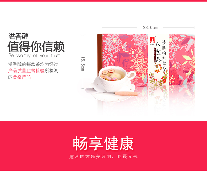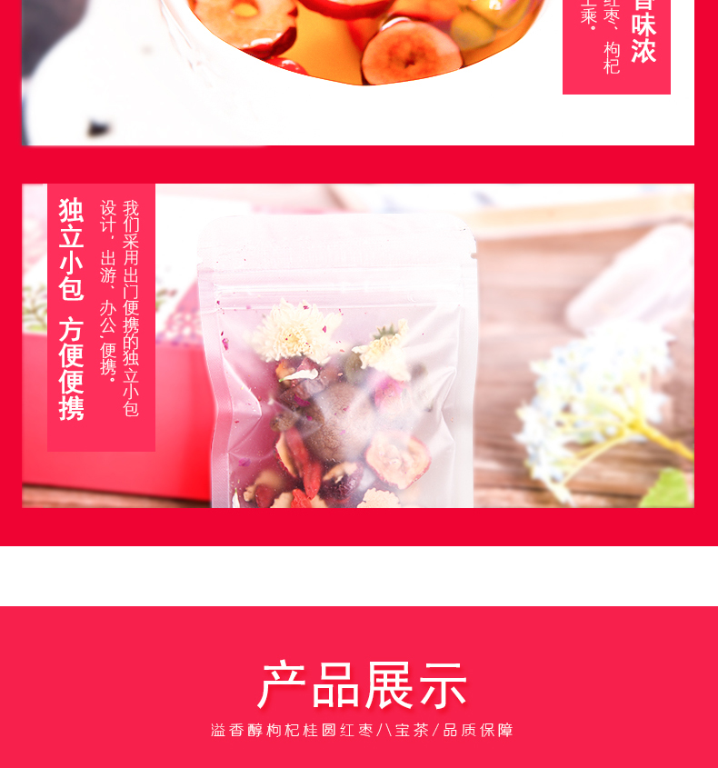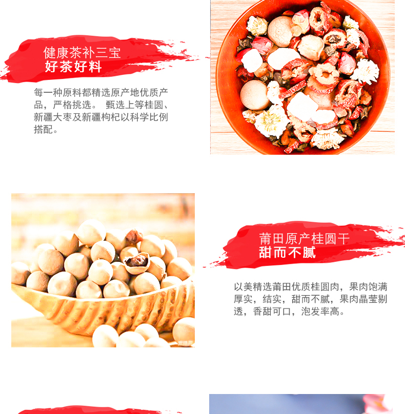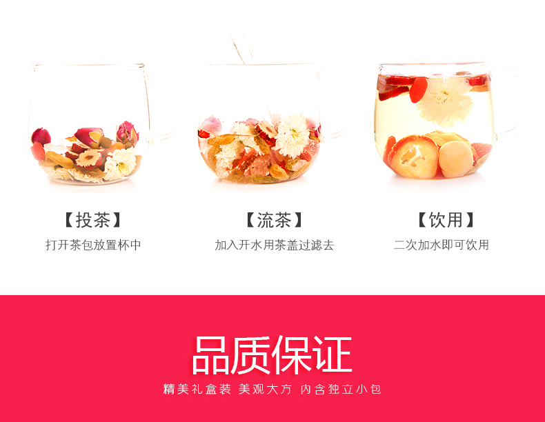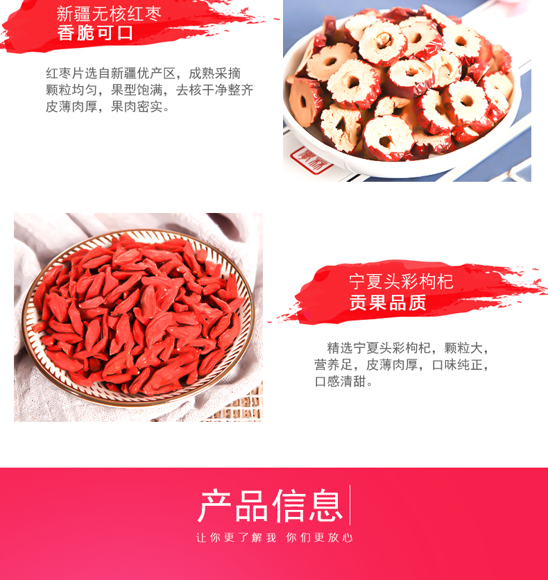 严选8种地道原料真实食材,营养健康,口味清香。没有一个好气色,神级五官都救不了你!女生补气血必备茶哦,养颜补气血,好吃又好喝,每天一杯,素颜也被老公夸上天!
