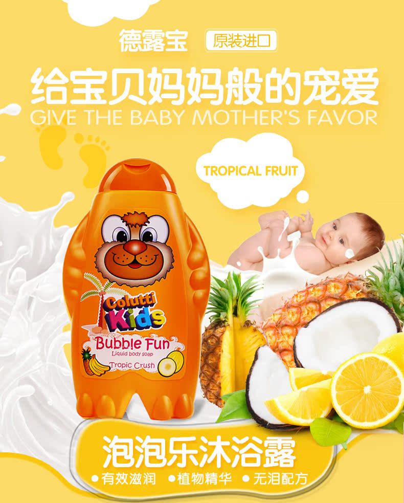 日本进口德露宝儿童沐浴露,专为宝宝精心研制温,柔如同怀抱,轻松洗沐,让宝贝享受洗沐乐趣,妈咪及敏感肌肤人群也适用~