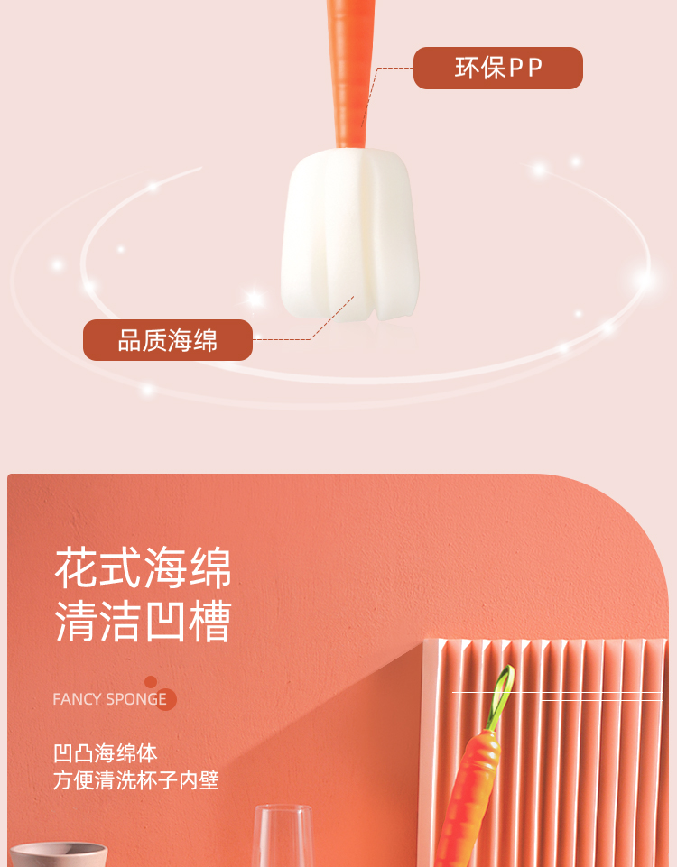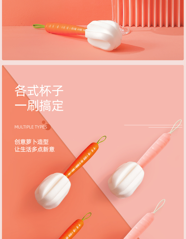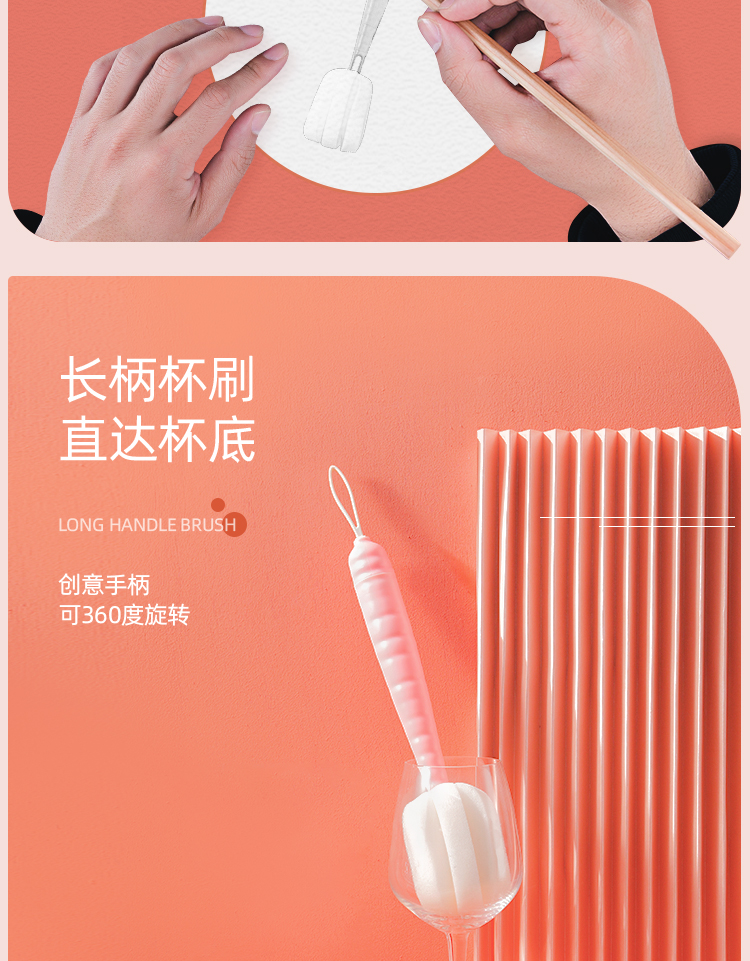 两种颜色可选,柔软吸水轻松去污,花式海绵清洁凹糟。长柄设计,直达杯底,高密度海绵,360度旋转无死角