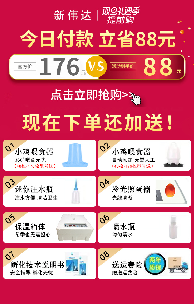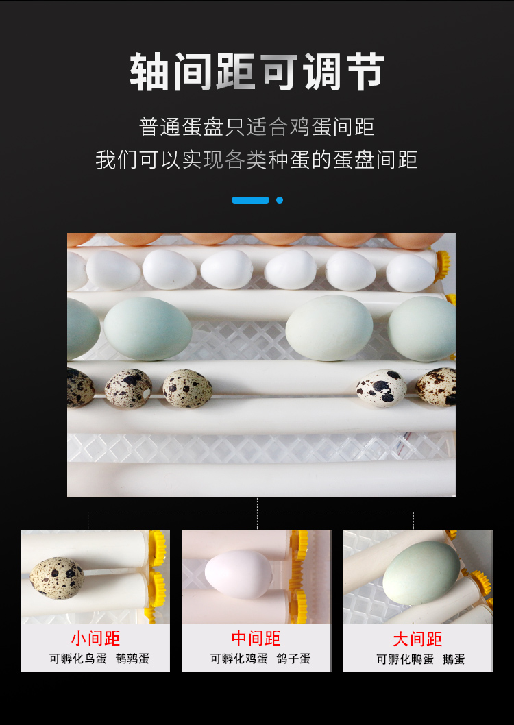 新伟达爆款小鸡孵化器,一键孵化,全自动模式,高效孵化,节能省心,轴间距可调节,各类蛋种,均可孵化。现在优惠促销,赶快抢购吧!!!