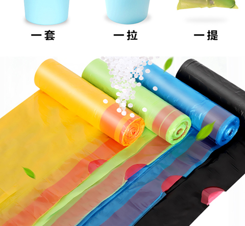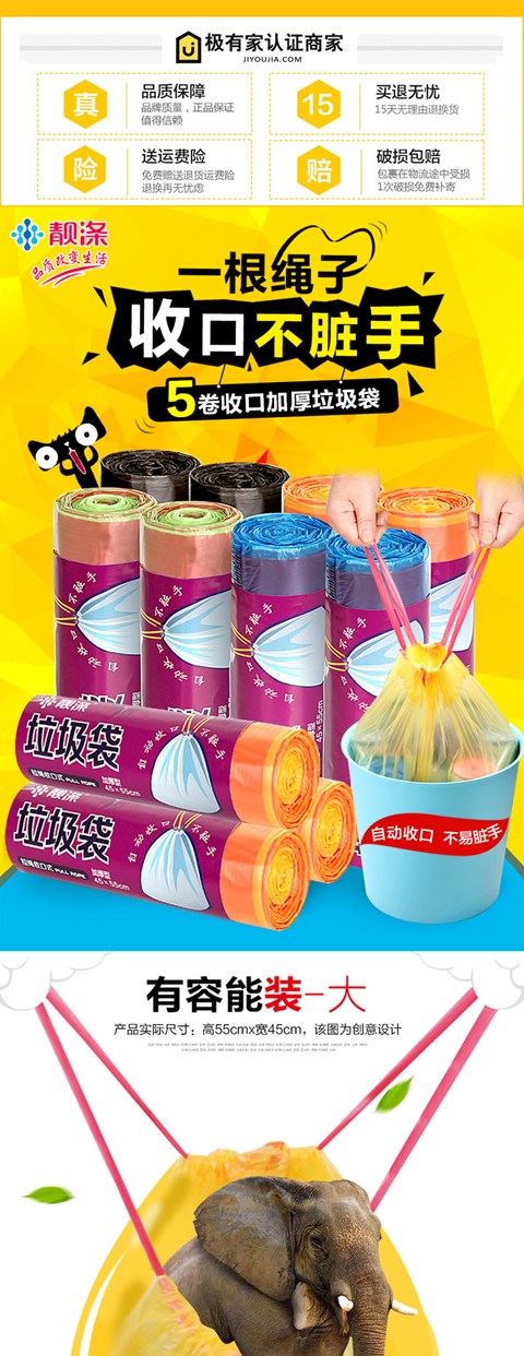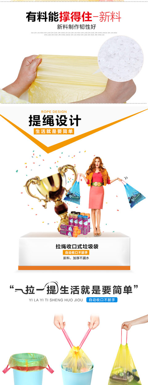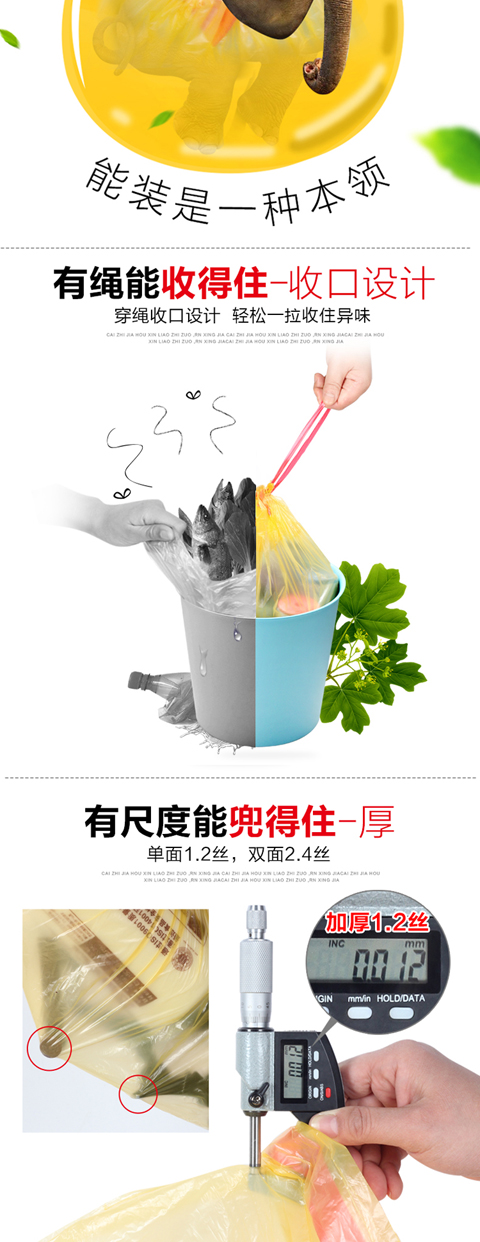 品牌!品质保证,绳子收口,超强承重,韧性十足,断点整齐,环保健康,无异味,加厚不漏水,创新手提,不脏手,断点设计,方便便捷,居家必备大牌垃圾袋。
