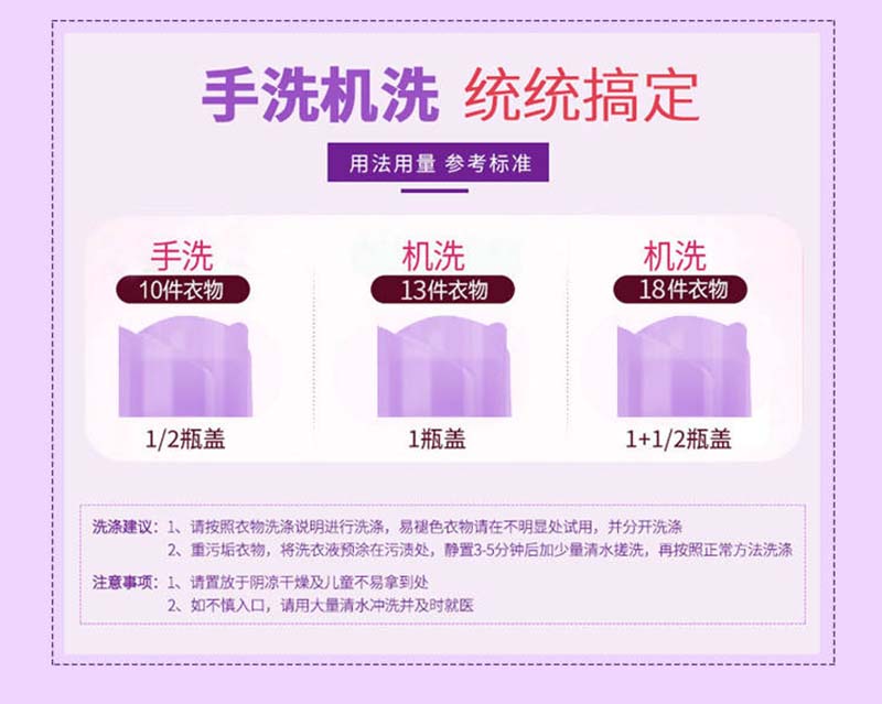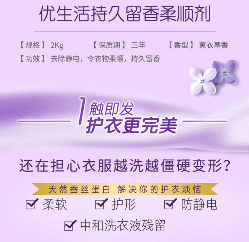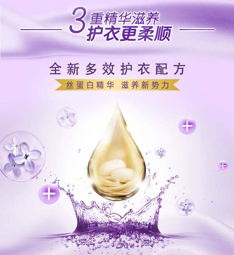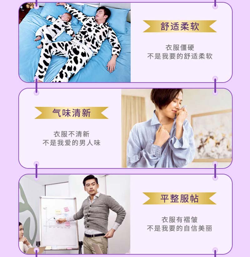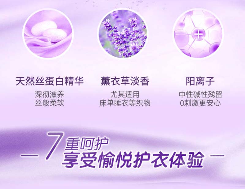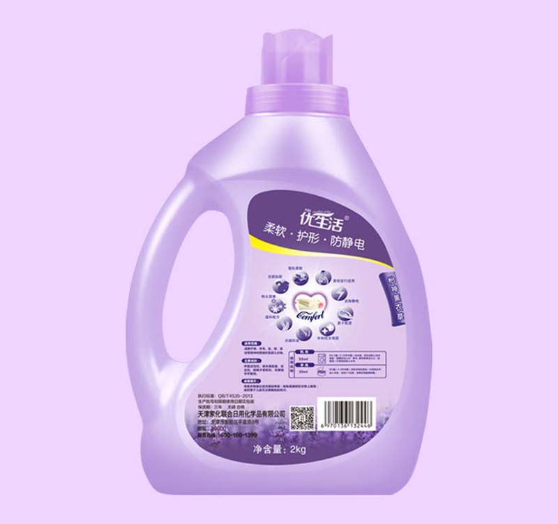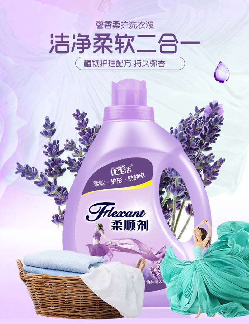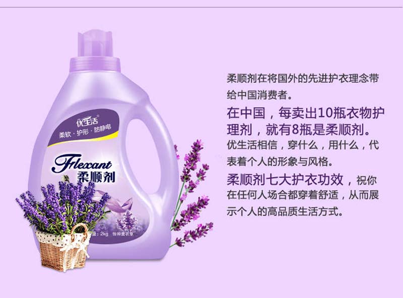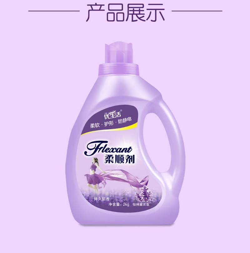 4斤瓶装薰衣草洗衣液柔顺剂,鲜花香味持久留香,洁净柔护二合一,洗后触感柔顺,衣物蓬松柔软,抗变黄,除静电,让衣物亮丽如新。