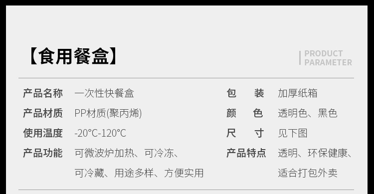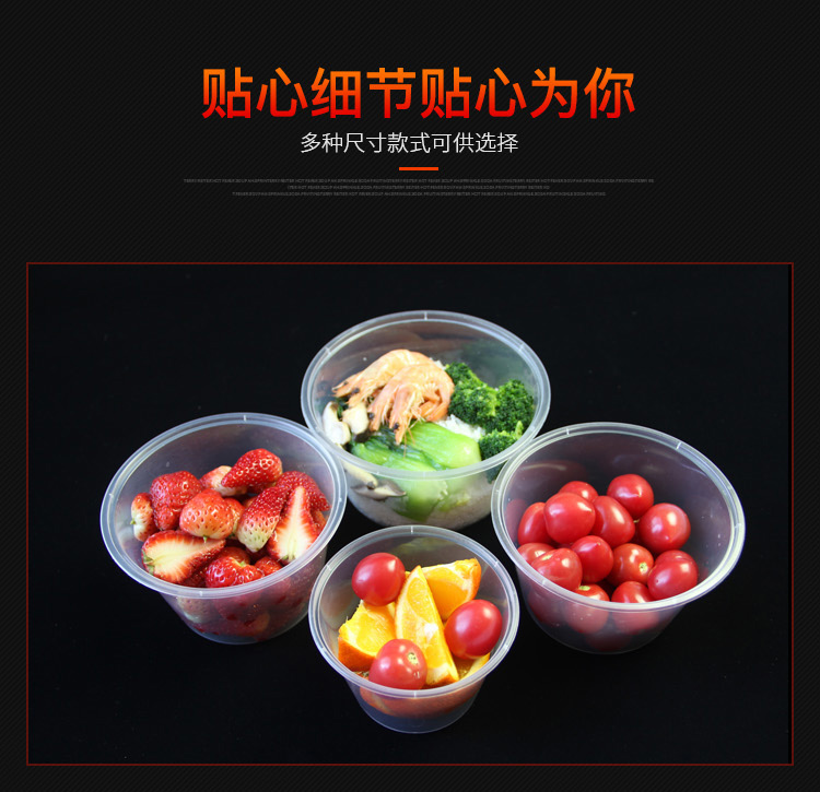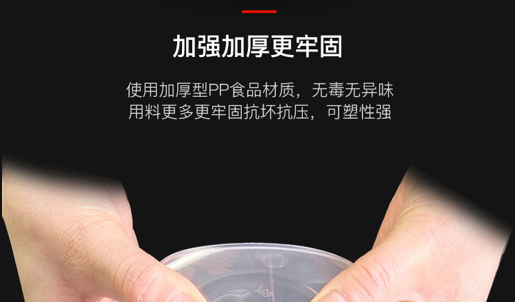 食品级PP材质,密封性强,不易参透,人性化揭盖方便卫生,抗压称重,不破损,纯PP材质耐性好,可微波可冷藏,可定制,彰显品牌实力