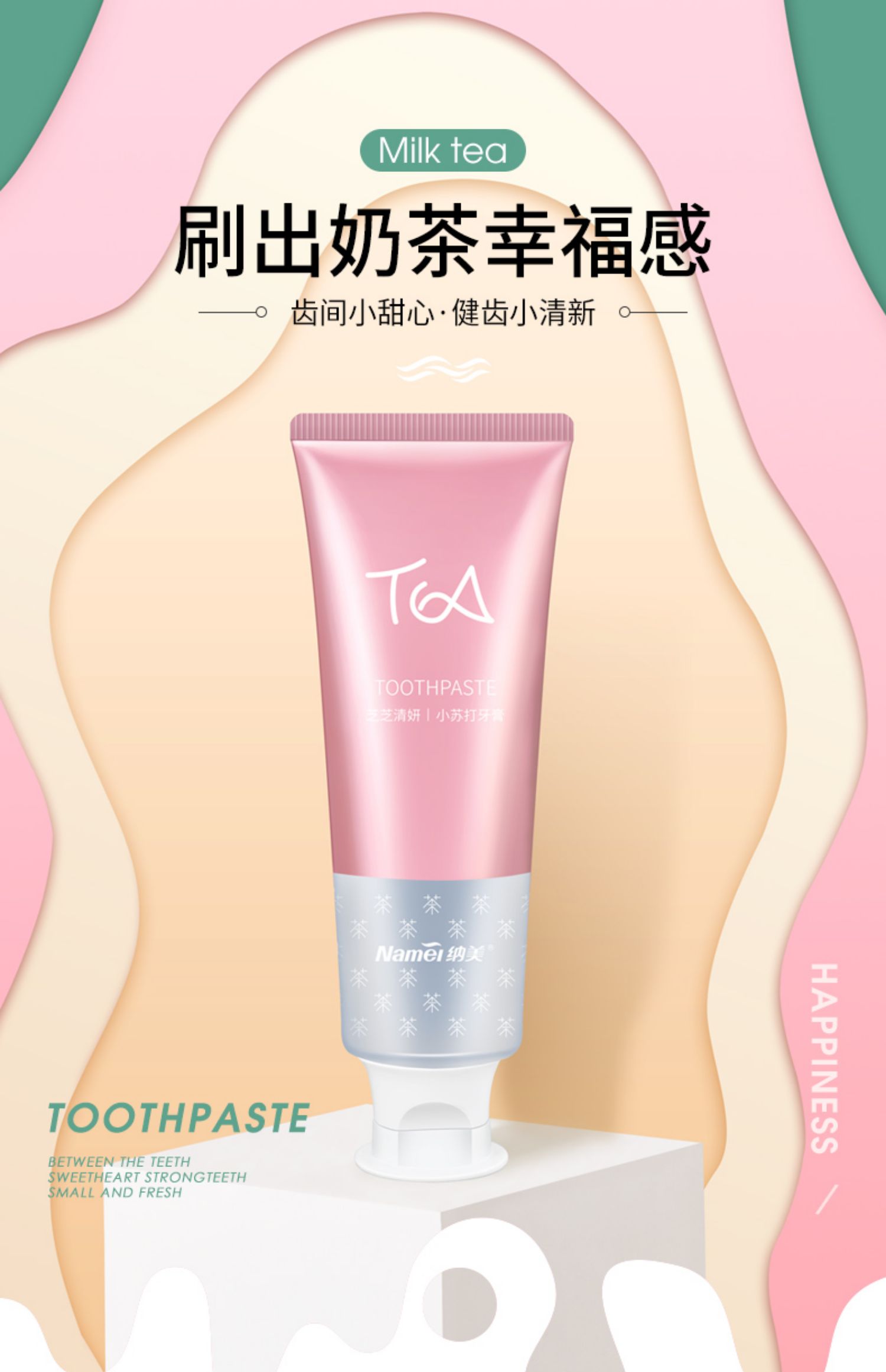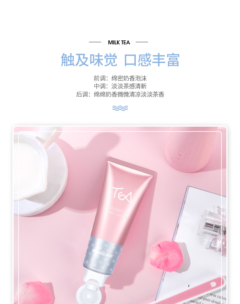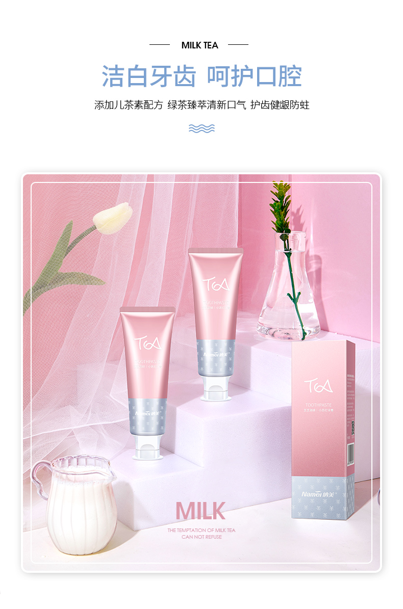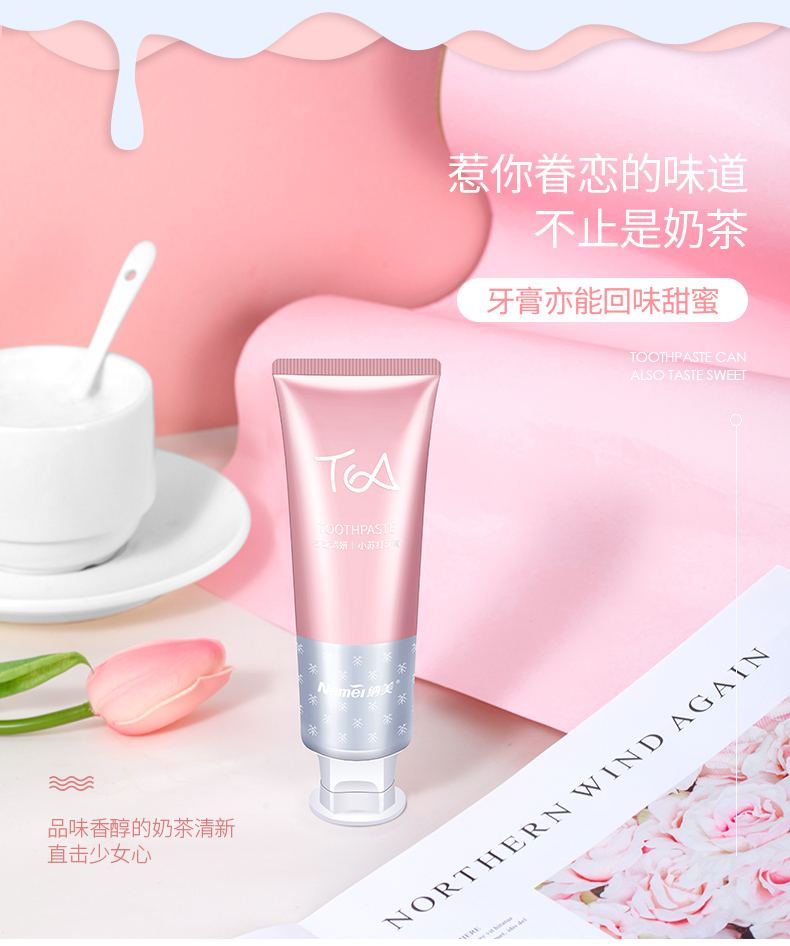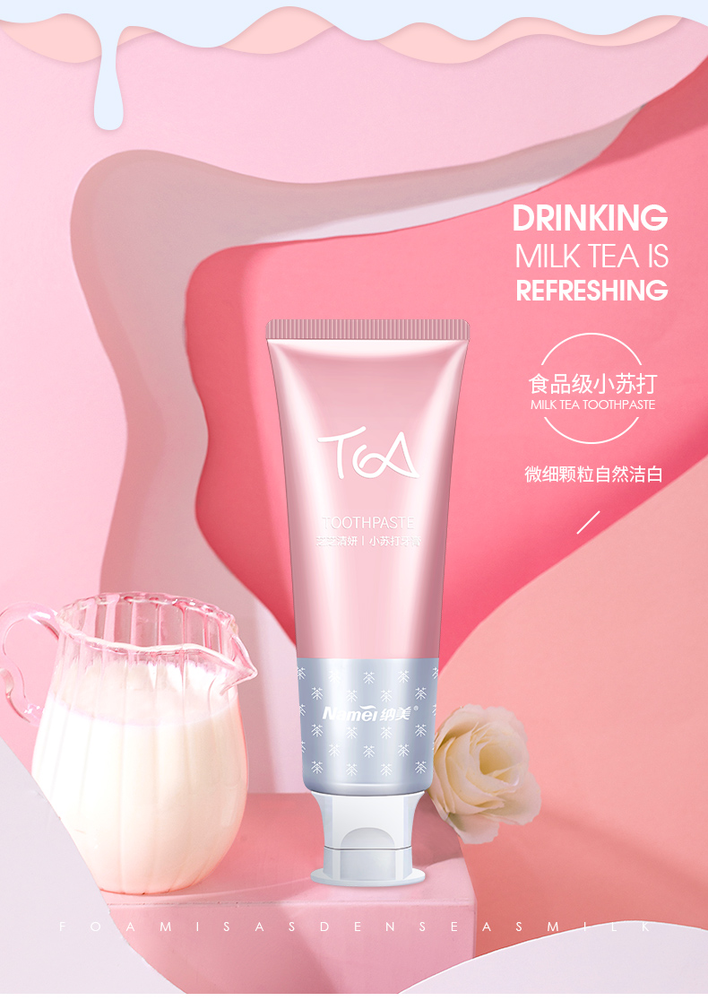 【纳美】奶茶牙膏纳美首发,蕴含氨基酸成分,绵密泡沫,防蛀固齿,细微颗粒,自然洁白。刷完牙齿就像喝完奶茶一样!