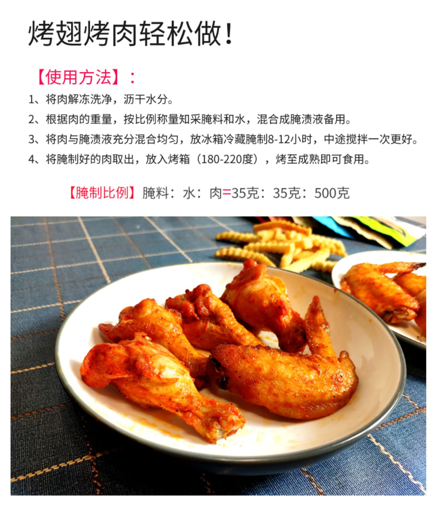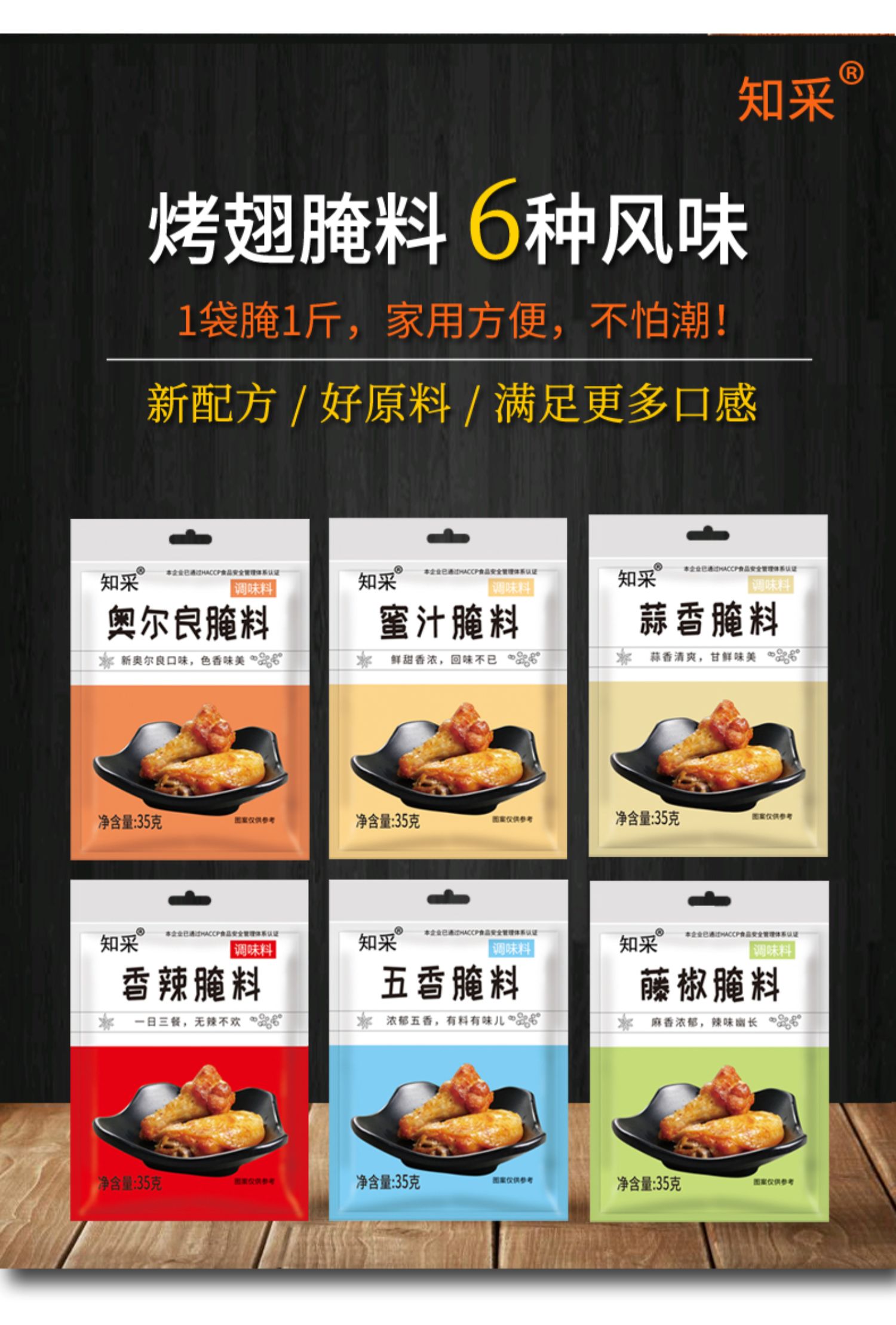 新配方,味道正,6袋组合,6种口味。新奥尔良味微辣,蜜汁味,口感浓厚,鲜美香口,爽爆味蕾!居家做大厨,好调料就是它,烤翅、汉堡、鸡米花,在家能给孩子做出美味!一袋腌一斤,家用方便,不怕潮