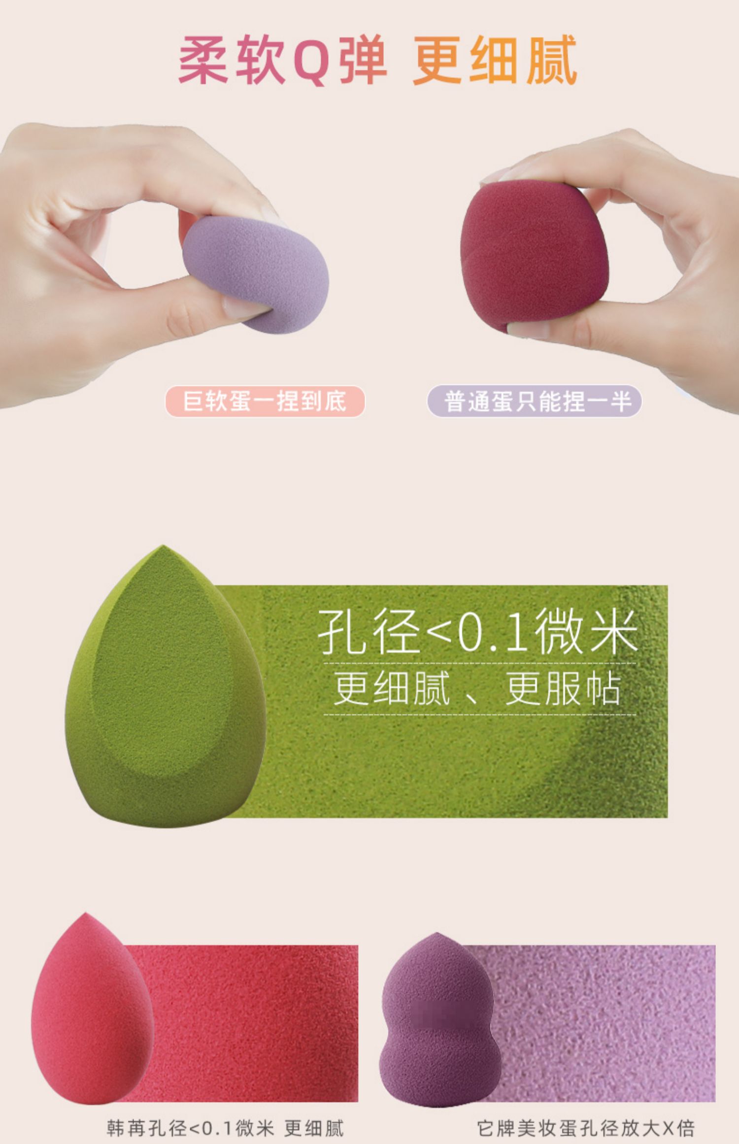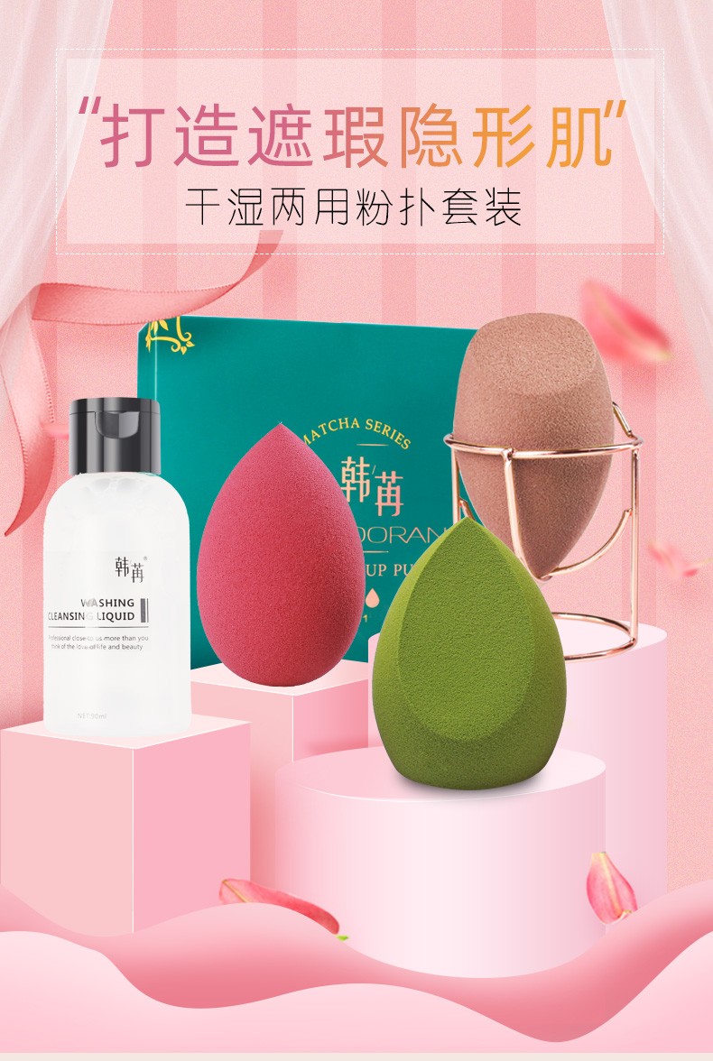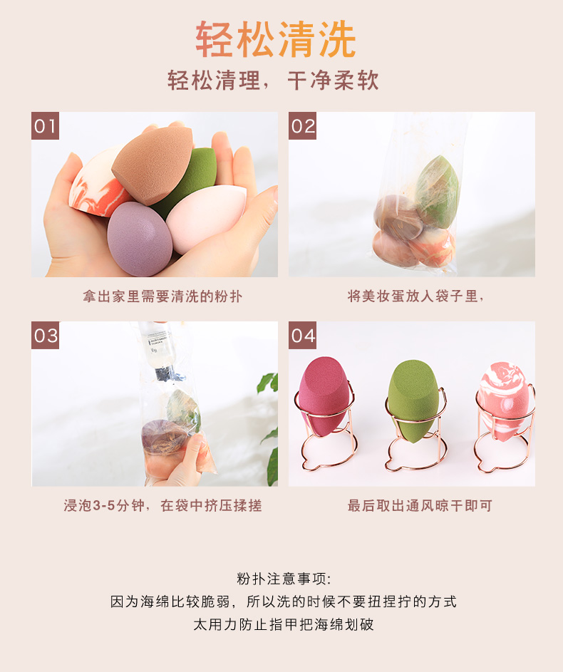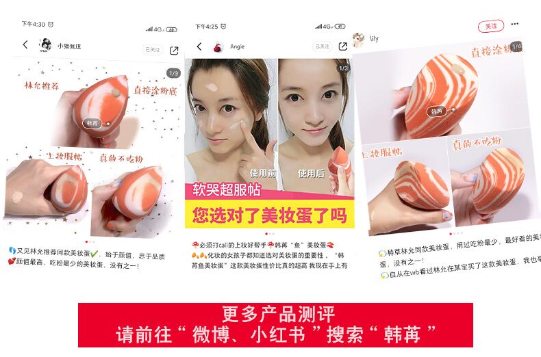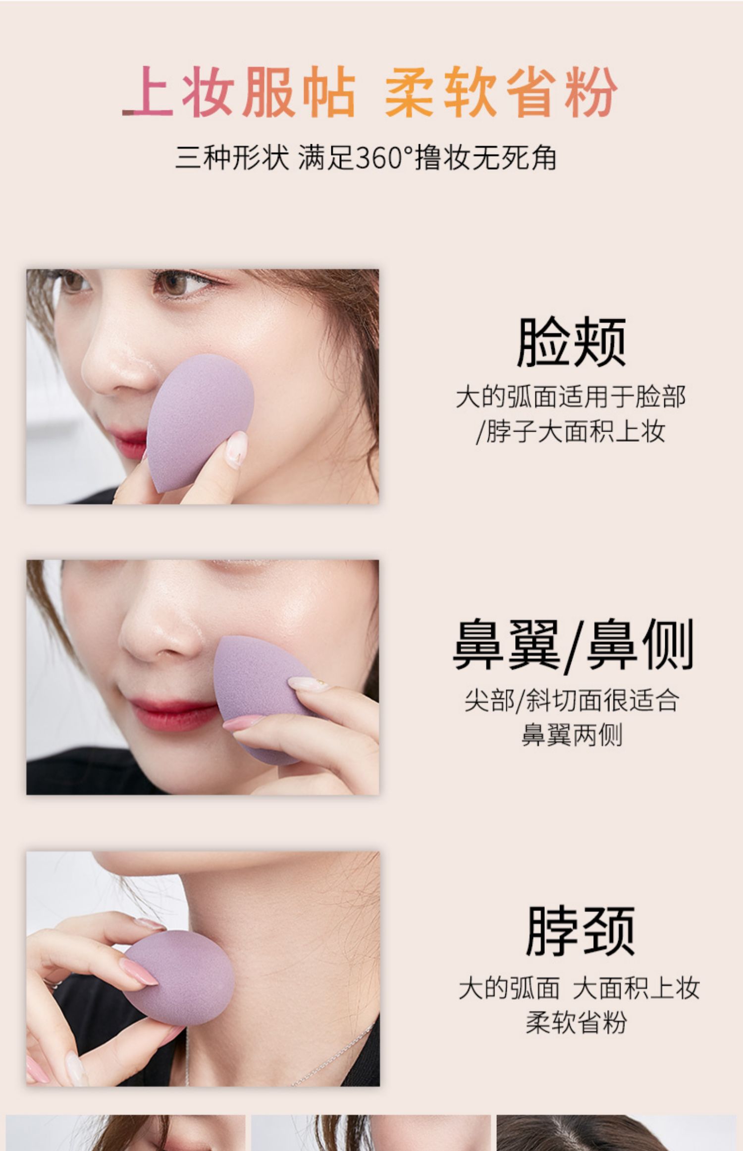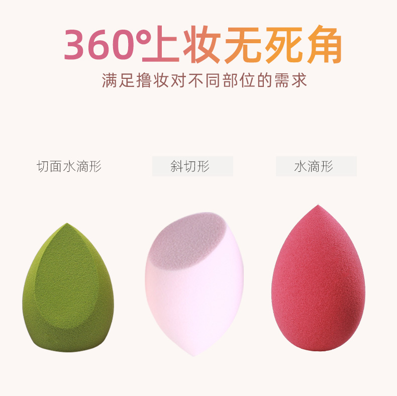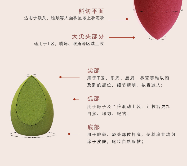 三种形状,满足360度撸妆无死角,大的弧面适用于脸部等大面积上妆,斜切面很适合鼻翼两侧,上脸亲肤柔软,满足不同部位的需求。