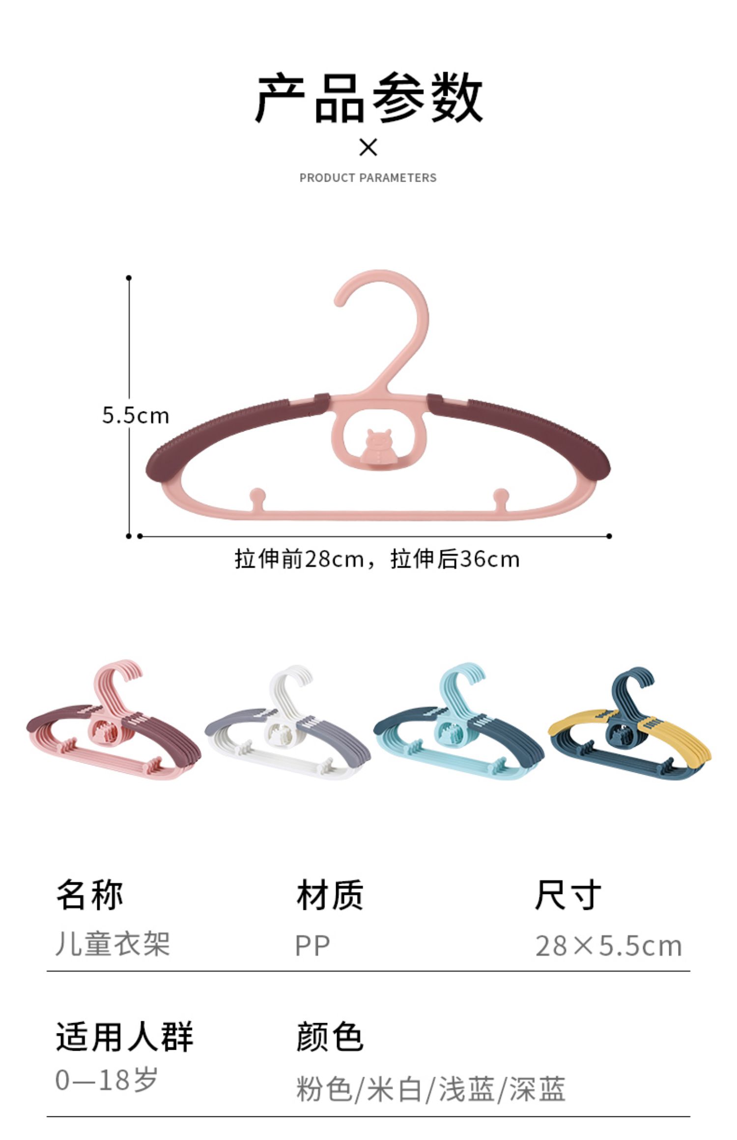创意简约儿童衣架,独特设计,简约风尚,合理三角,臂展可伸缩,一体成型,柔韧度强,七档伸缩,可根据宝宝的成长情况调节肩宽~