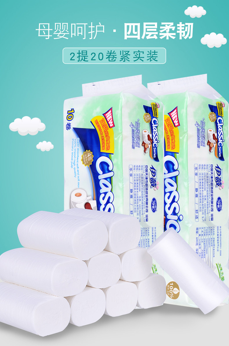 【各大超市有售!超值20卷!】4层亲肤柔厚,带给肌肤丝般享受,选取天然木浆,健康安全呵护全家,密实均匀,轻松撕取!超值!