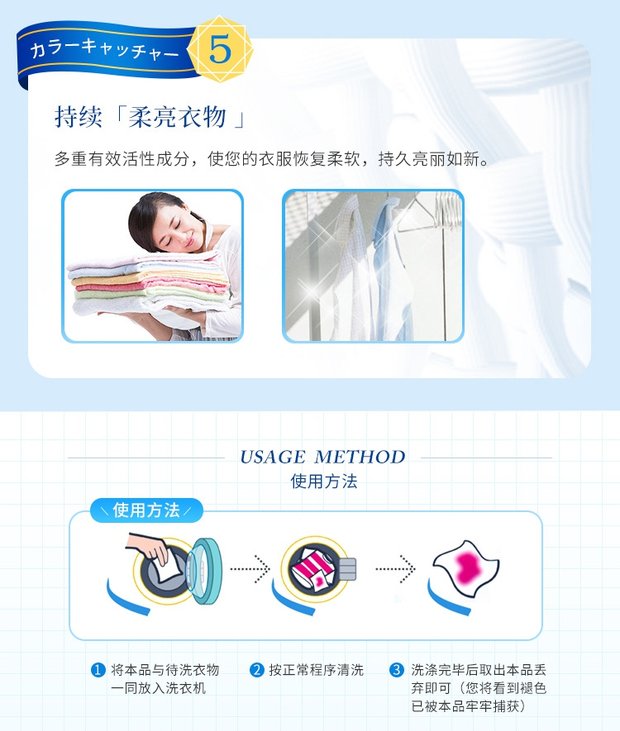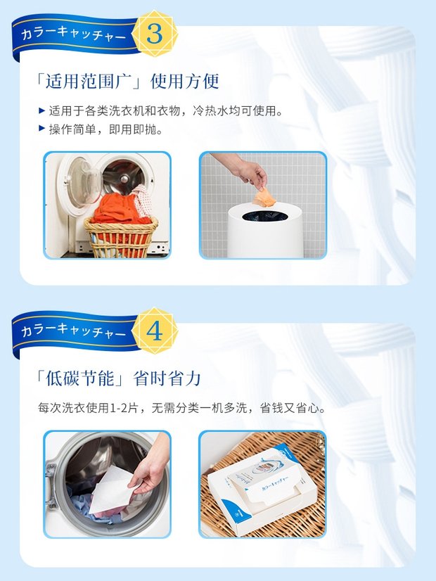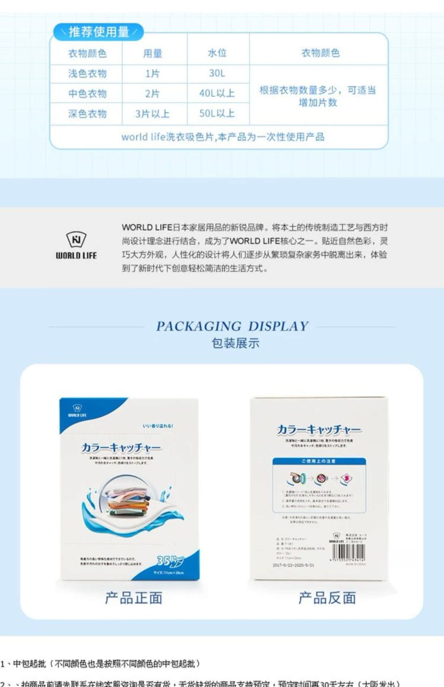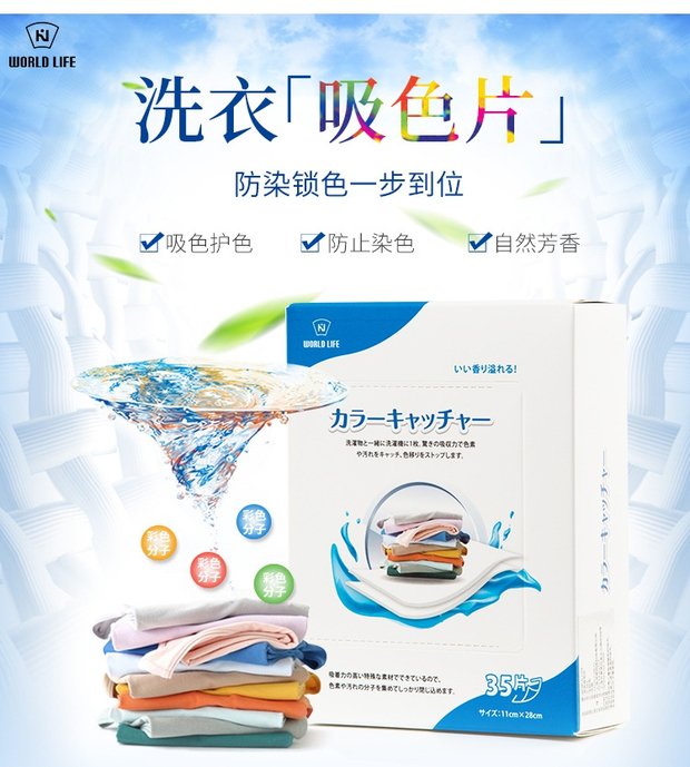 蜂窝网状结构,迅速吸收在清洗中产生的有机色素离子,和尘埃粒子,有效防止串色,有效吸附衣物上的荧光增白剂,使用方便,低碳节能,省时省力。