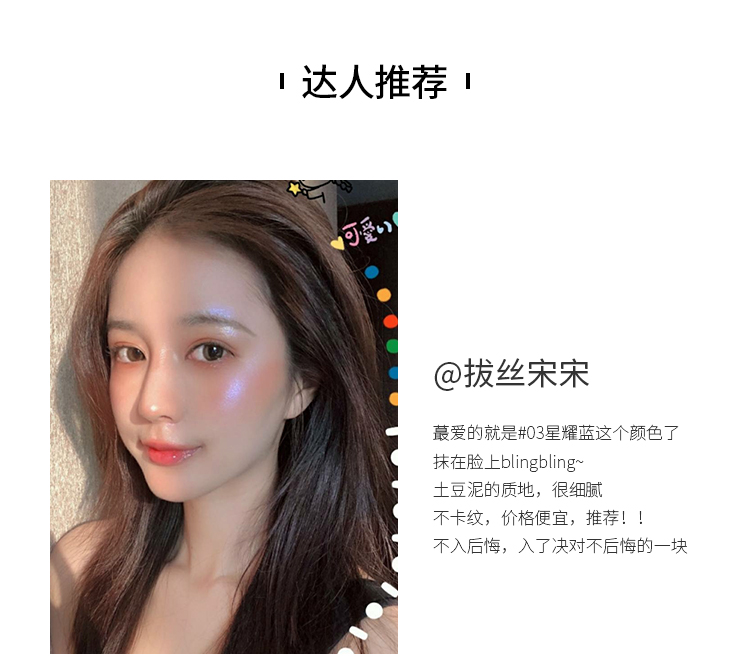 漫天闪耀,妹子必不可少的高光粉饼。5种颜色可选,众多达人都在种草的~让美不受限