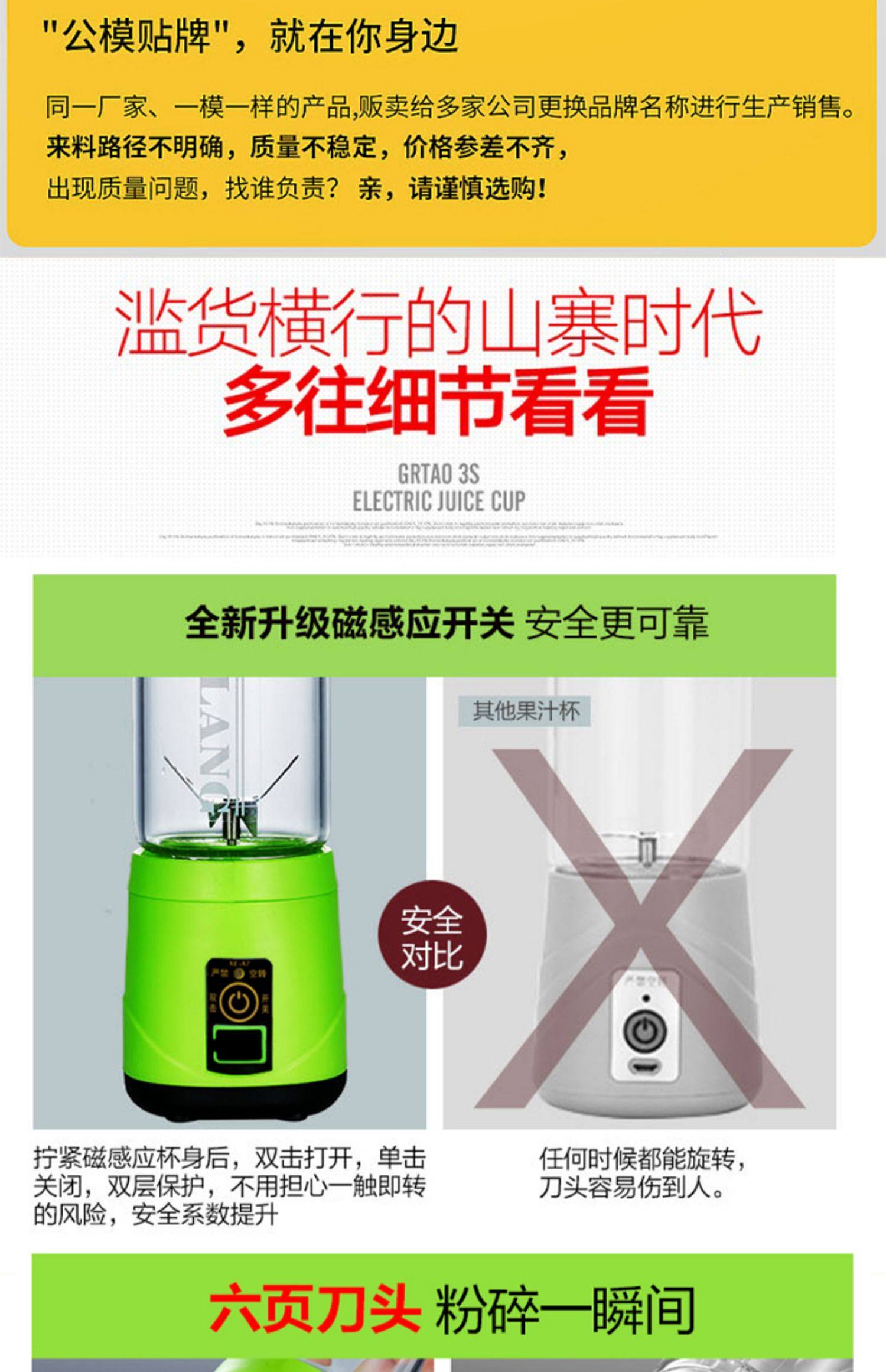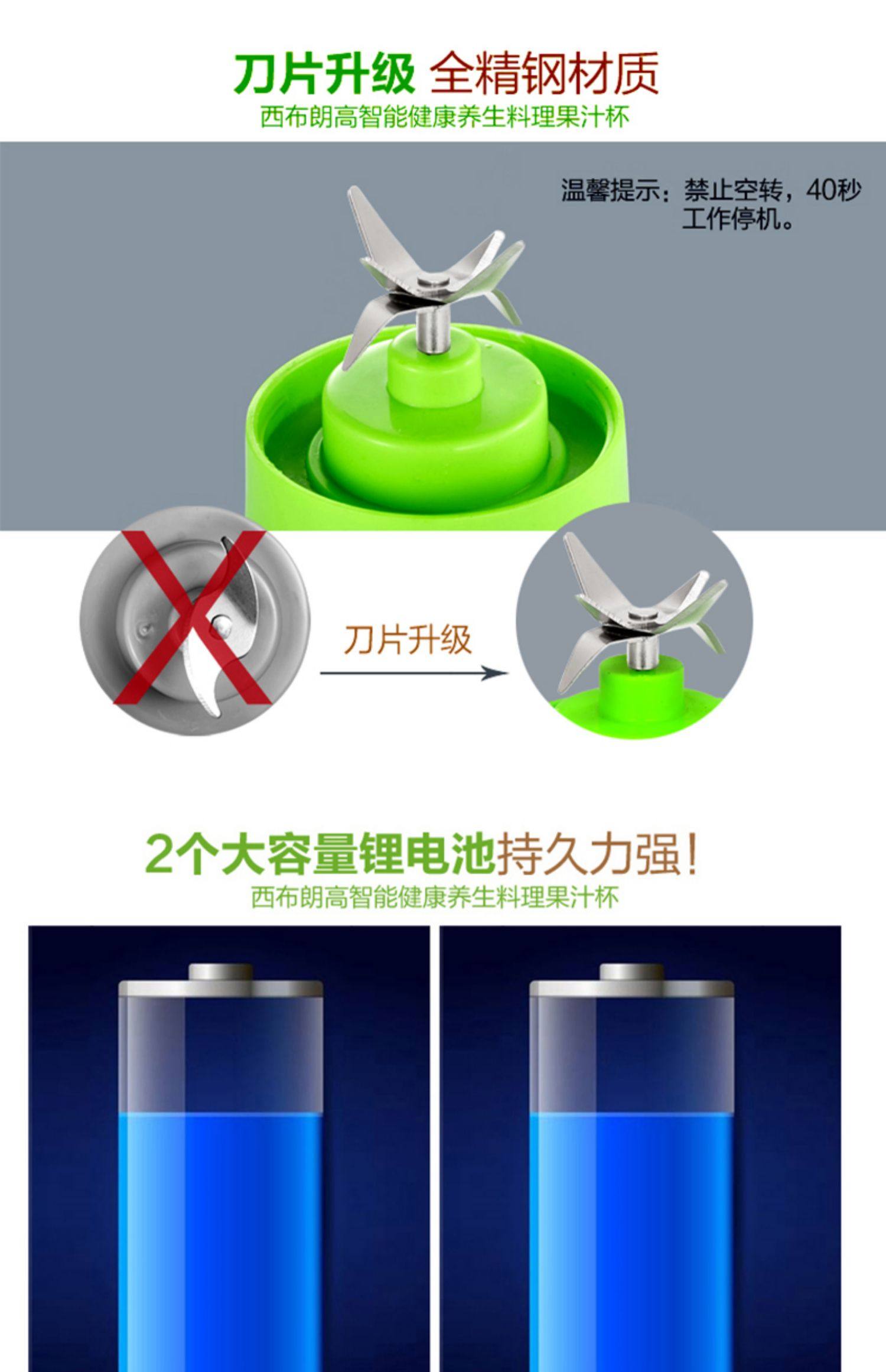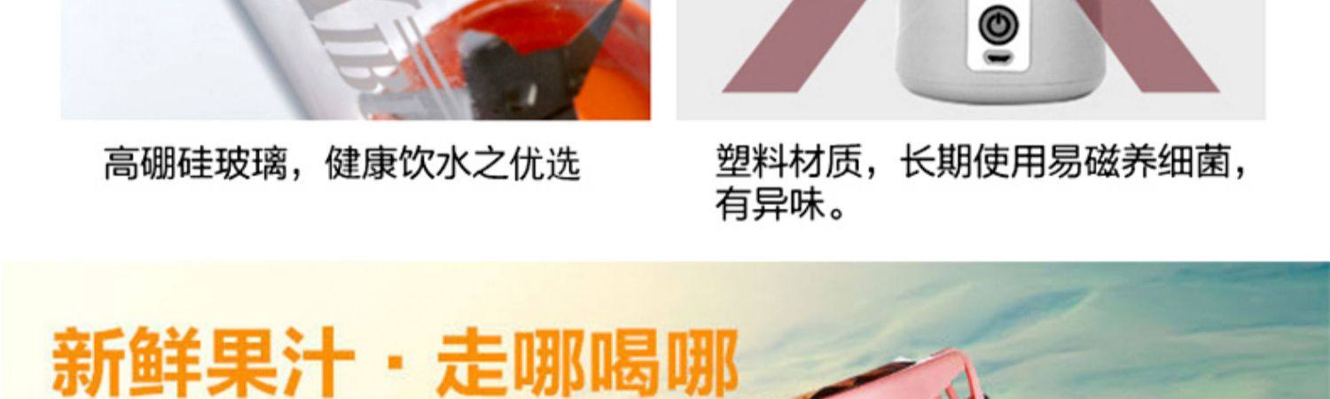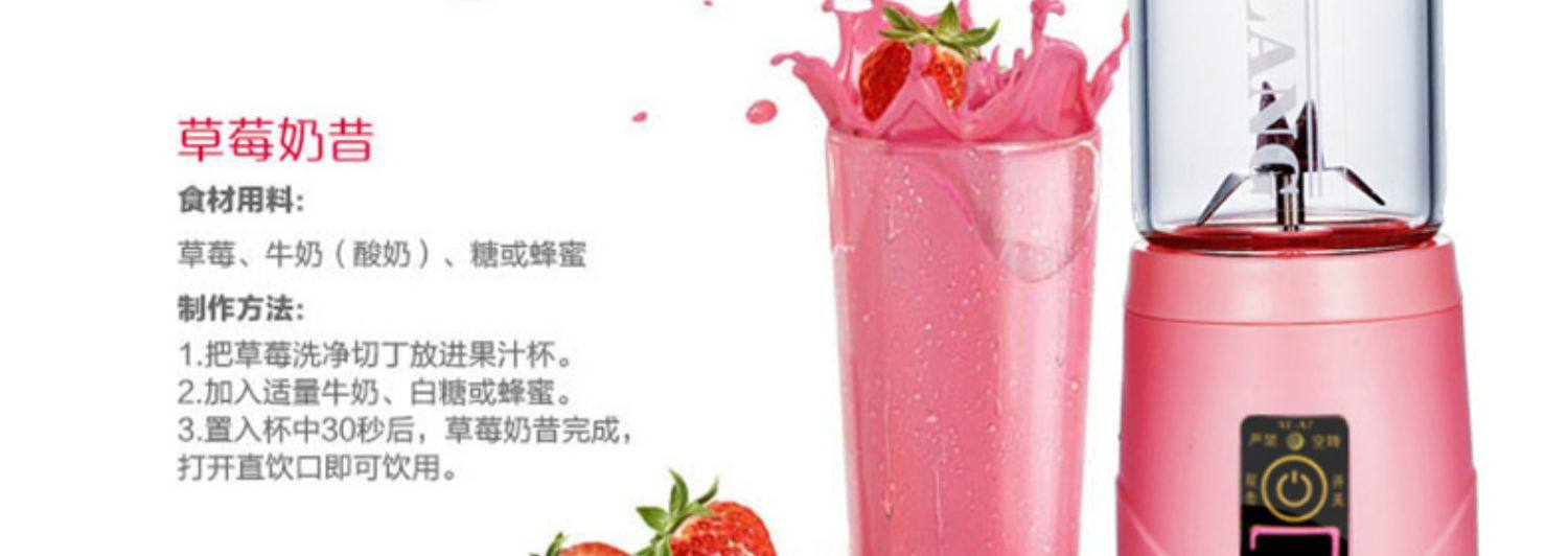 支持验货、7.4V大功率,便携冲电款,玻璃杯体,携带方便,可以不需要加水直接榨汁,随时随地想榨就榨,可以做榨果汁、制作奶昔,做宝宝辅食,多款颜色可选,五年包换,终身质保、送运费险