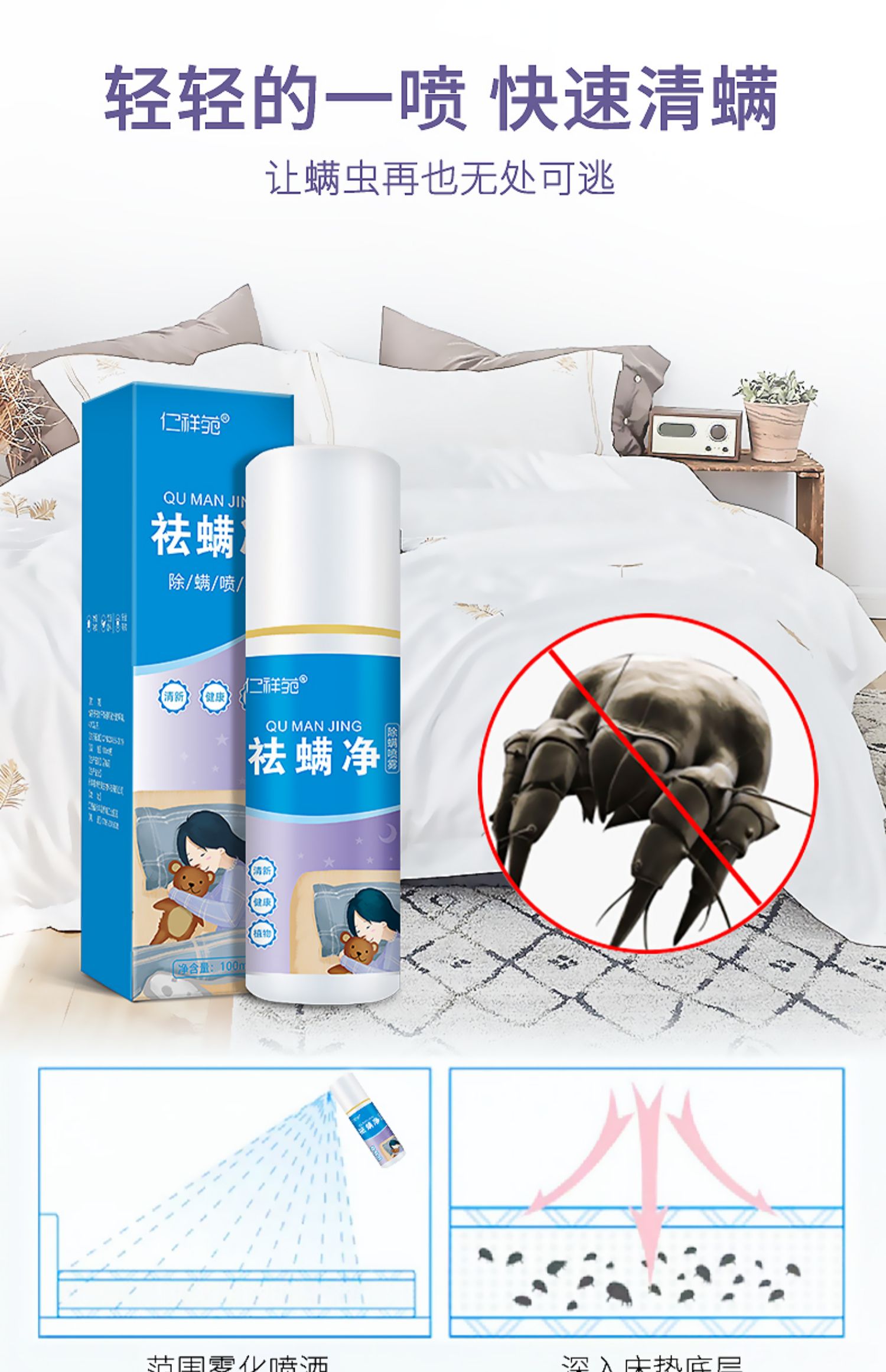 家用去螨虫神器床上用驱螨虫,草本植物精华,天然无刺激,孕妇、宝宝、宠物皆可使用。强效除螨、抑菌。解决螨虫带来的危害!