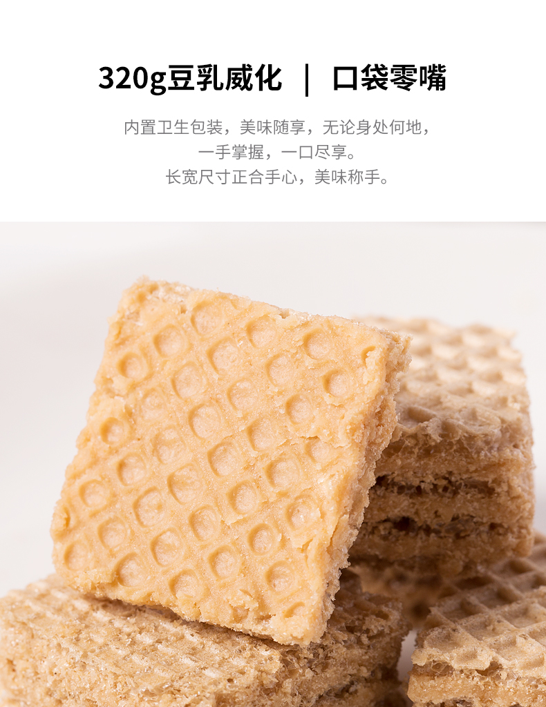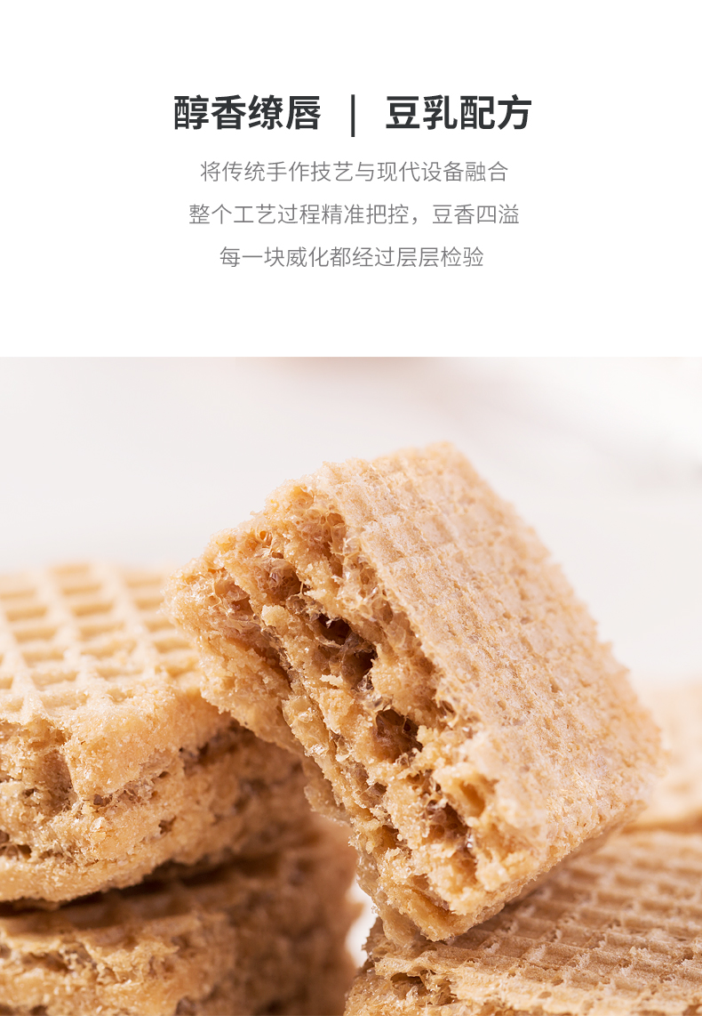 下单满减,豆乳味威化饼干,口感酥脆,醇正香甜。浓郁豆乳香气怡人,入口绵化,舌根回甘,尽解风情。